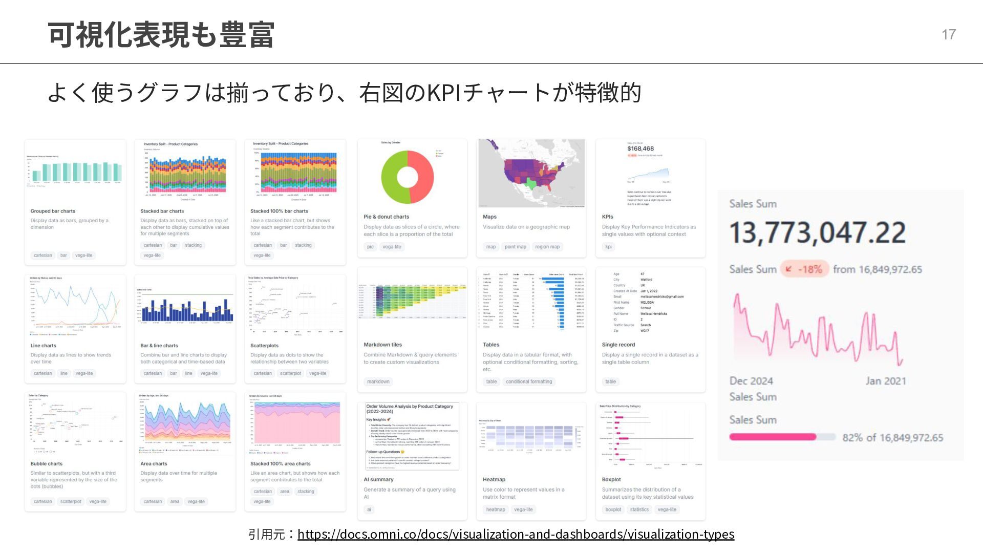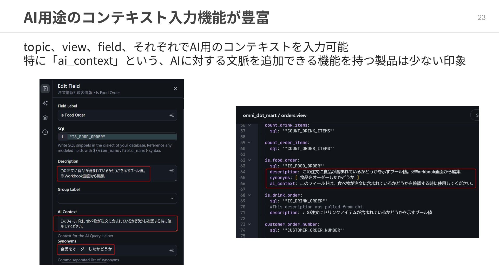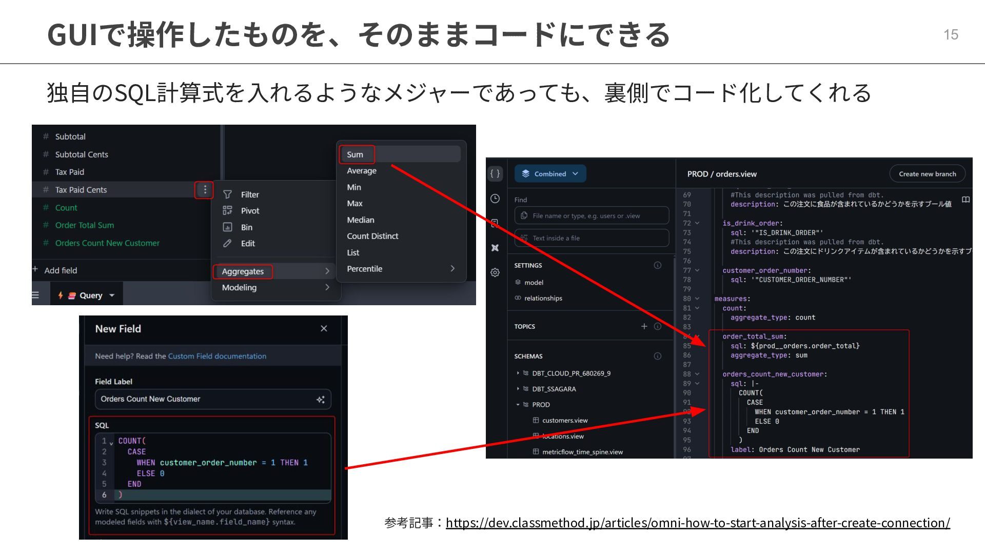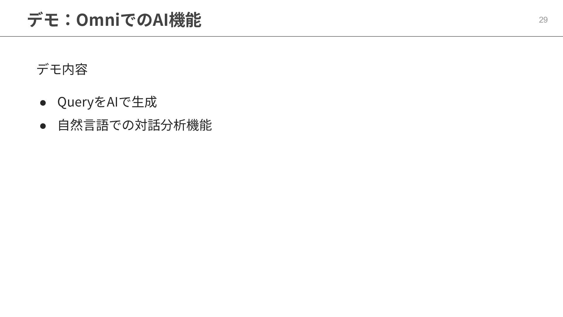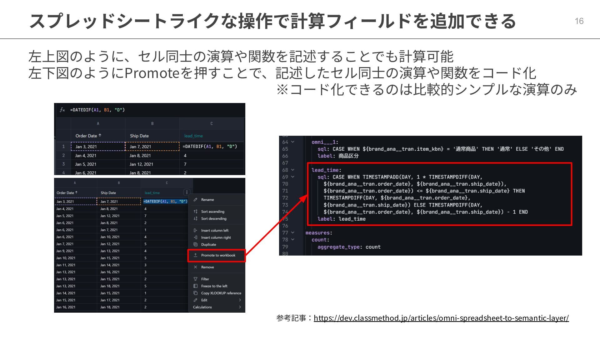 One側のテーブルのレコードが重複し集計値がずれてしまう現象を対策する機能 • Access filtersとAccess grants ◦ ユーザー属性を使⽤した、動的な⾏レベル‧列レベルセキュリティを設定できる機能 • Aggregate Awareness ⇛ 次⾴で紹介 ◦ 選択したフィールドに応じて、最適な粒度のテーブルに対して動的にクエリを発⾏する機能 • Content Validator ◦ ダッシュボードが参照するフィールド等の名称変更があったときに検知‧修正できる機能 • Embedded Analytics ◦ iframeベースの埋め込みが可能で、埋め込み先の認証情報を⽤いた 動的なOmniのユーザー作成&認証も可能(SSO embed)