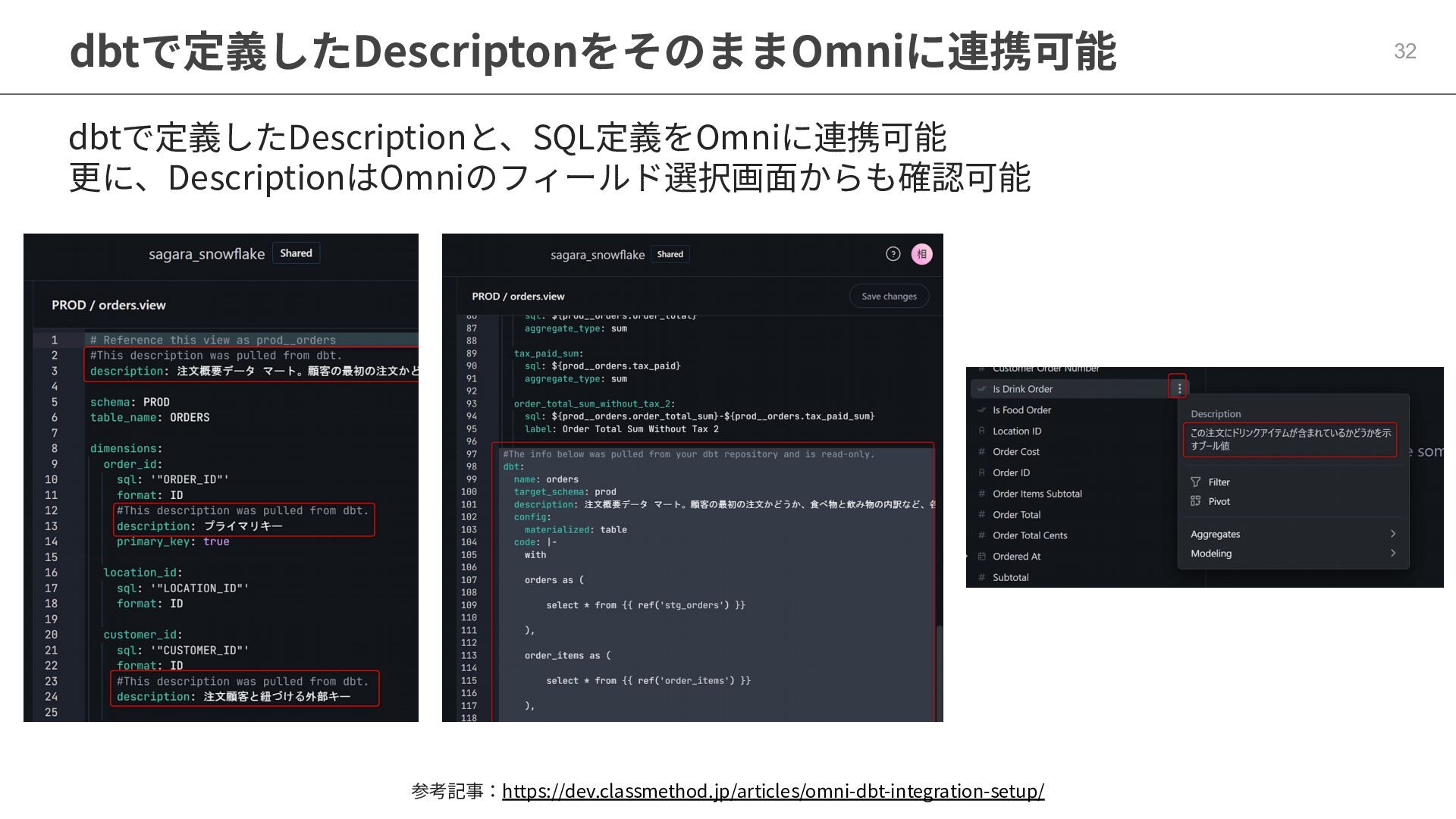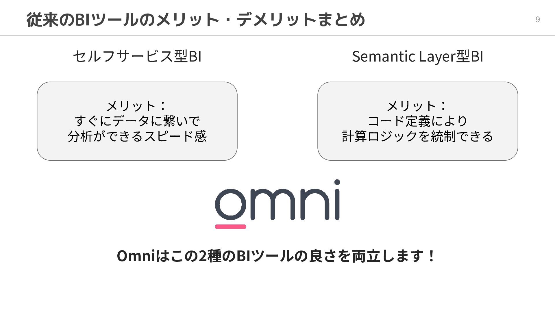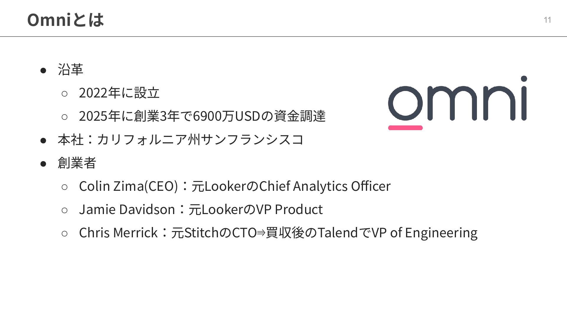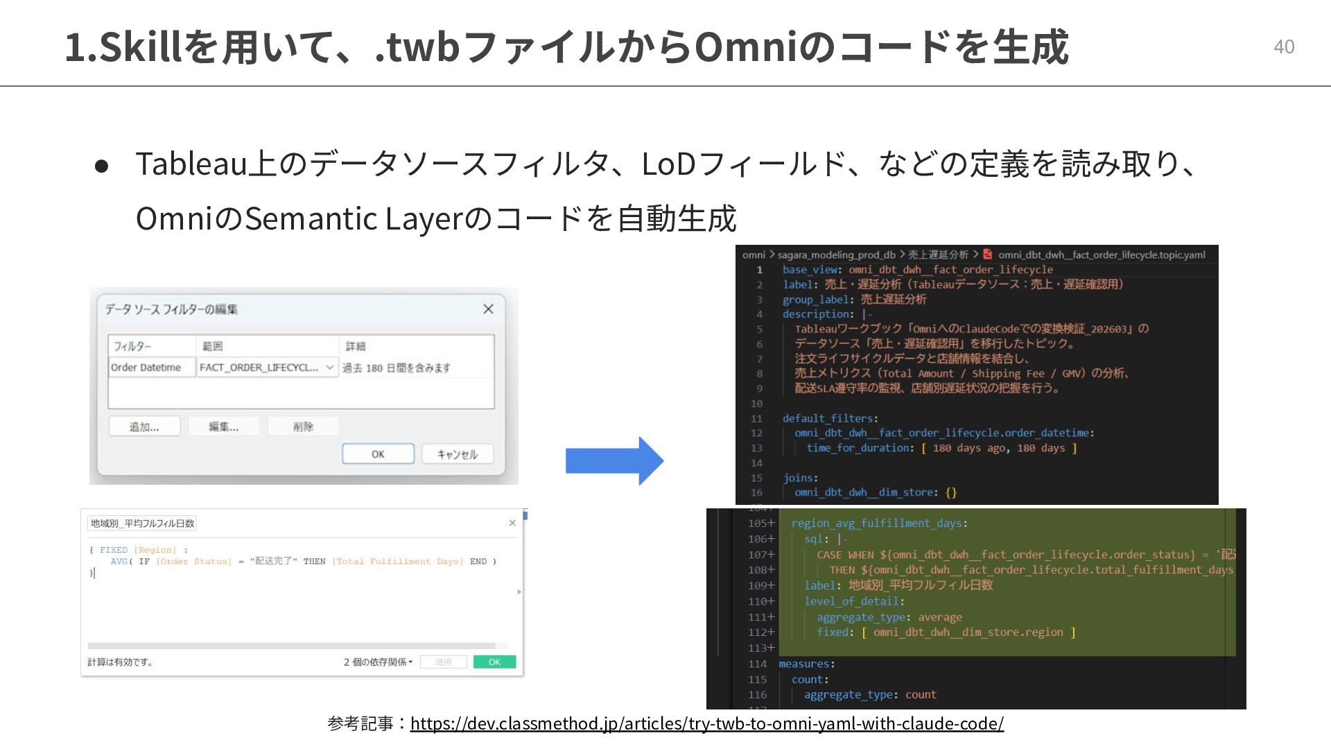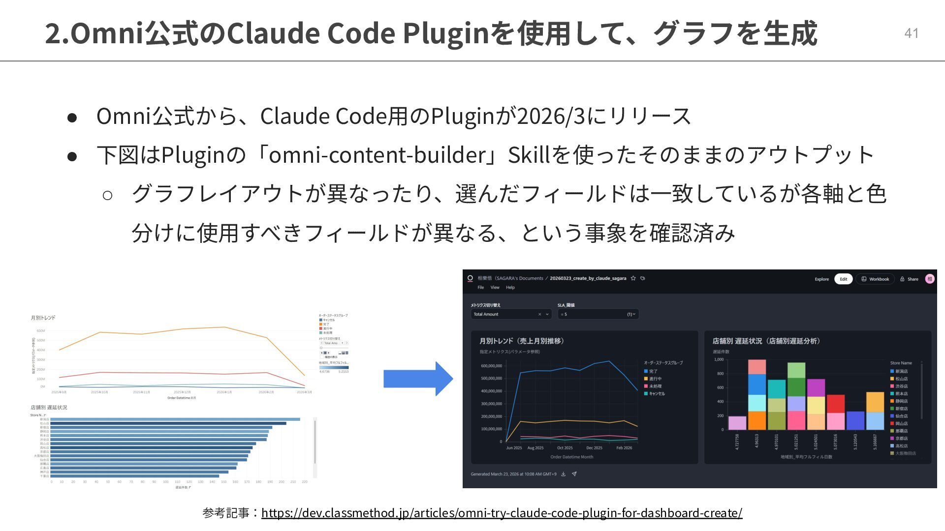 One側のテーブルのレコードが重複し集計値がずれてしまう現象を対策する機能 • Access filtersとAccess grants ◦ ユーザー属性を使⽤した、動的な⾏レベル‧列レベルセキュリティを設定できる機能 • Aggregate Awareness ⇛ 次⾴で紹介 ◦ 選択したフィールドに応じて、最適な粒度のテーブルに対して動的にクエリを発⾏する機能 • Content Validator ◦ ダッシュボードが参照するフィールド等の名称変更があったときに検知‧修正できる機能 • Embedded Analytics ◦ iframeベースの埋め込みが可能で、埋め込み先の認証情報を⽤いた 動的なOmniのユーザー作成&認証も可能(SSO embed)