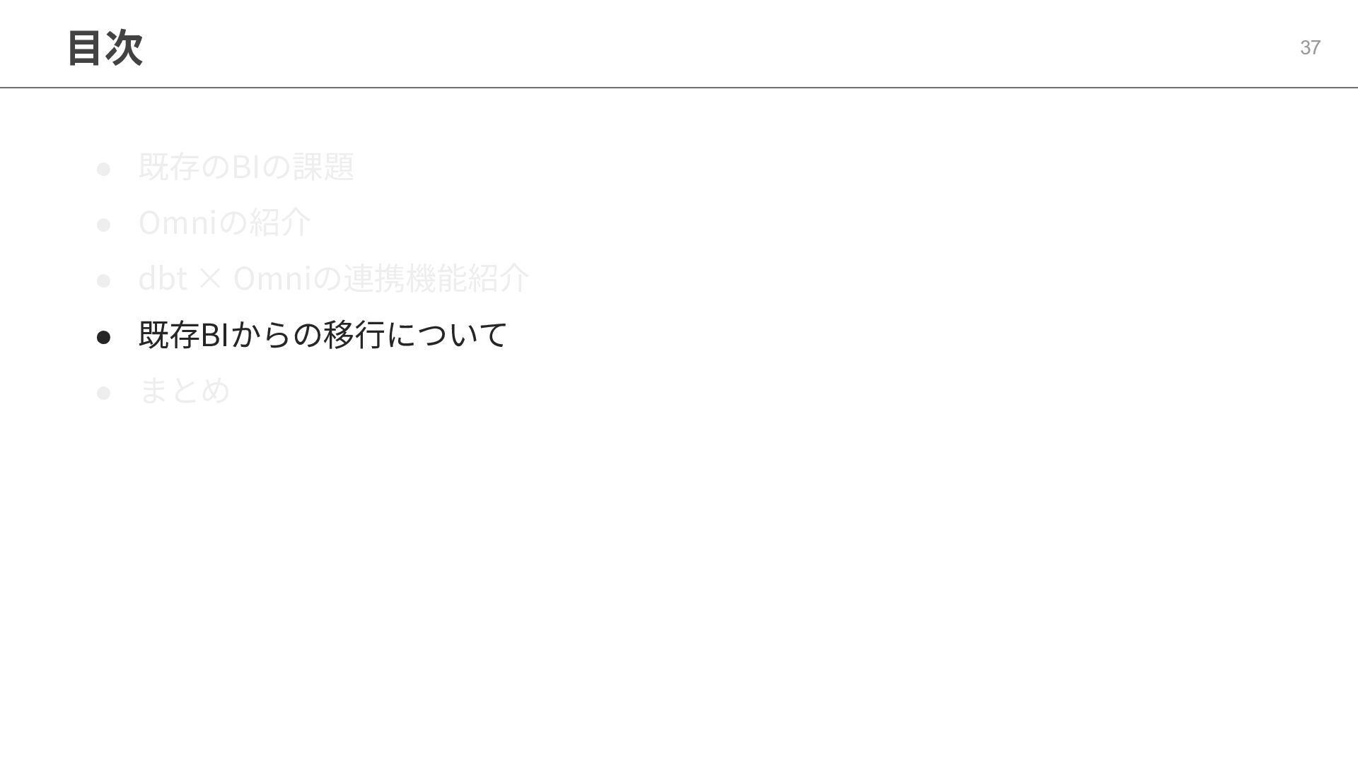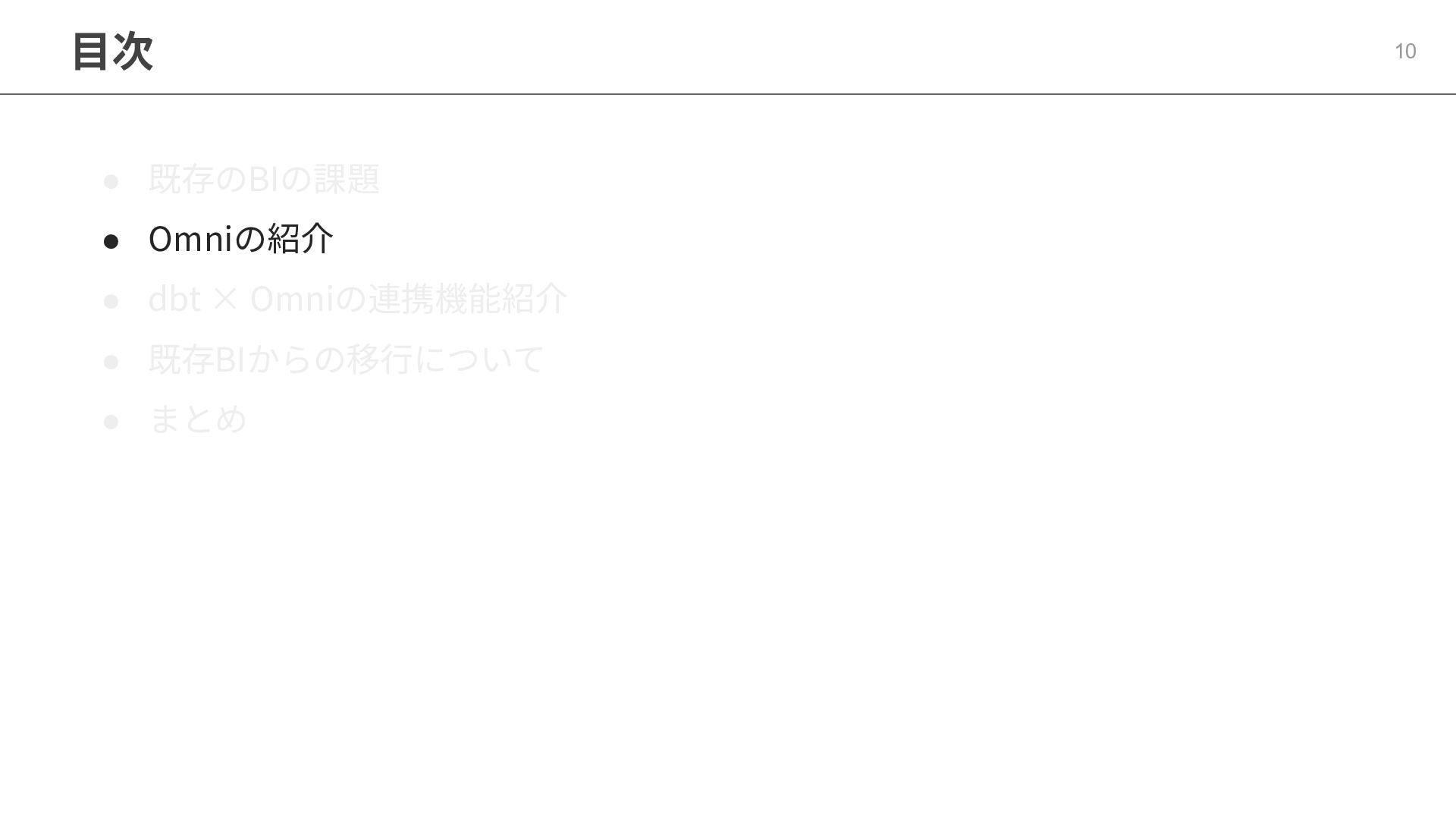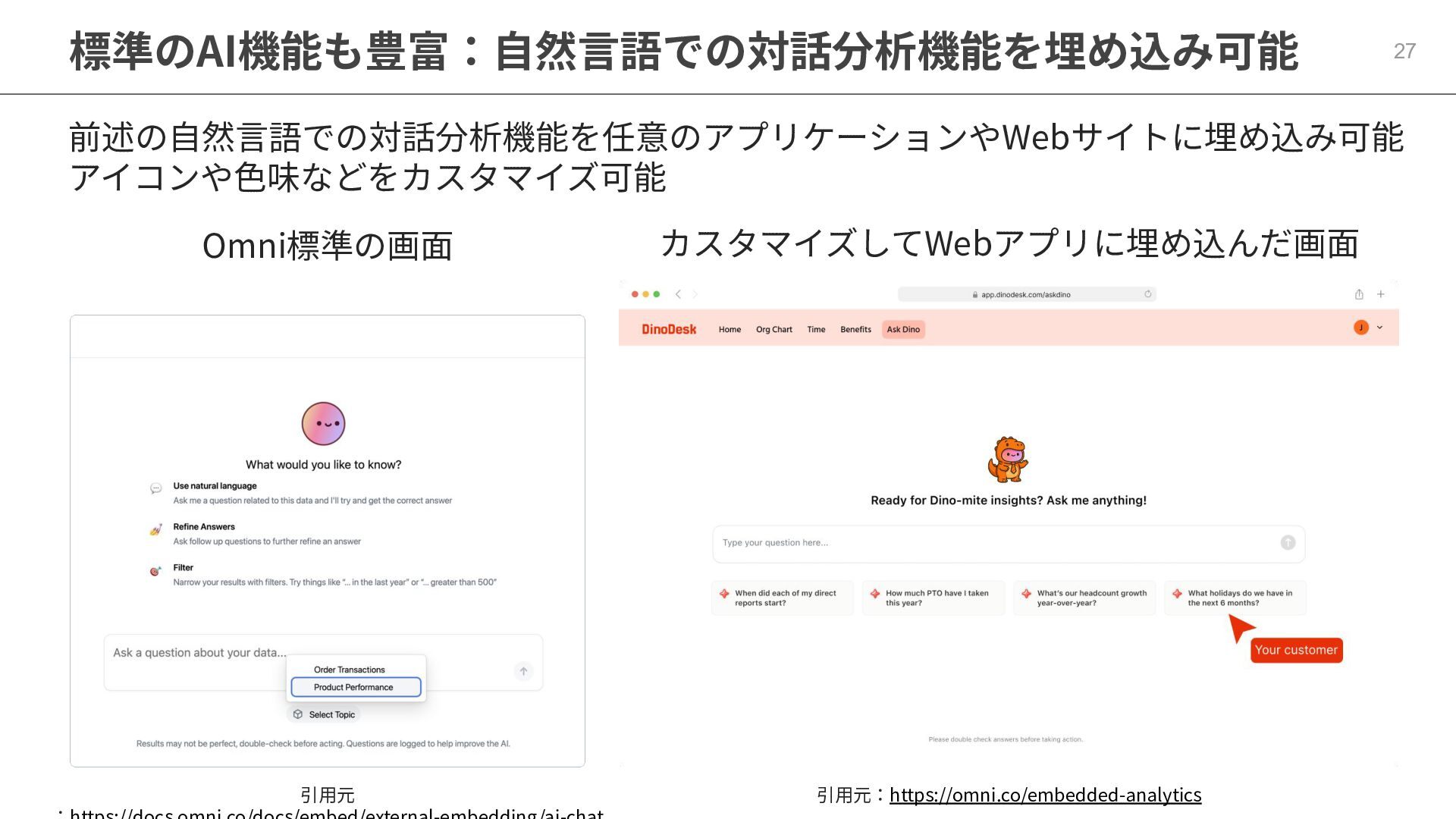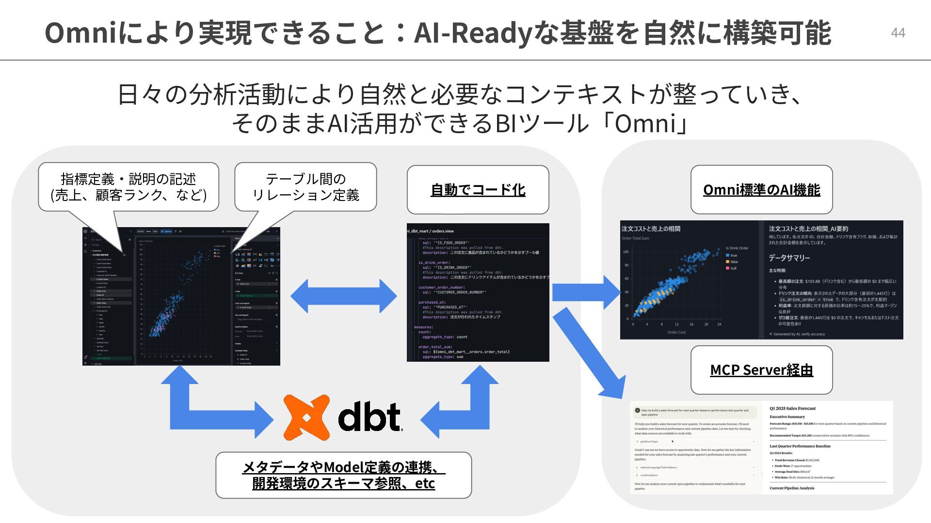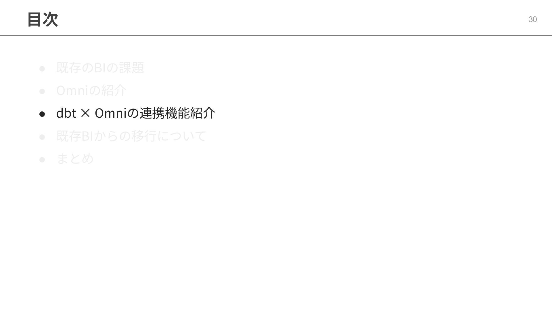 One側のテーブルのレコードが重複し集計値がずれてしまう現象を対策する機能 • Access filtersとAccess grants ◦ ユーザー属性を使⽤した、動的な⾏レベル‧列レベルセキュリティを設定できる機能 • Aggregate Awareness ⇛ 次⾴で紹介 ◦ 選択したフィールドに応じて、最適な粒度のテーブルに対して動的にクエリを発⾏する機能 • Content Validator ◦ ダッシュボードが参照するフィールド等の名称変更があったときに検知‧修正できる機能 • Embedded Analytics ◦ iframeベースの埋め込みが可能で、埋め込み先の認証情報を⽤いた 動的なOmniのユーザー作成&認証も可能(SSO embed)