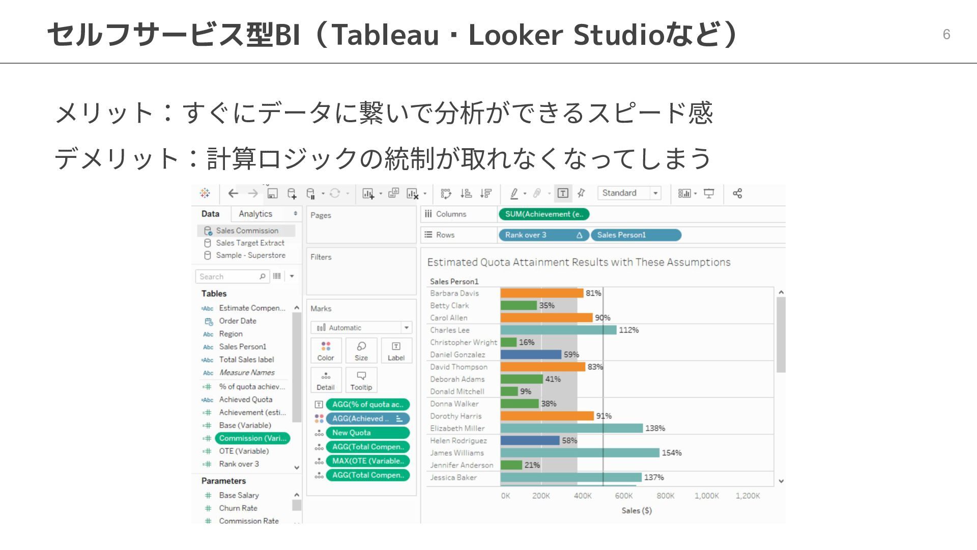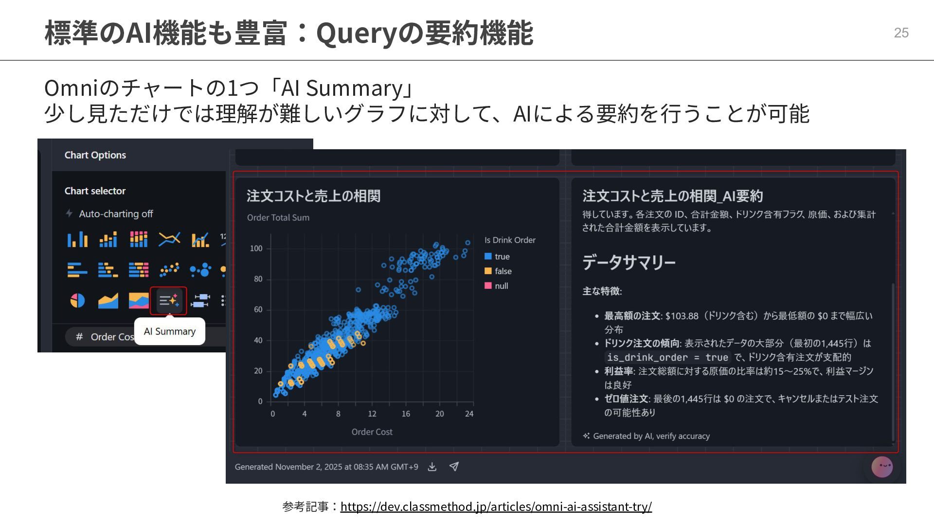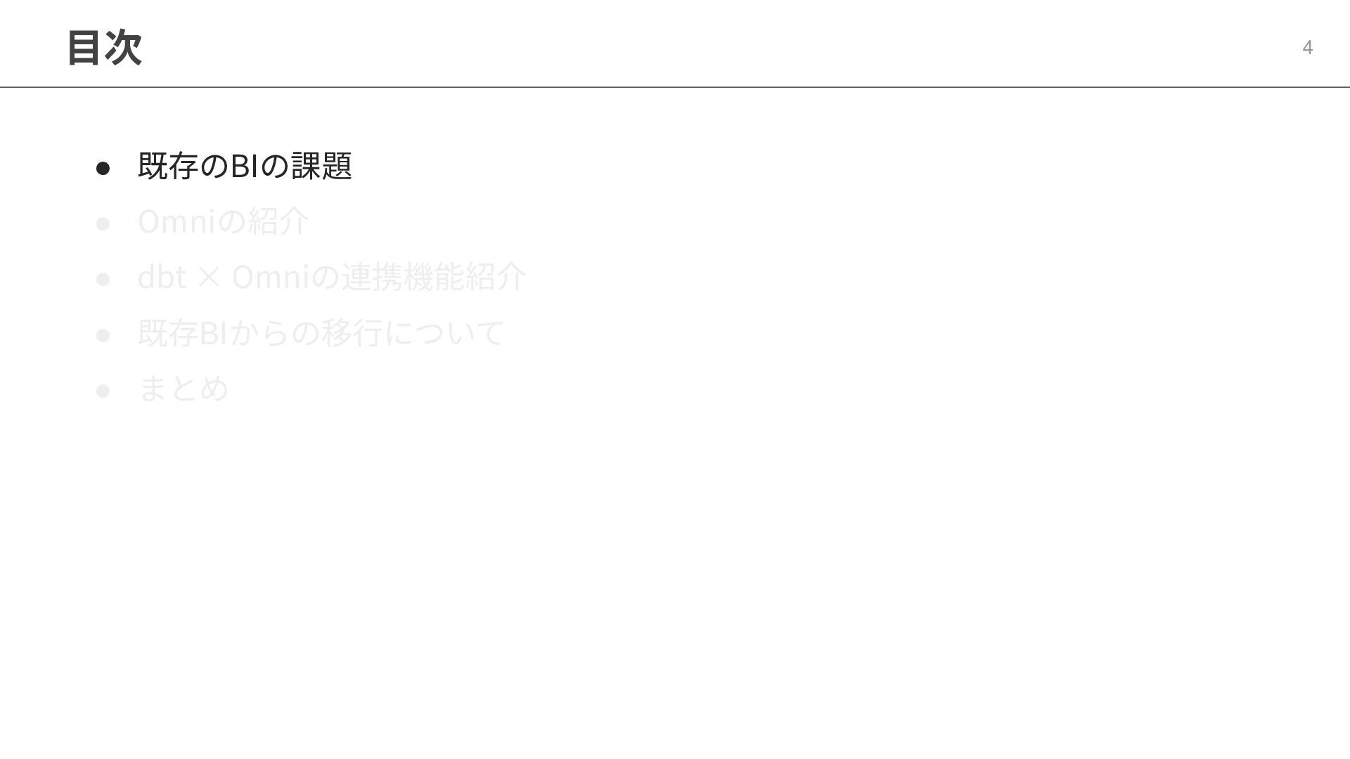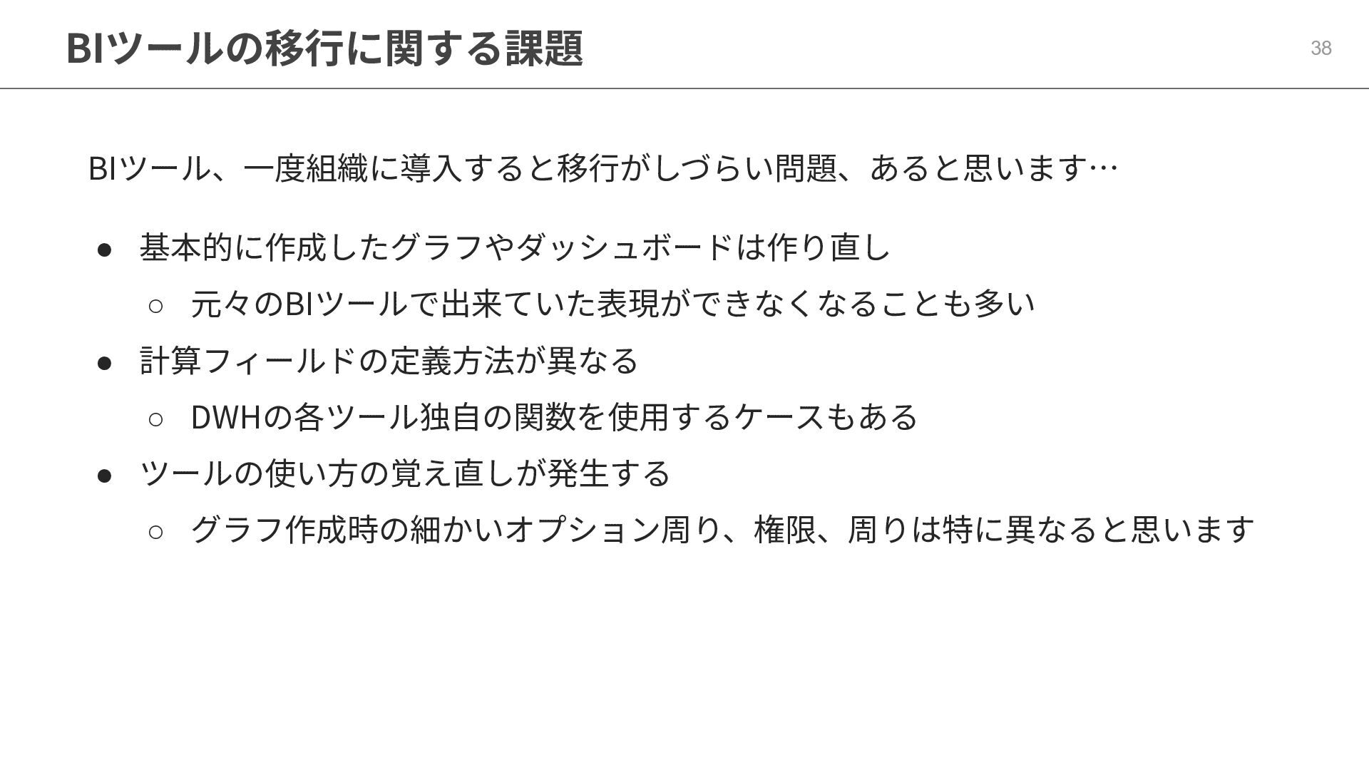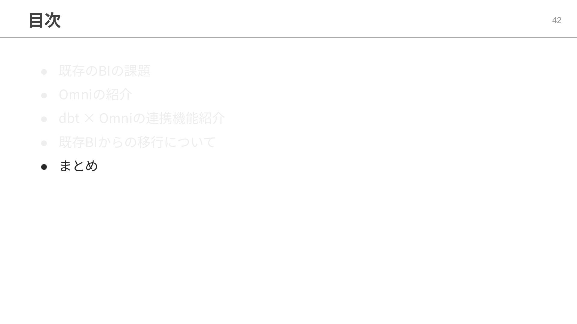 One側のテーブルのレコードが重複し集計値がずれてしまう現象を対策する機能 • Access filtersとAccess grants ◦ ユーザー属性を使⽤した、動的な⾏レベル‧列レベルセキュリティを設定できる機能 • Aggregate Awareness ⇛ 次⾴で紹介 ◦ 選択したフィールドに応じて、最適な粒度のテーブルに対して動的にクエリを発⾏する機能 • Content Validator ◦ ダッシュボードが参照するフィールド等の名称変更があったときに検知‧修正できる機能 • Embedded Analytics ◦ iframeベースの埋め込みが可能で、埋め込み先の認証情報を⽤いた 動的なOmniのユーザー作成&認証も可能(SSO embed)