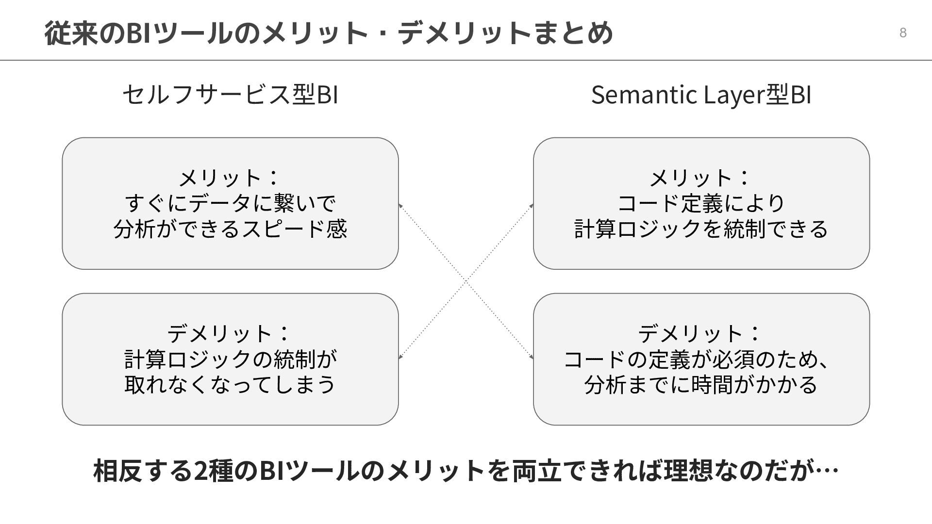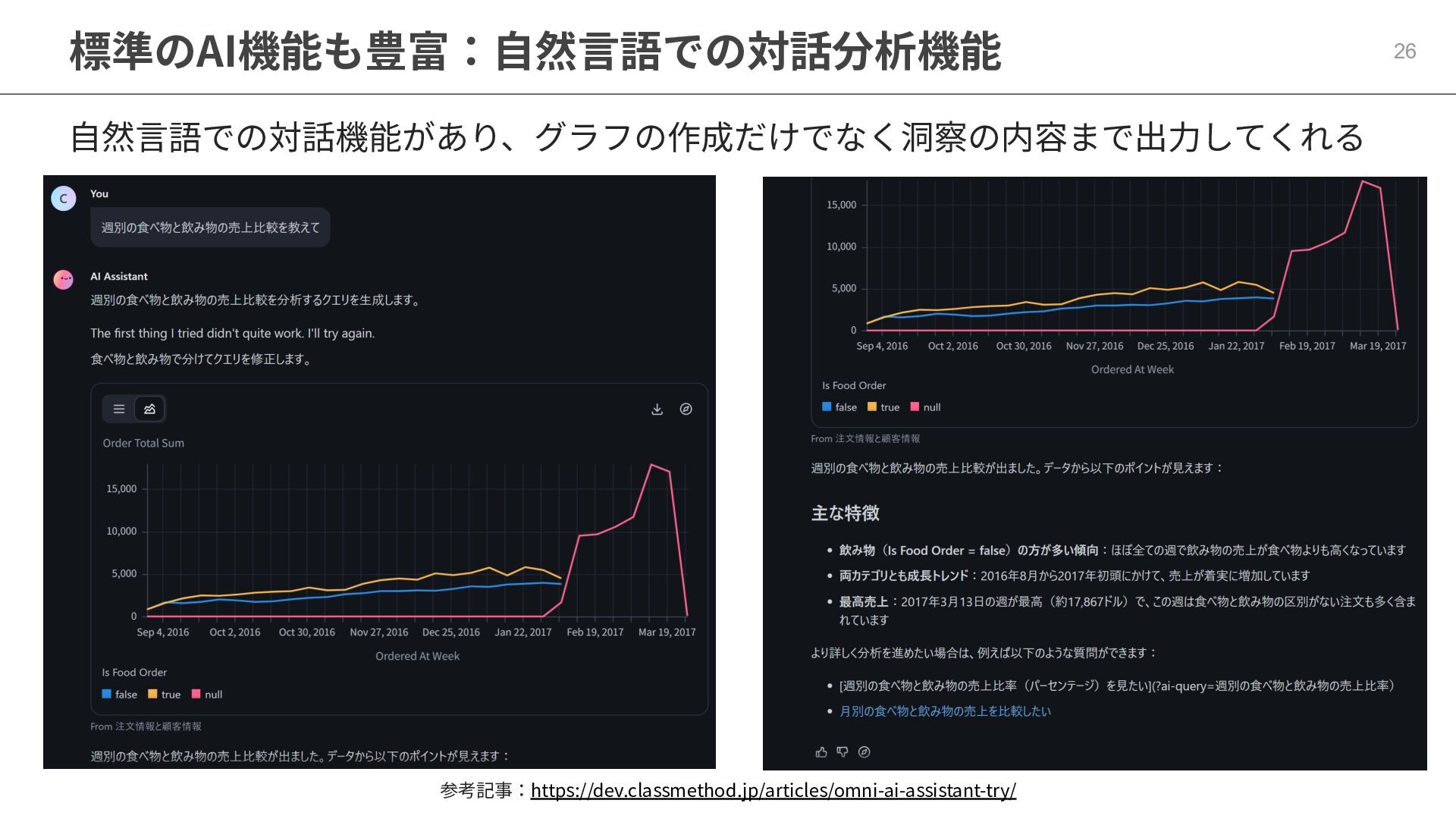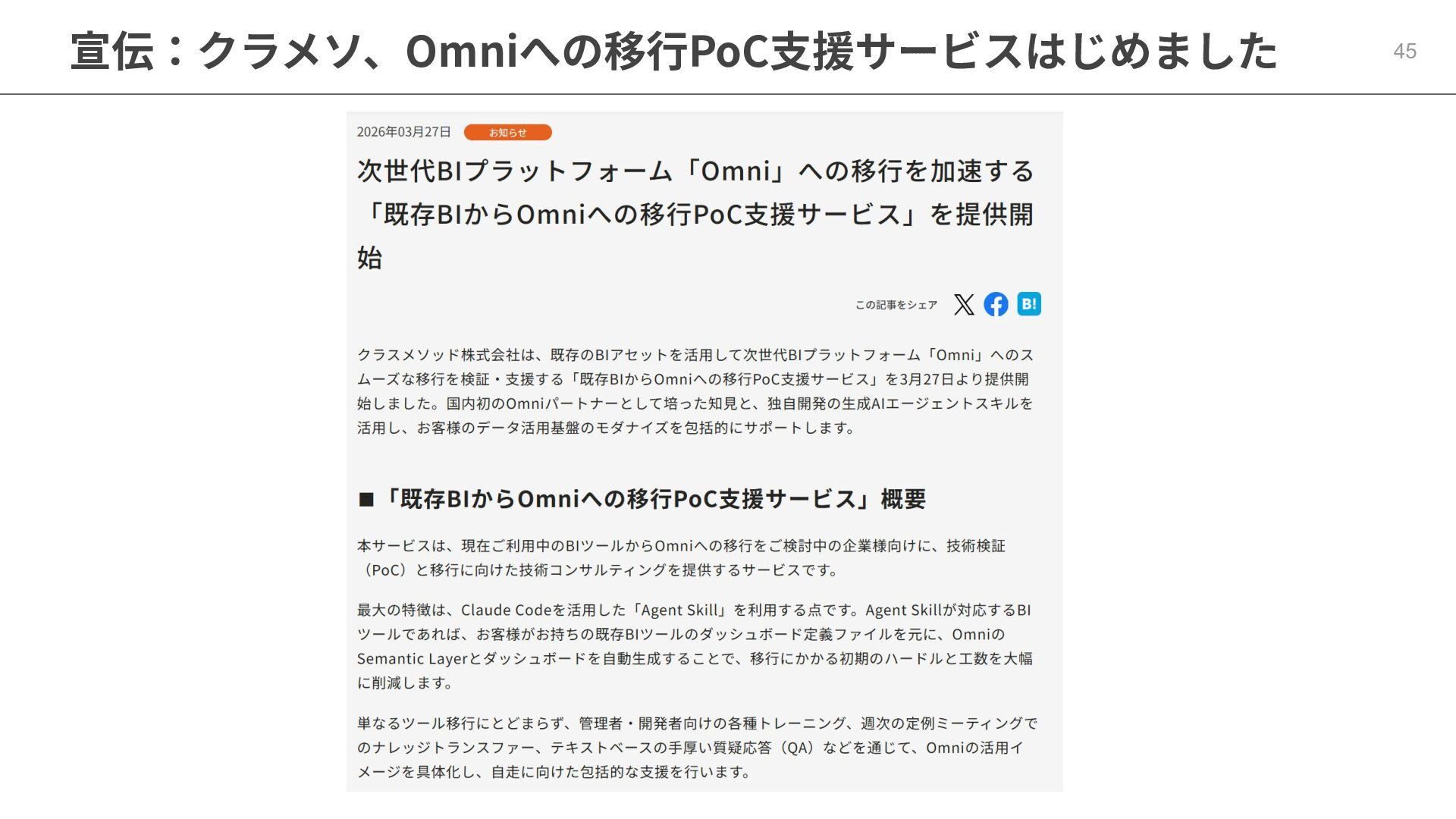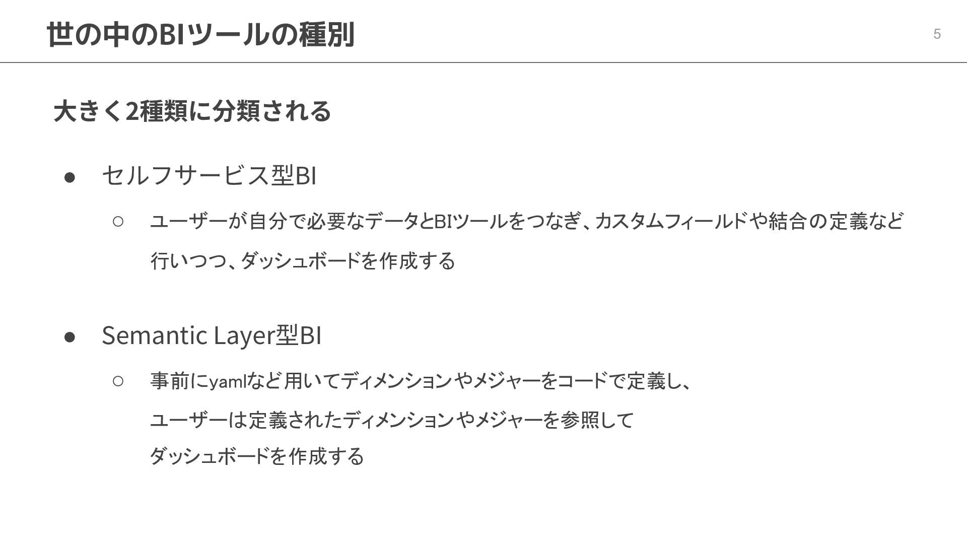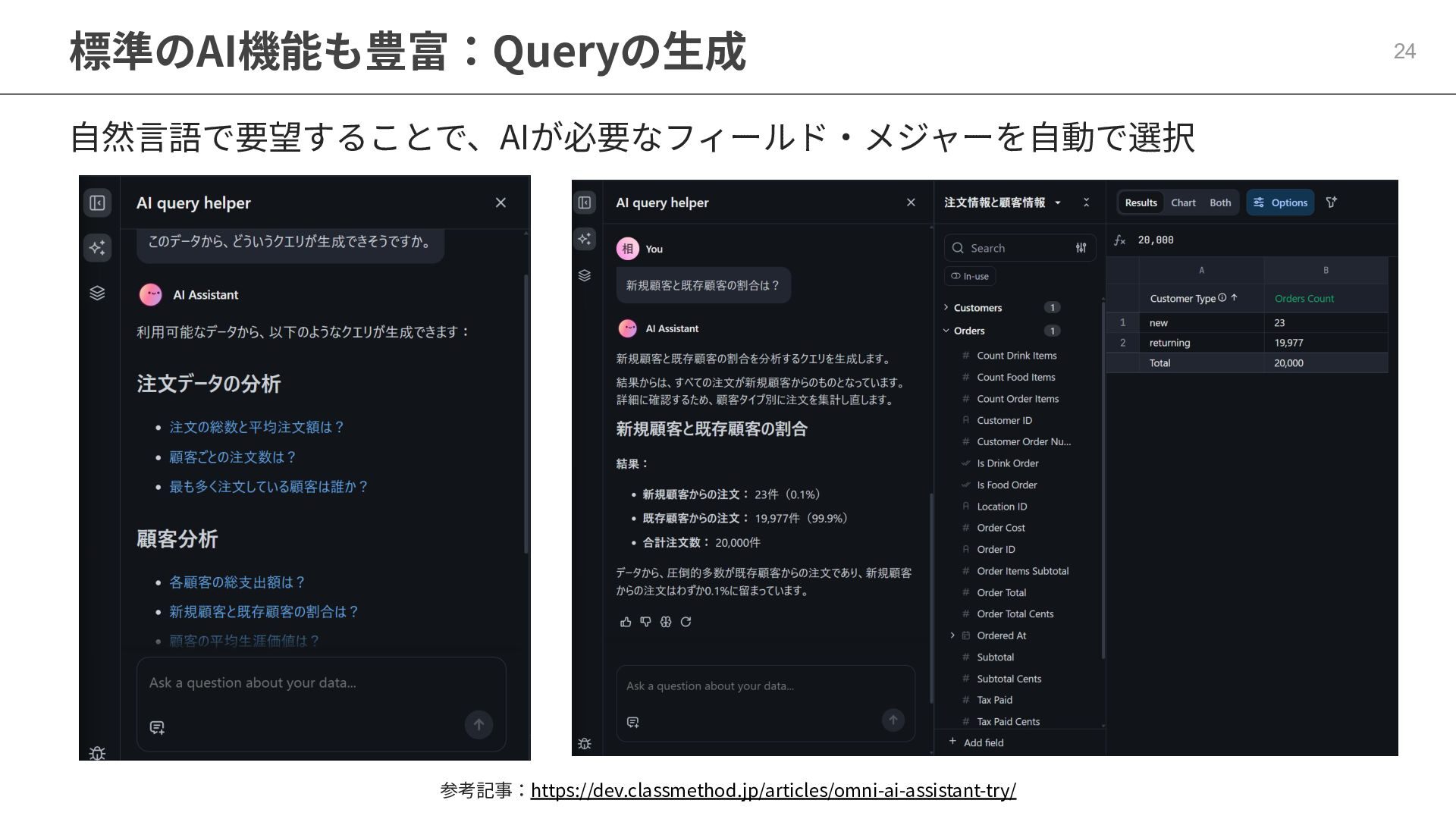 One側のテーブルのレコードが重複し集計値がずれてしまう現象を対策する機能 • Access filtersとAccess grants ◦ ユーザー属性を使⽤した、動的な⾏レベル‧列レベルセキュリティを設定できる機能 • Aggregate Awareness ⇛ 次⾴で紹介 ◦ 選択したフィールドに応じて、最適な粒度のテーブルに対して動的にクエリを発⾏する機能 • Content Validator ◦ ダッシュボードが参照するフィールド等の名称変更があったときに検知‧修正できる機能 • Embedded Analytics ◦ iframeベースの埋め込みが可能で、埋め込み先の認証情報を⽤いた 動的なOmniのユーザー作成&認証も可能(SSO embed)