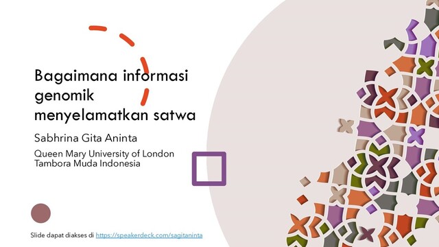 di penangkaran? • Apakah populasi M akan bertahan 100 tahun mendatang? • Apakah populasi spesies X di lokasi T sama dengan di lokasi U? • Apa dampak melepas individu A di lokasi X? Aplikasi ilmu genetika untuk membantu konservasi biodiversitas Bagaimana informasi genomik menyelamatkan satwa. Sabhrina Gita Aninta - Webinar Kelawar, Juli 2020