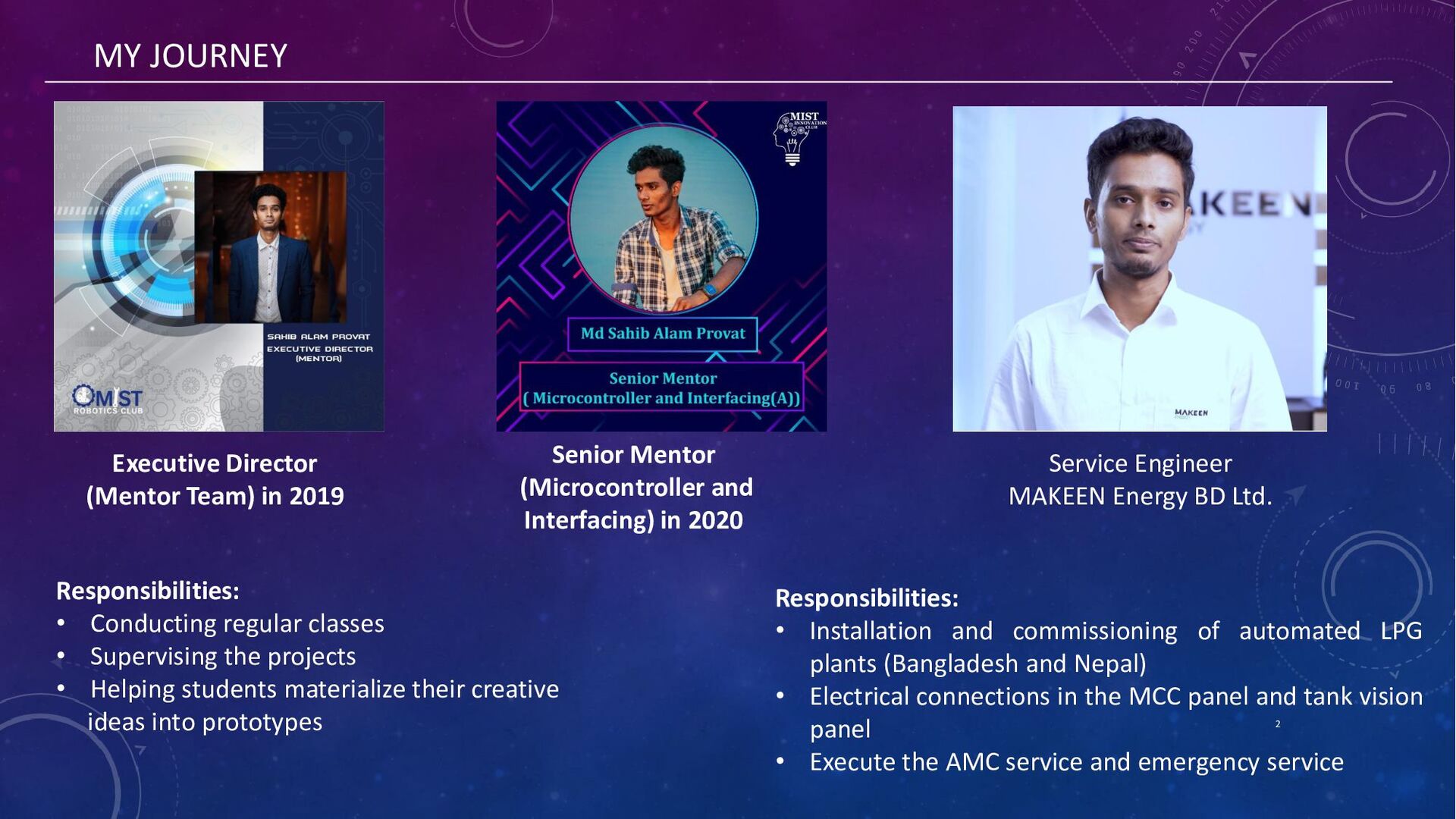 Mentor (Microcontroller and Interfacing) in 2020 Responsibilities: • Conducting regular classes • Supervising the projects • Helping students materialize their creative ideas into prototypes Service Engineer MAKEEN Energy BD Ltd. Responsibilities: • Installation and commissioning of automated LPG plants (Bangladesh and Nepal) • Electrical connections in the MCC panel and tank vision panel • Execute the AMC service and emergency service