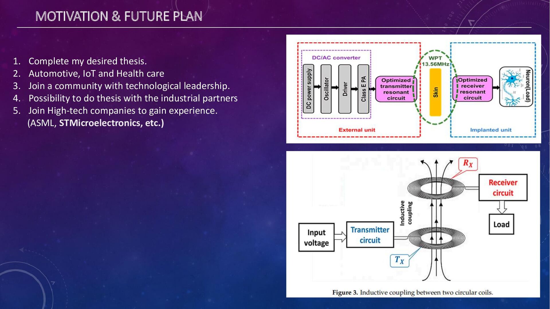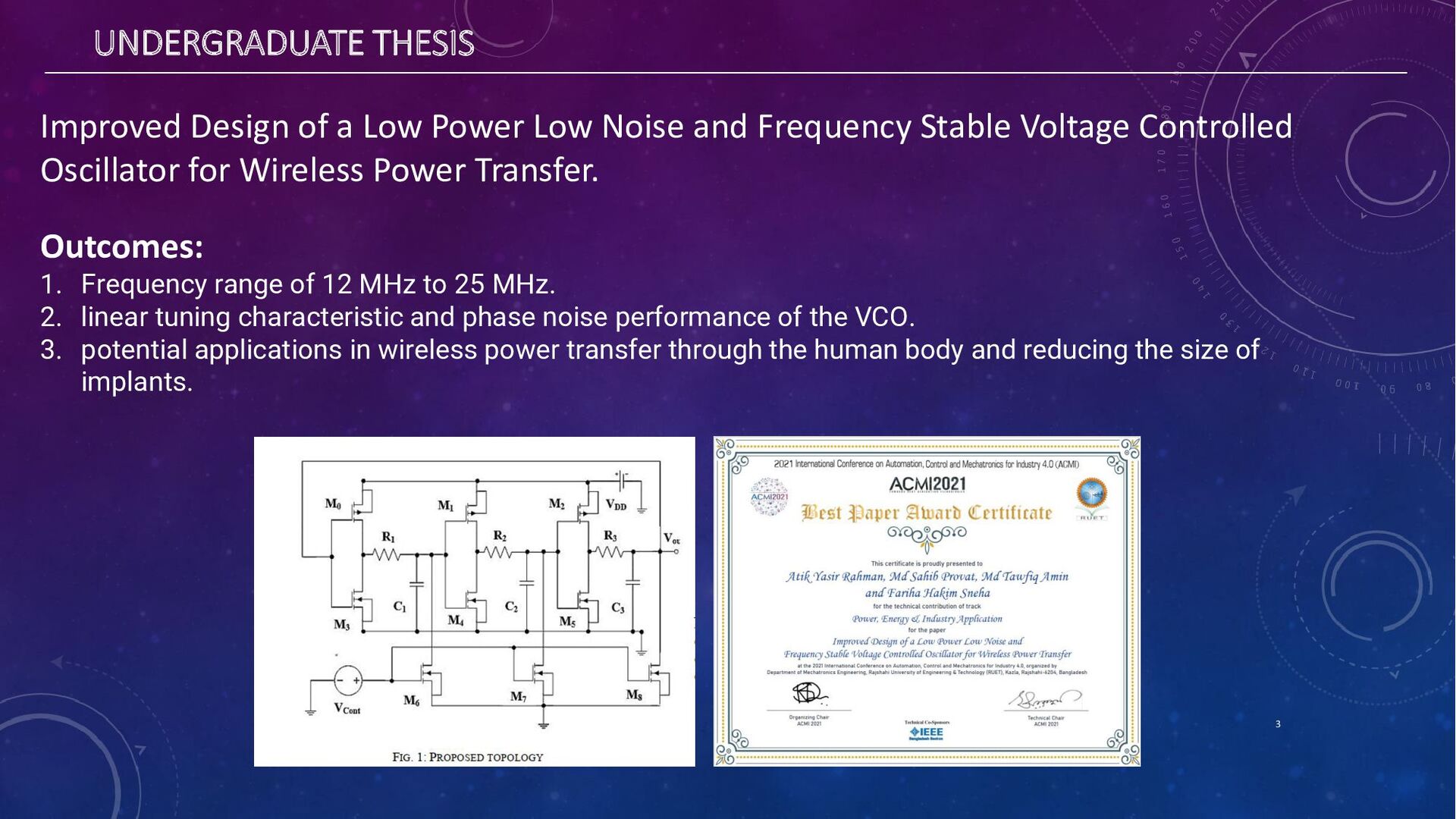 Noise and Frequency Stable Voltage Controlled Oscillator for Wireless Power Transfer. Outcomes: 1. Frequency range of 12 MHz to 25 MHz. 2. linear tuning characteristic and phase noise performance of the VCO. 3. potential applications in wireless power transfer through the human body and reducing the size of implants.