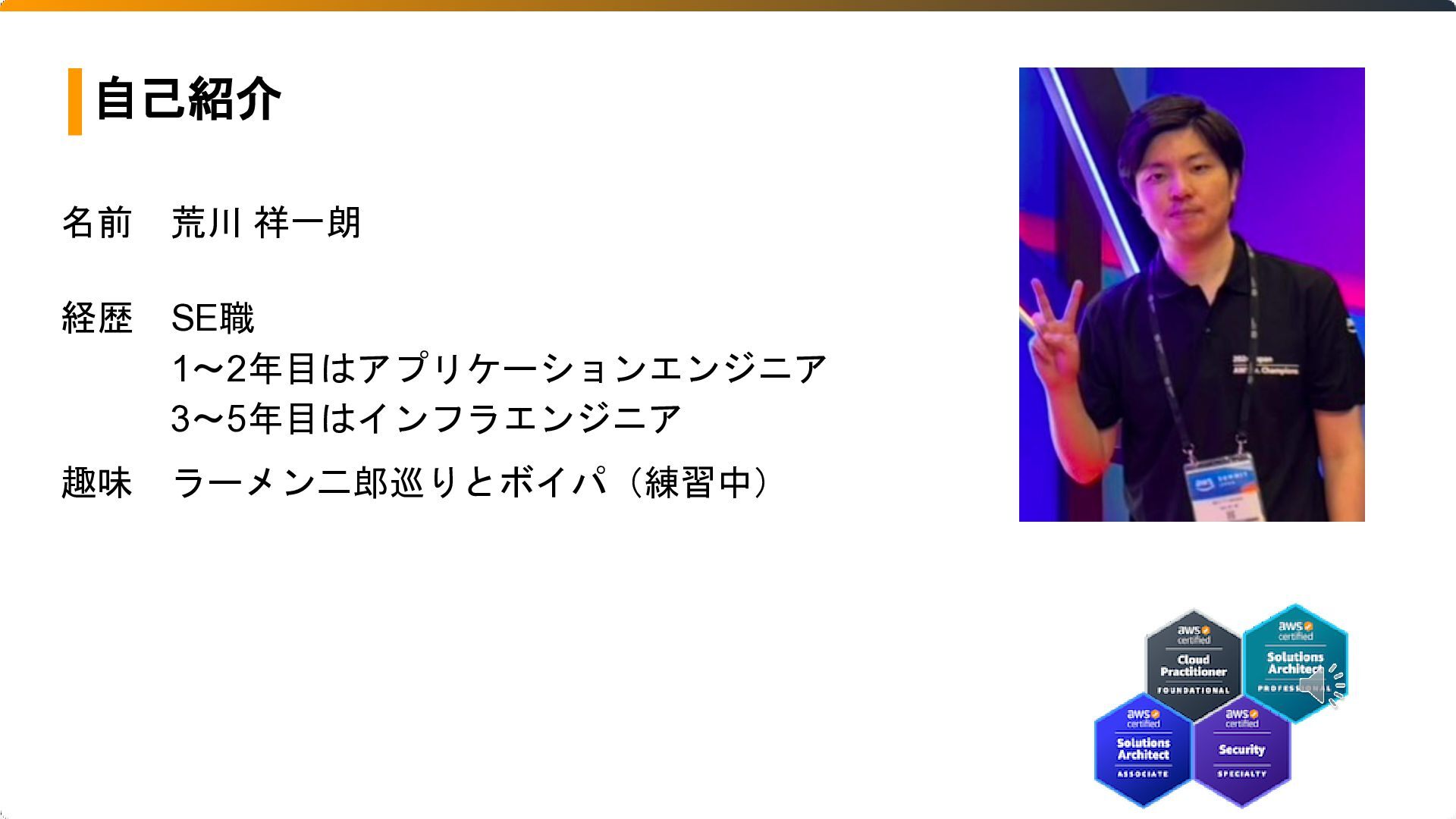 自己紹介 名前 荒川 祥一朗 経歴 SE職 1~2年目はアプリケーションエンジニア 3~5年目はインフラエンジニア 趣味 ラーメン二郎巡りとボイパ(練習中)