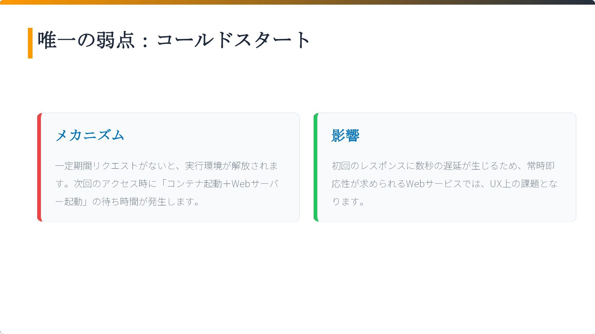 メカニズム 一定期間リクエストがないと、実行環境が解放されま す。次回のアクセス時に「コンテナ起動+Webサーバ ー起動」の待ち時間が発生します。 影響 初回のレスポンスに数秒の遅延が生じるため、常時即 応性が求められるWebサービスでは、UX上の課題とな ります。 唯一の弱点:コールドスタート
