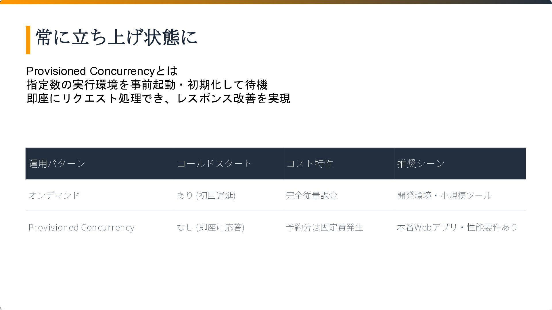 運用パターン コールドスタート コスト特性 推奨シーン オンデマンド あり (初回遅延) 完全従量課金 開発環境・小規模ツール Provisioned