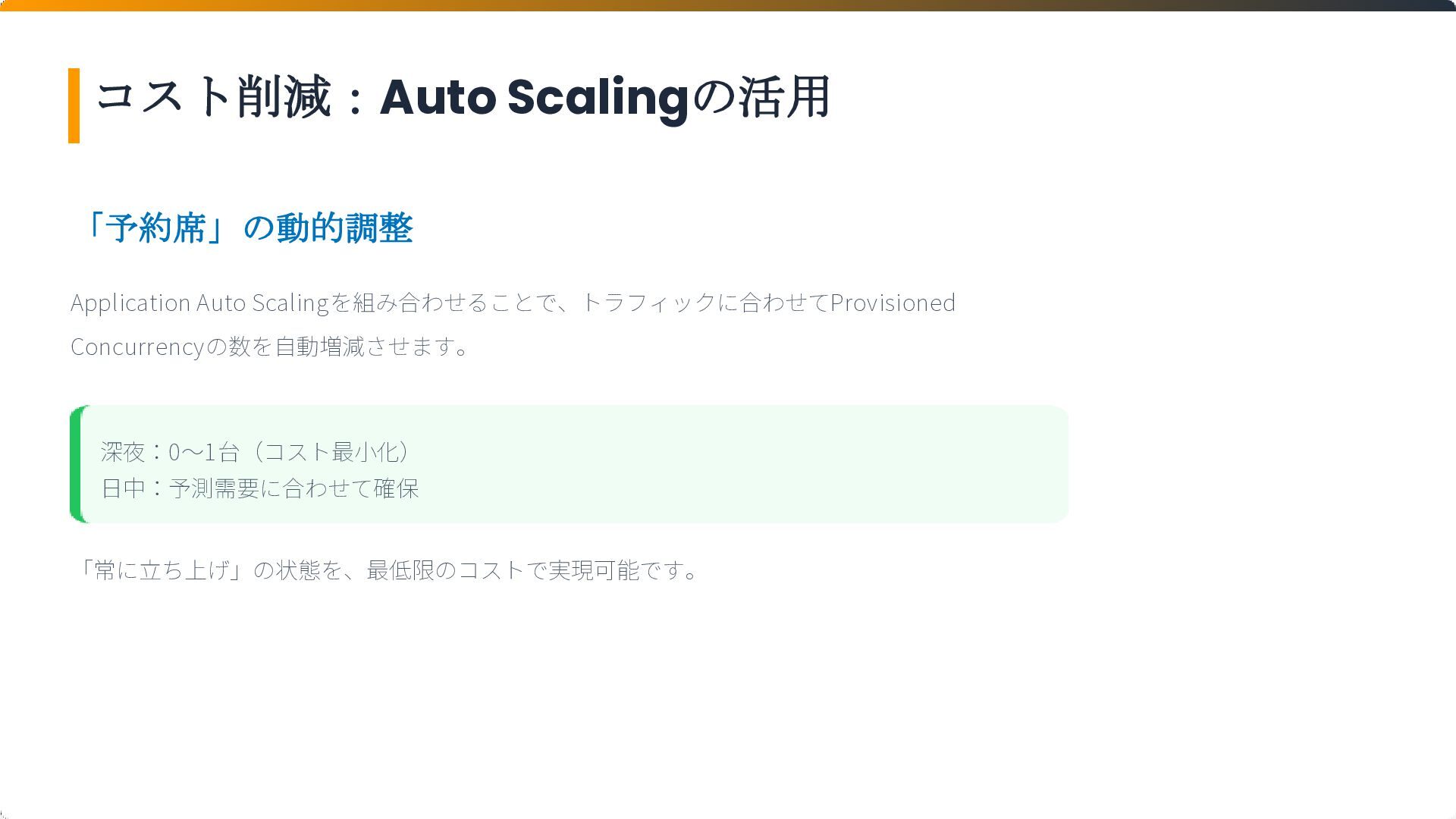 「予約席」の動的調整 Application Auto Scalingを組み合わせることで、トラフィックに合わせてProvisioned Concurrencyの数を自動増減させます。 「常に立ち上げ」の状態を、最低限のコストで実現可能です。 深夜:0〜1台(コスト最小化) 日中:予測需要に合わせて確保 コスト削減:Auto Scalingの活用