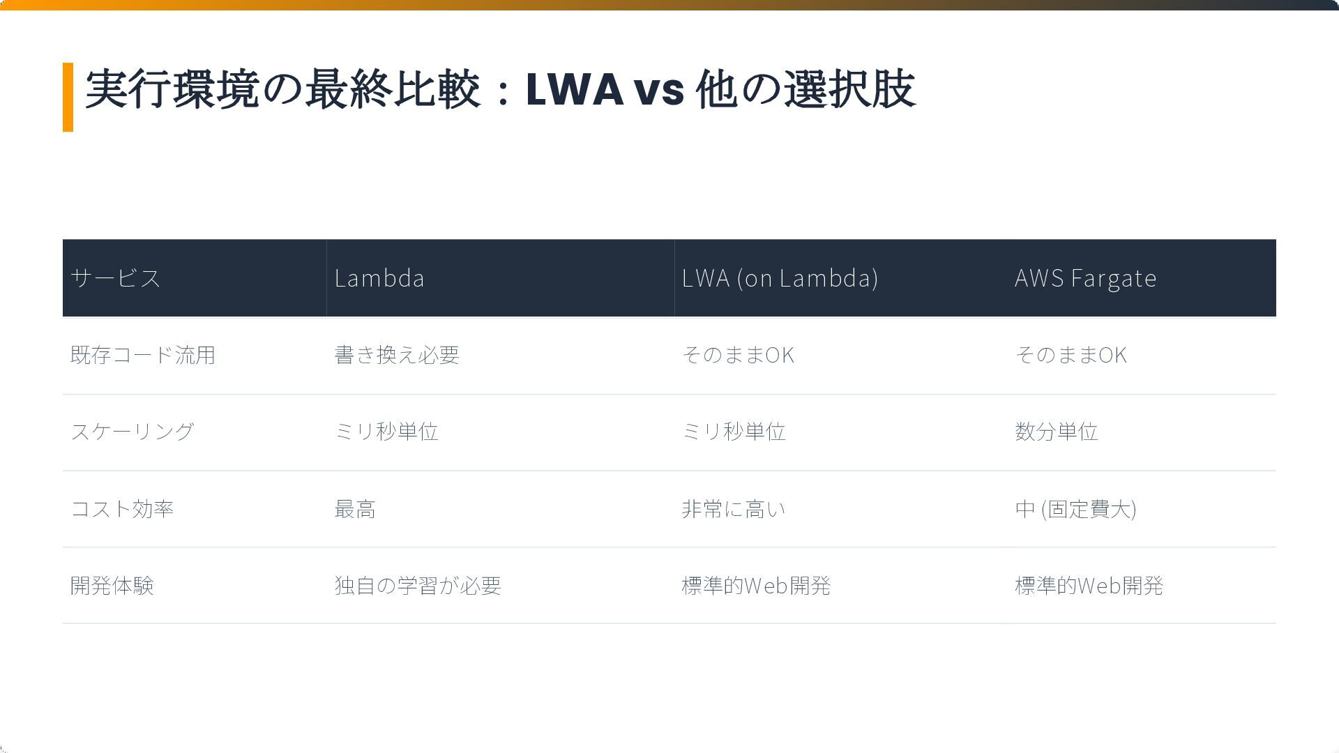 そのままOK スケーリング ミリ秒単位 ミリ秒単位 数分単位 コスト効率 最高 非常に高い 中 (固定費大) 開発体験 独自の学習が必要 標準的Web開発 標準的Web開発 実行環境の最終比較:LWA vs 他の選択肢