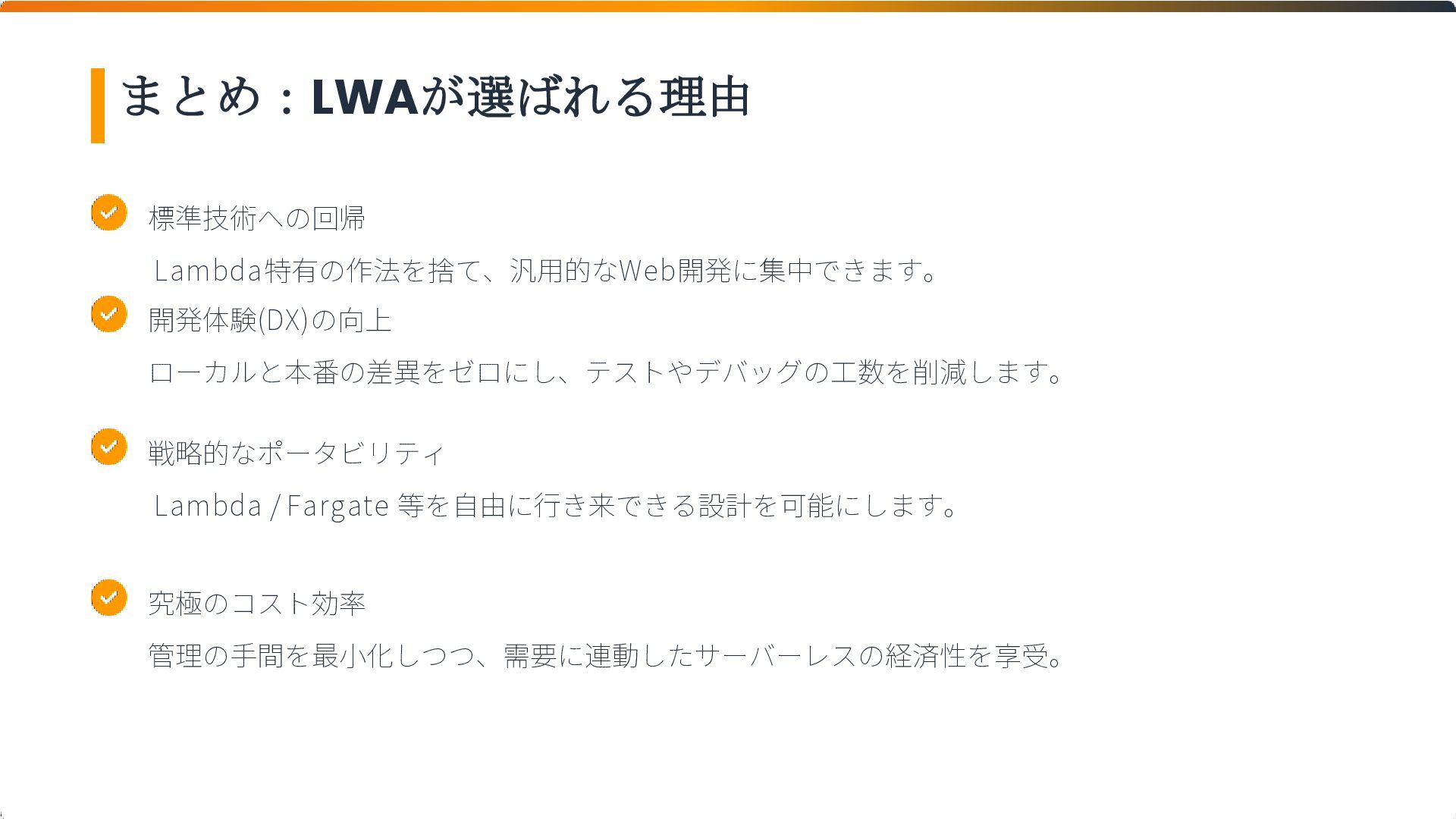 管理の手間を最小化しつつ、需要に連動したサーバーレスの経済性を享受。 まとめ:LWAが選ばれる理由