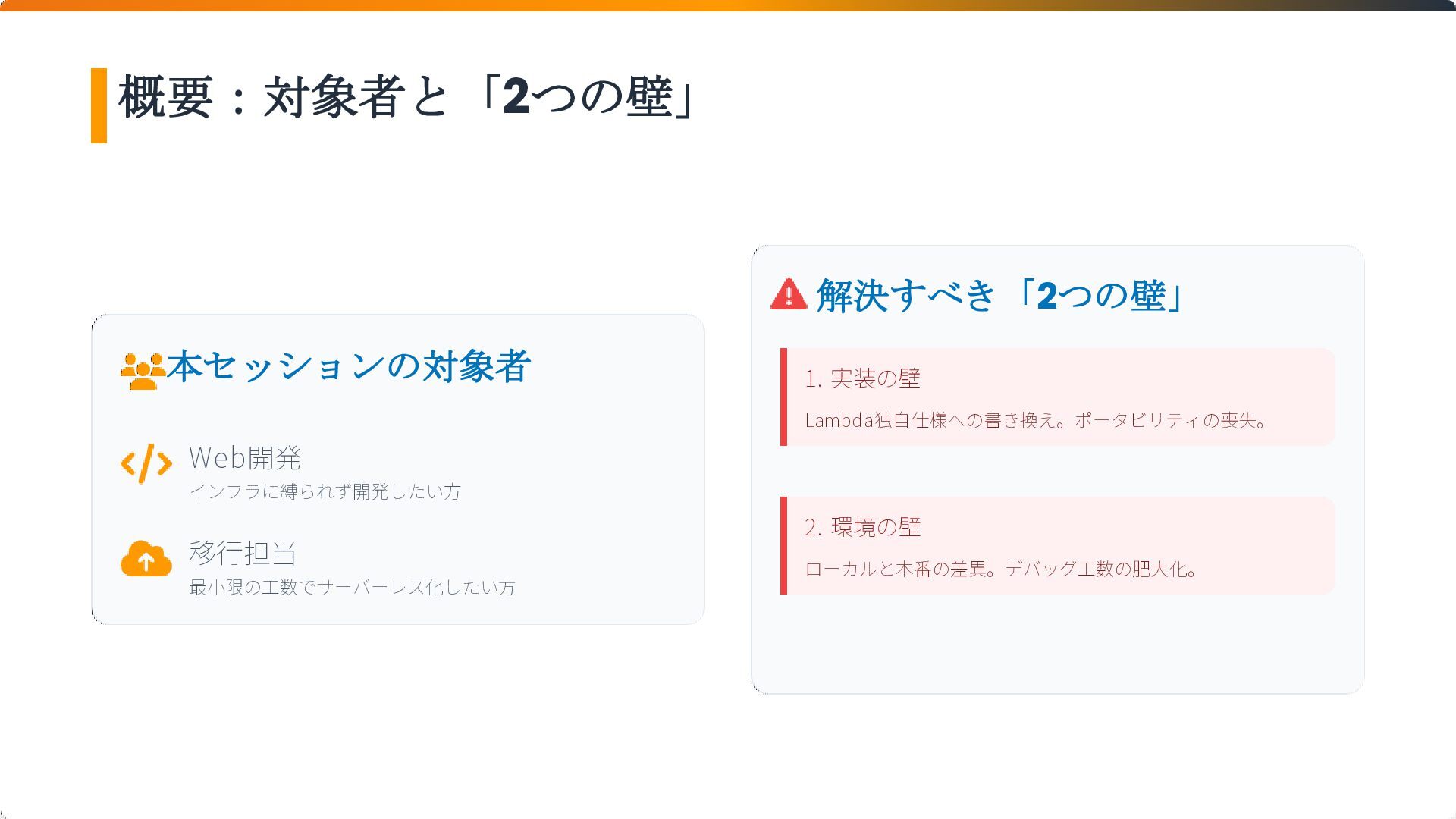 本セッションの対象者 解決すべき「2つの壁」 1. 実装の壁 Lambda独自仕様への書き換え。ポータビリティの喪失。 2. 環境の壁 ローカルと本番の差異。デバッグ工数の肥大化。 Web開発 インフラに縛られず開発したい方