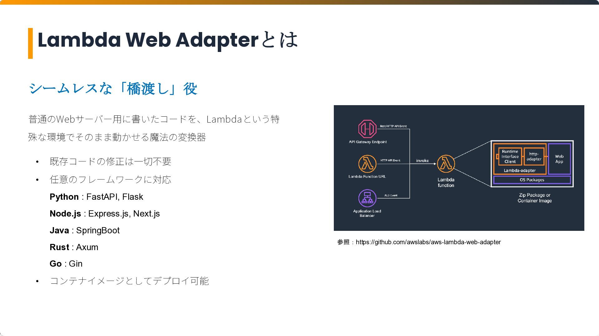 Flask Node.js : Express.js, Next.js Java : SpringBoot Rust : Axum Go : Gin • コンテナイメージとしてデプロイ可能 Lambda Web Adapterとは 参照:https://github.com/awslabs/aws-lambda-web-adapter