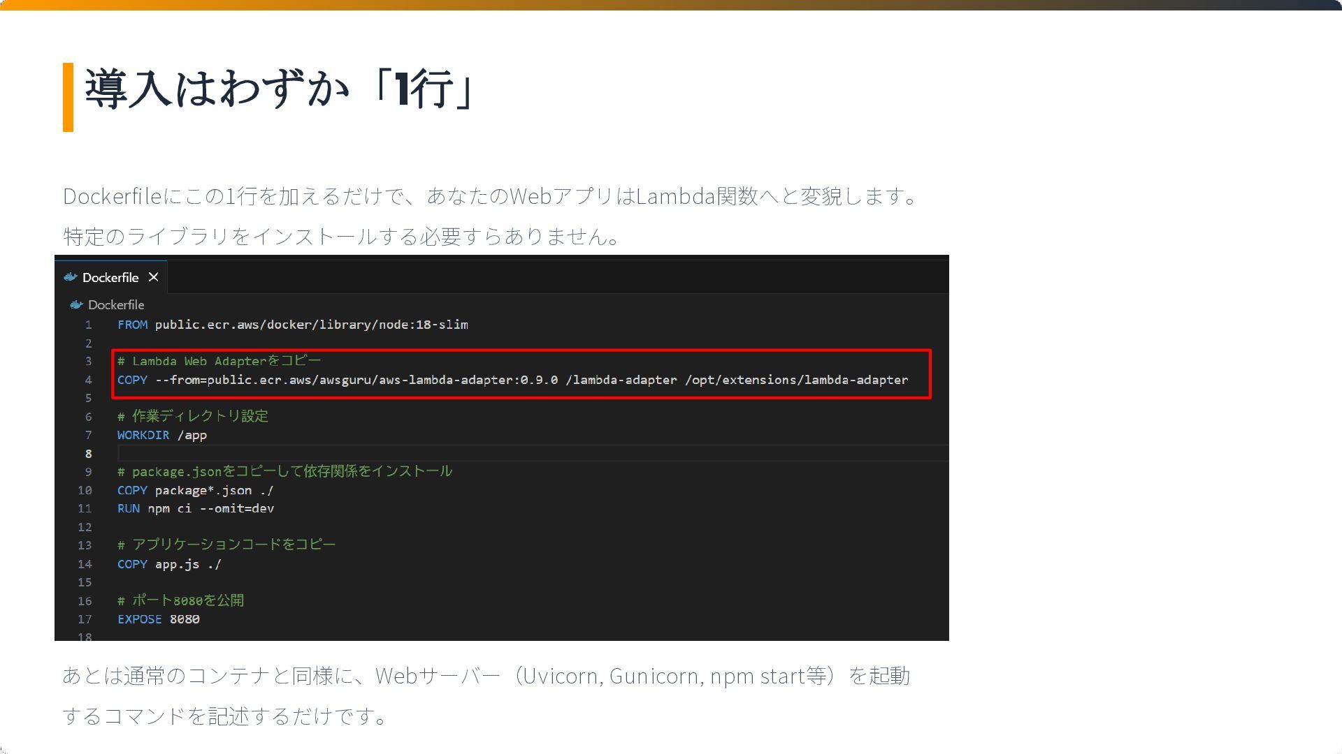 導入はわずか「1行」 Dockerfileにこの1行を加えるだけで、あなたのWebアプリはLambda関数へと変貌します。 特定のライブラリをインストールする必要すらありません。 あとは通常のコンテナと同様に、Webサーバー(Uvicorn, Gunicorn, npm start等)を起動 するコマンドを記述するだけです。