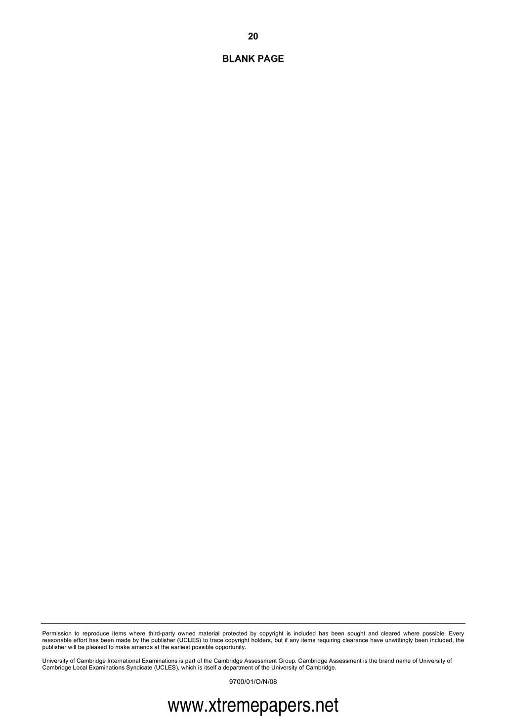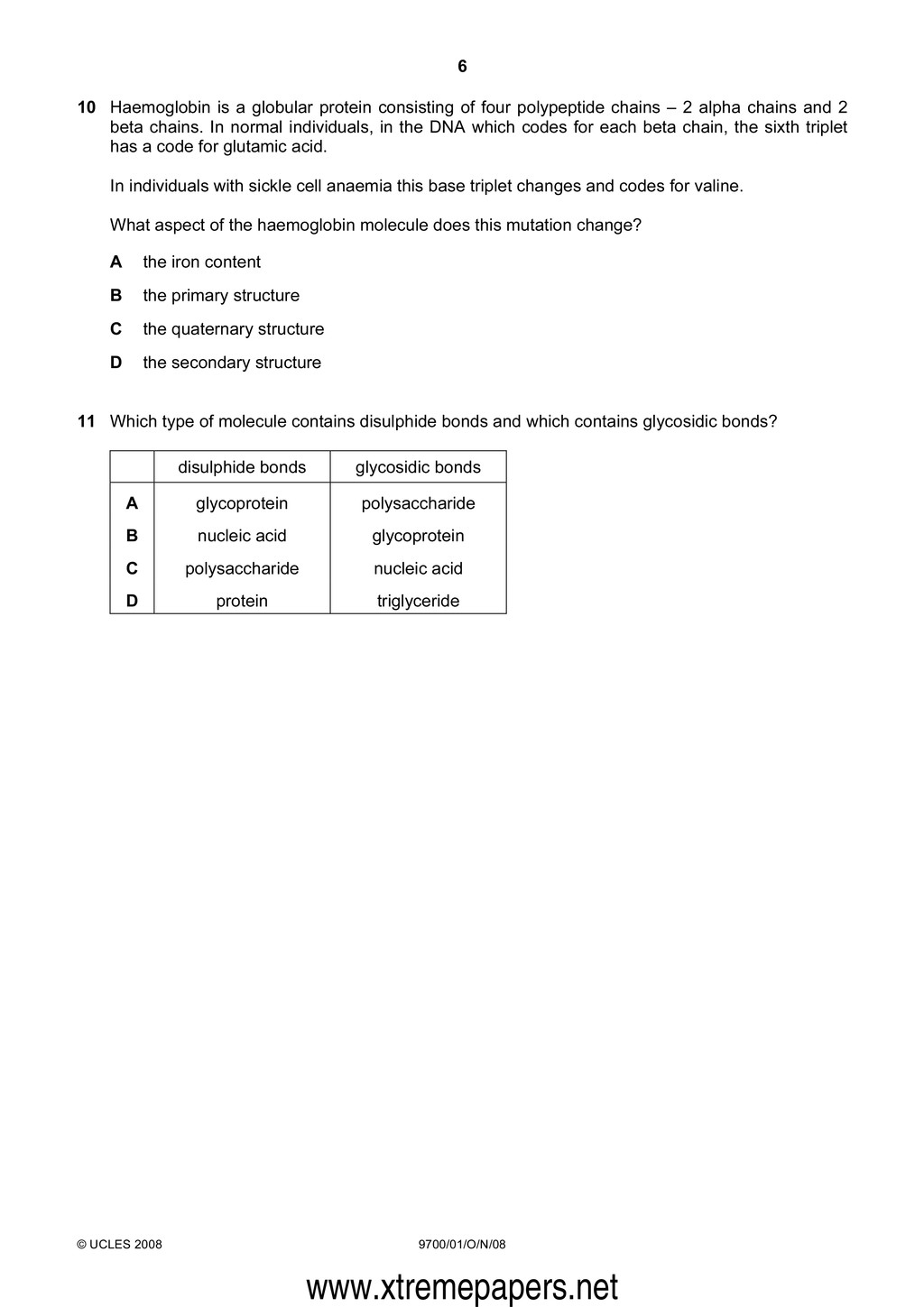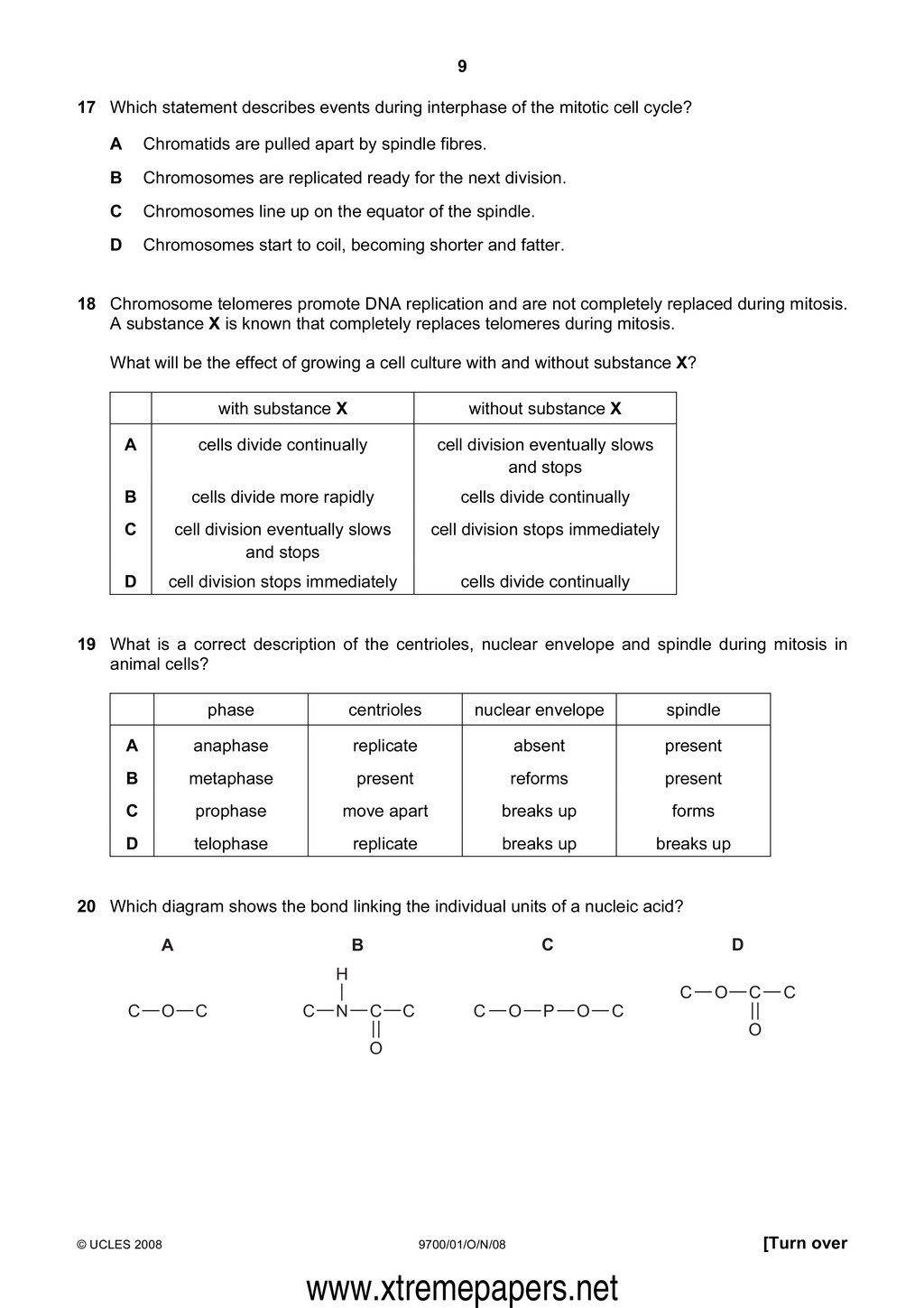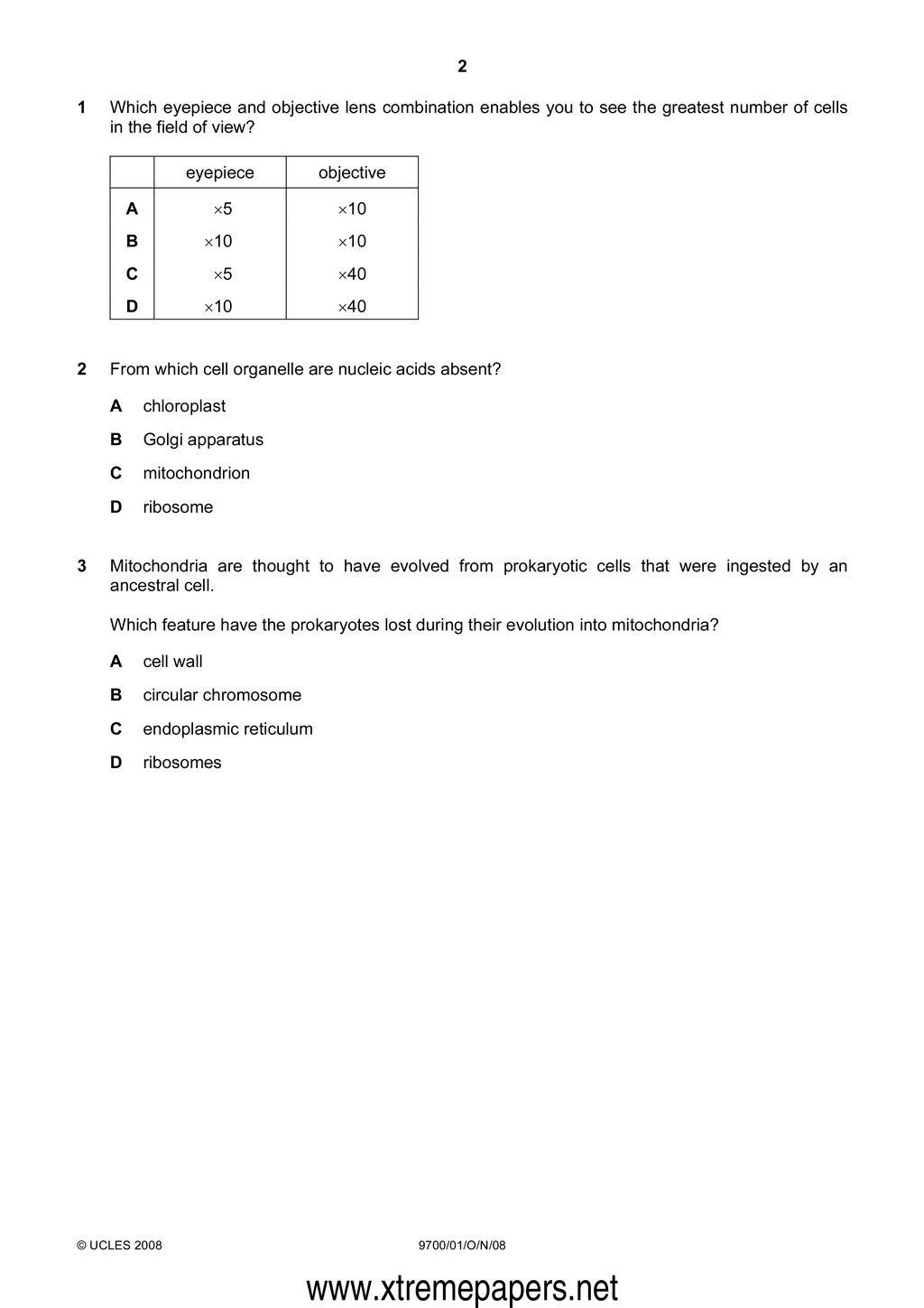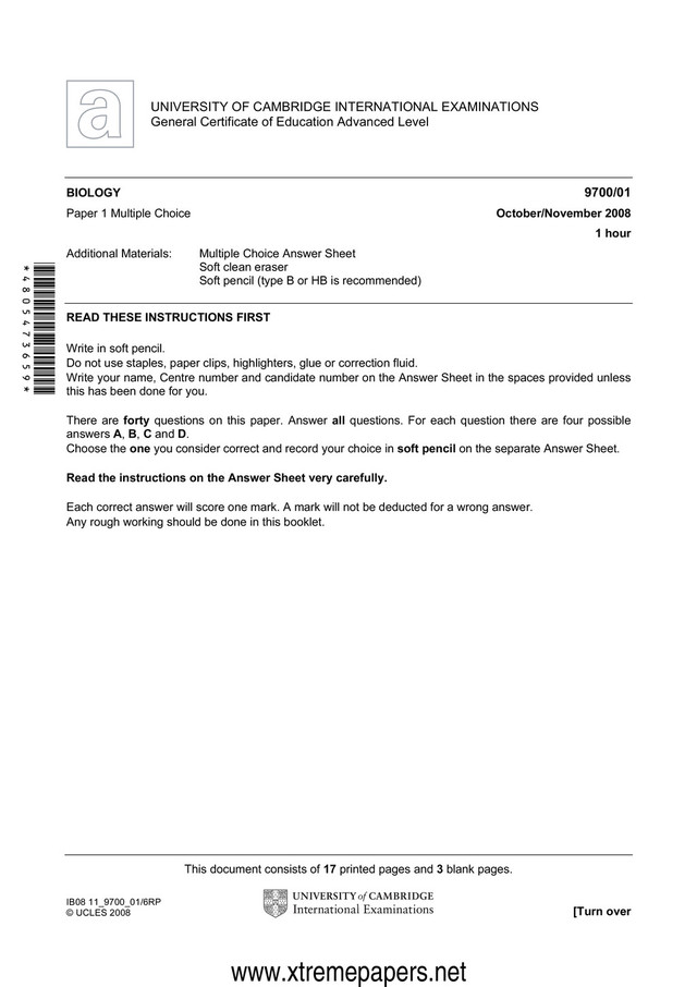 pages. IB08 11_9700_01/6RP © UCLES 2008 [Turn over *4805473659* UNIVERSITY OF CAMBRIDGE INTERNATIONAL EXAMINATIONS General Certificate of Education Advanced Level BIOLOGY 9700/01 Paper 1 Multiple Choice October/November 2008 1 hour Additional Materials: Multiple Choice Answer Sheet Soft clean eraser Soft pencil (type B or HB is recommended) READ THESE INSTRUCTIONS FIRST Write in soft pencil. Do not use staples, paper clips, highlighters, glue or correction fluid. Write your name, Centre number and candidate number on the Answer Sheet in the spaces provided unless this has been done for you. There are forty questions on this paper. Answer all questions. For each question there are four possible answers A, B, C and D. Choose the one you consider correct and record your choice in soft pencil on the separate Answer Sheet. Read the instructions on the Answer Sheet very carefully. Each correct answer will score one mark. A mark will not be deducted for a wrong answer. Any rough working should be done in this booklet. www.xtremepapers.net