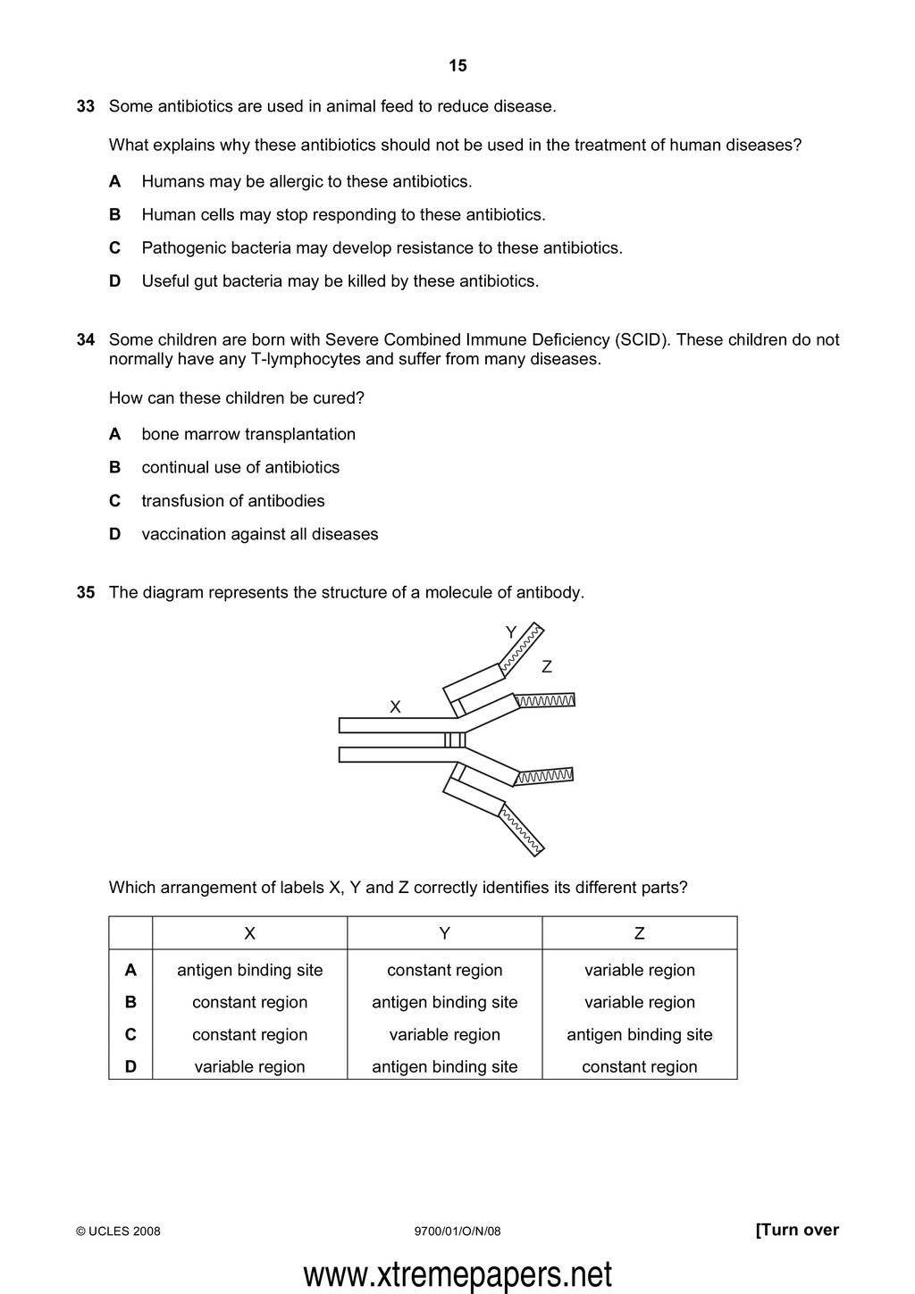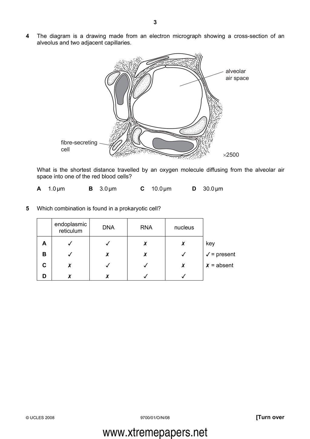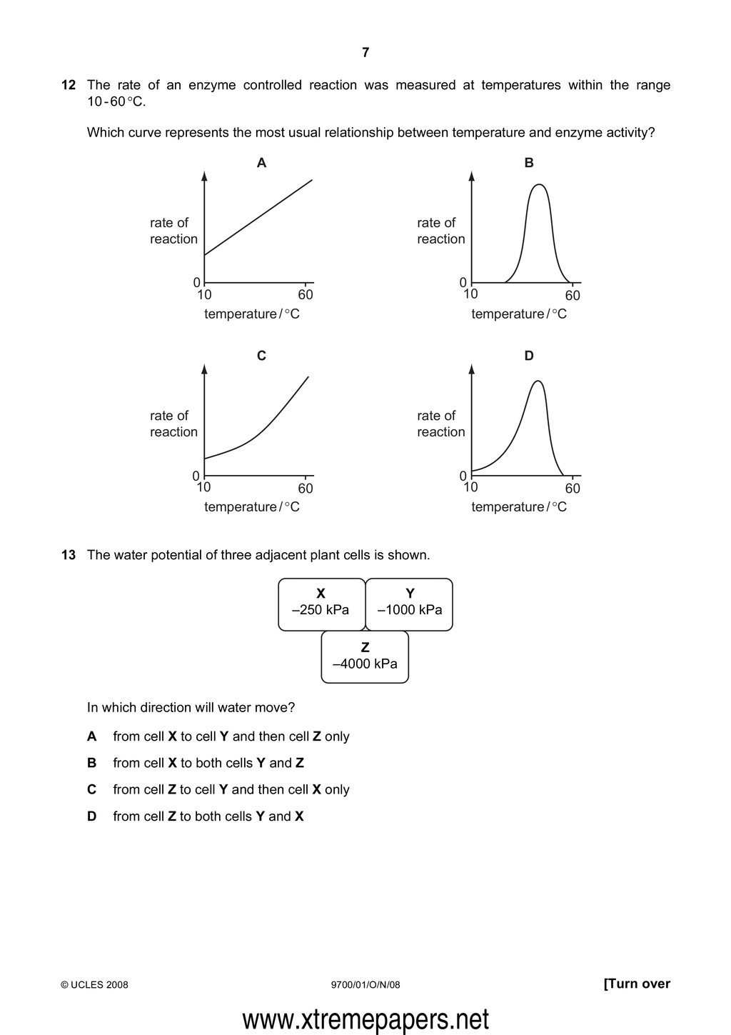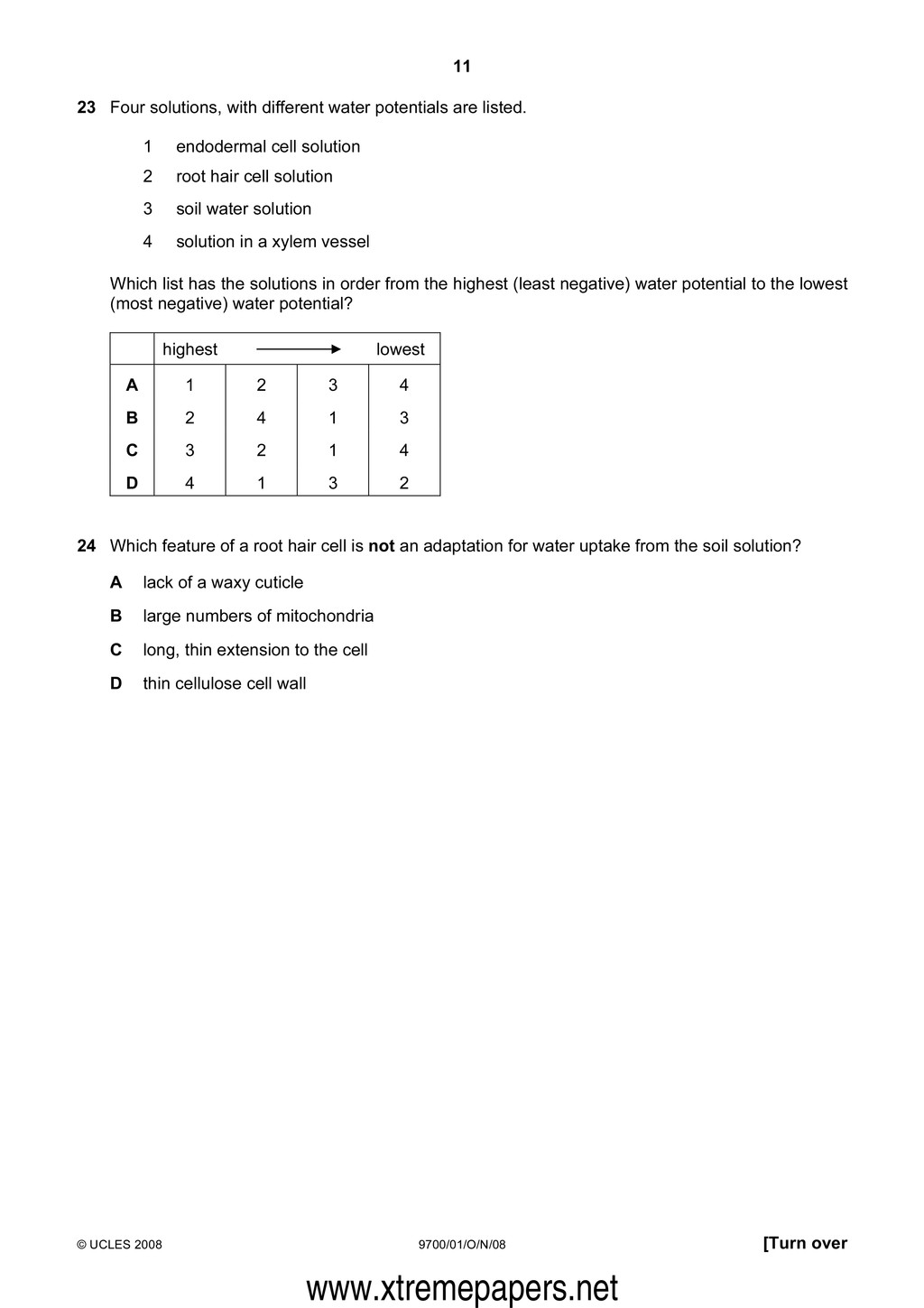pages. IB08 11_9700_01/6RP © UCLES 2008 [Turn over *4805473659* UNIVERSITY OF CAMBRIDGE INTERNATIONAL EXAMINATIONS General Certificate of Education Advanced Level BIOLOGY 9700/01 Paper 1 Multiple Choice October/November 2008 1 hour Additional Materials: Multiple Choice Answer Sheet Soft clean eraser Soft pencil (type B or HB is recommended) READ THESE INSTRUCTIONS FIRST Write in soft pencil. Do not use staples, paper clips, highlighters, glue or correction fluid. Write your name, Centre number and candidate number on the Answer Sheet in the spaces provided unless this has been done for you. There are forty questions on this paper. Answer all questions. For each question there are four possible answers A, B, C and D. Choose the one you consider correct and record your choice in soft pencil on the separate Answer Sheet. Read the instructions on the Answer Sheet very carefully. Each correct answer will score one mark. A mark will not be deducted for a wrong answer. Any rough working should be done in this booklet. www.xtremepapers.net
