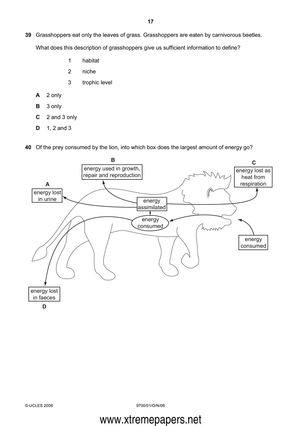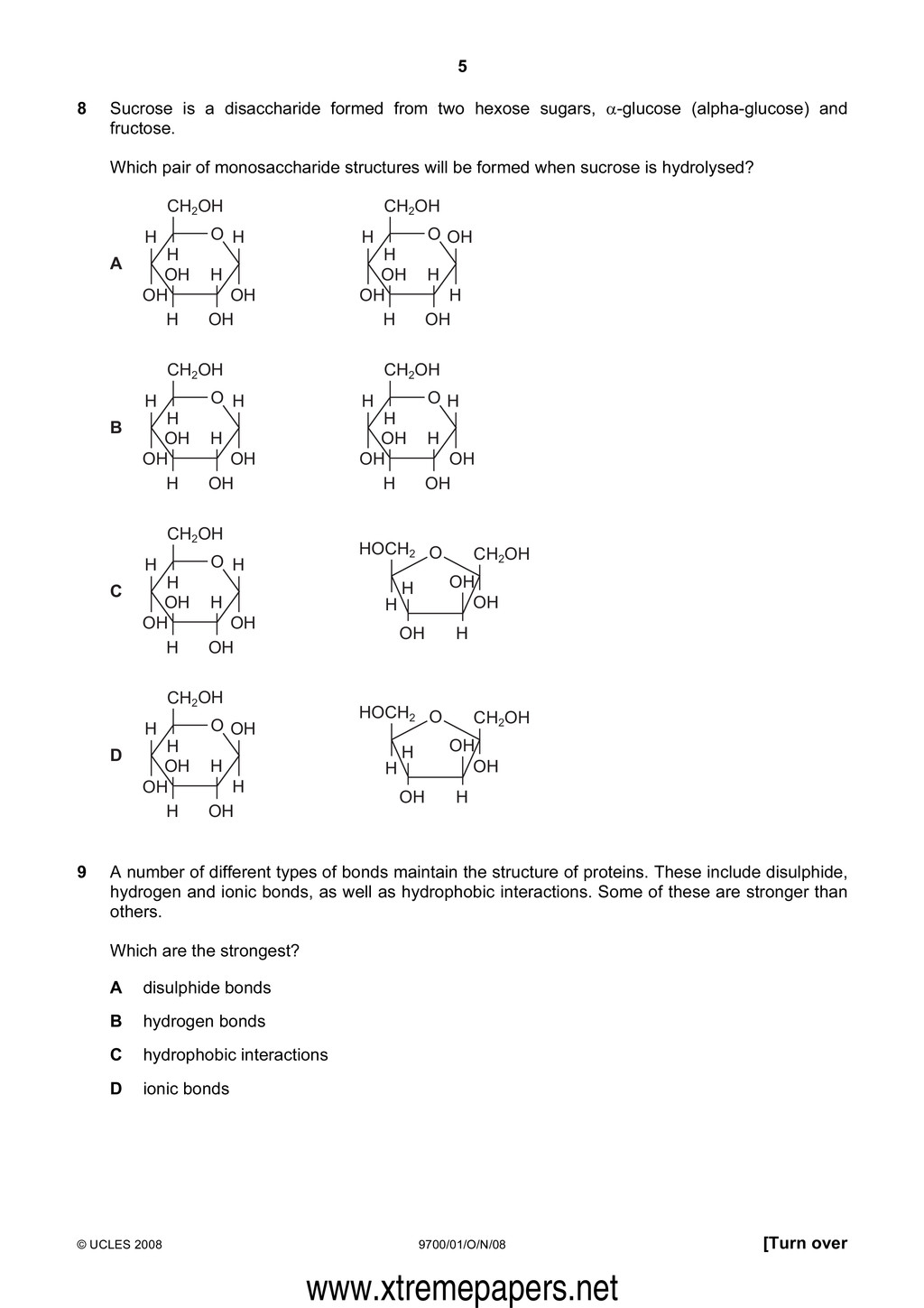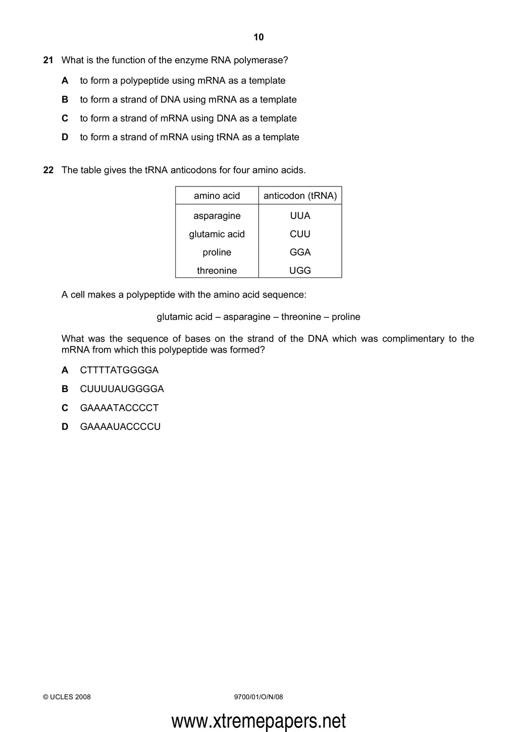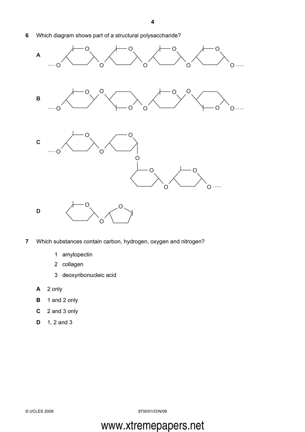 pages. IB08 11_9700_01/6RP © UCLES 2008 [Turn over *4805473659* UNIVERSITY OF CAMBRIDGE INTERNATIONAL EXAMINATIONS General Certificate of Education Advanced Level BIOLOGY 9700/01 Paper 1 Multiple Choice October/November 2008 1 hour Additional Materials: Multiple Choice Answer Sheet Soft clean eraser Soft pencil (type B or HB is recommended) READ THESE INSTRUCTIONS FIRST Write in soft pencil. Do not use staples, paper clips, highlighters, glue or correction fluid. Write your name, Centre number and candidate number on the Answer Sheet in the spaces provided unless this has been done for you. There are forty questions on this paper. Answer all questions. For each question there are four possible answers A, B, C and D. Choose the one you consider correct and record your choice in soft pencil on the separate Answer Sheet. Read the instructions on the Answer Sheet very carefully. Each correct answer will score one mark. A mark will not be deducted for a wrong answer. Any rough working should be done in this booklet. www.xtremepapers.net
