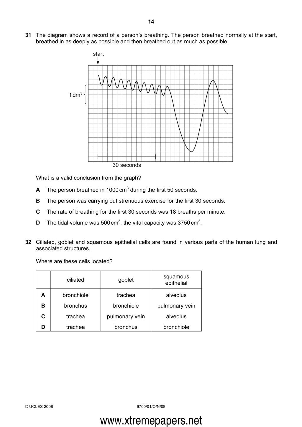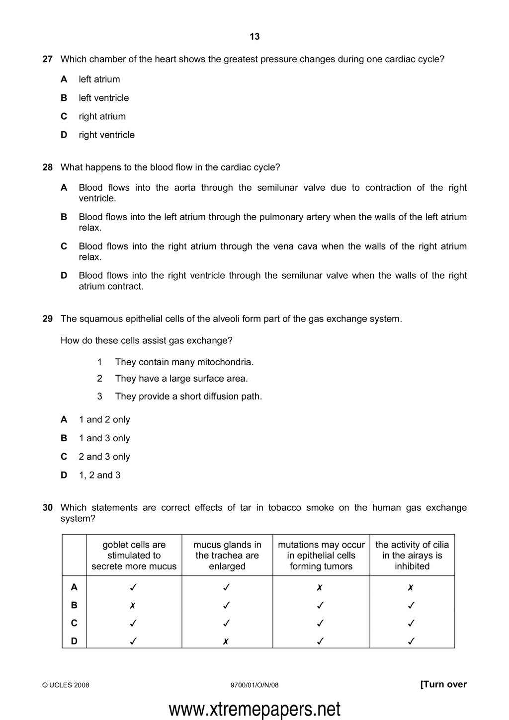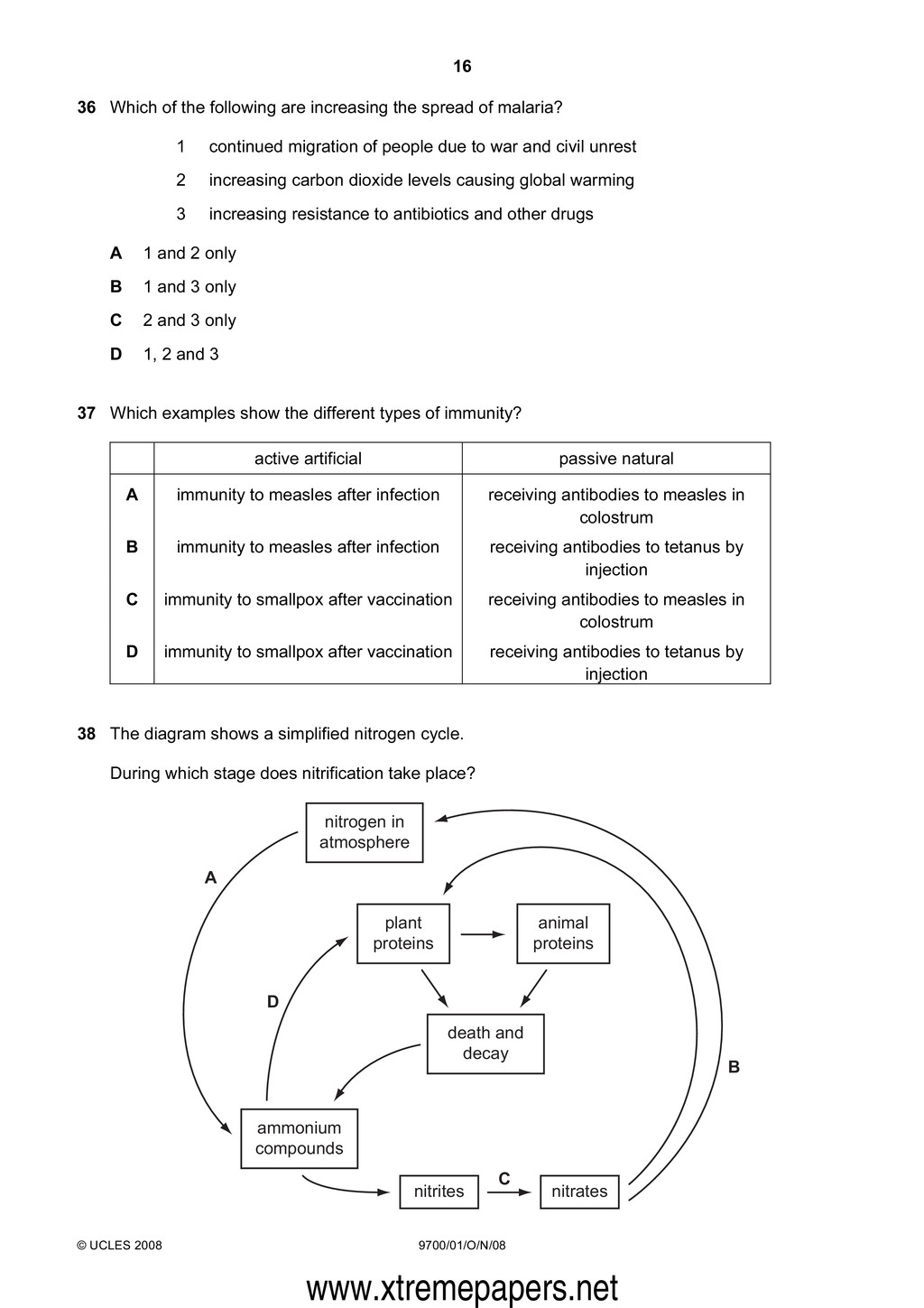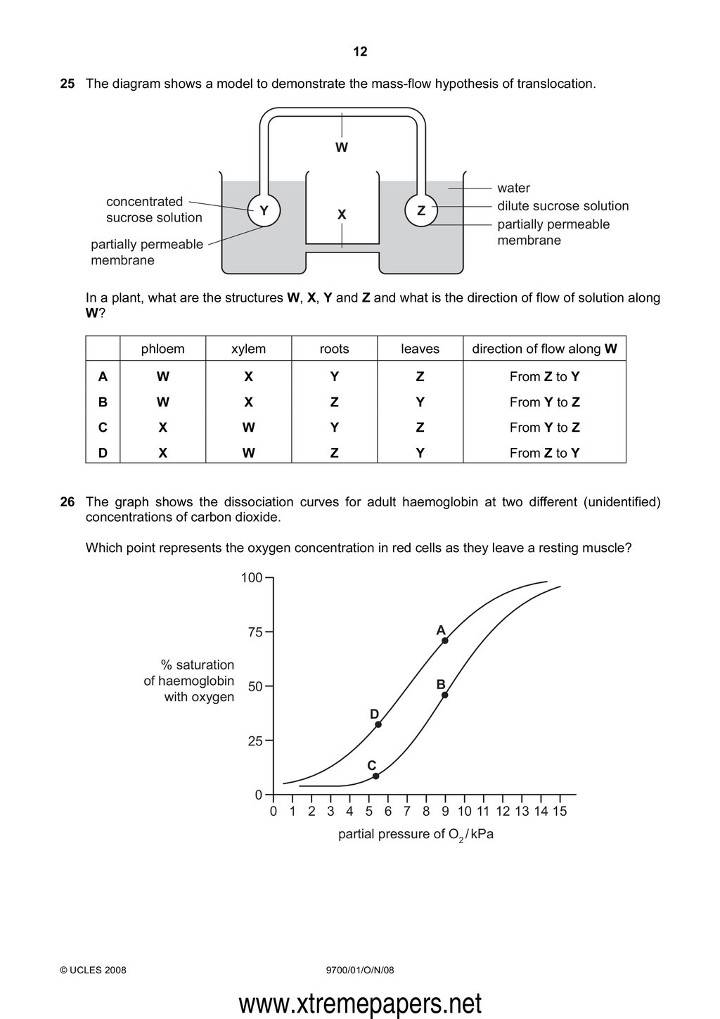 pages. IB08 11_9700_01/6RP © UCLES 2008 [Turn over *4805473659* UNIVERSITY OF CAMBRIDGE INTERNATIONAL EXAMINATIONS General Certificate of Education Advanced Level BIOLOGY 9700/01 Paper 1 Multiple Choice October/November 2008 1 hour Additional Materials: Multiple Choice Answer Sheet Soft clean eraser Soft pencil (type B or HB is recommended) READ THESE INSTRUCTIONS FIRST Write in soft pencil. Do not use staples, paper clips, highlighters, glue or correction fluid. Write your name, Centre number and candidate number on the Answer Sheet in the spaces provided unless this has been done for you. There are forty questions on this paper. Answer all questions. For each question there are four possible answers A, B, C and D. Choose the one you consider correct and record your choice in soft pencil on the separate Answer Sheet. Read the instructions on the Answer Sheet very carefully. Each correct answer will score one mark. A mark will not be deducted for a wrong answer. Any rough working should be done in this booklet. www.xtremepapers.net