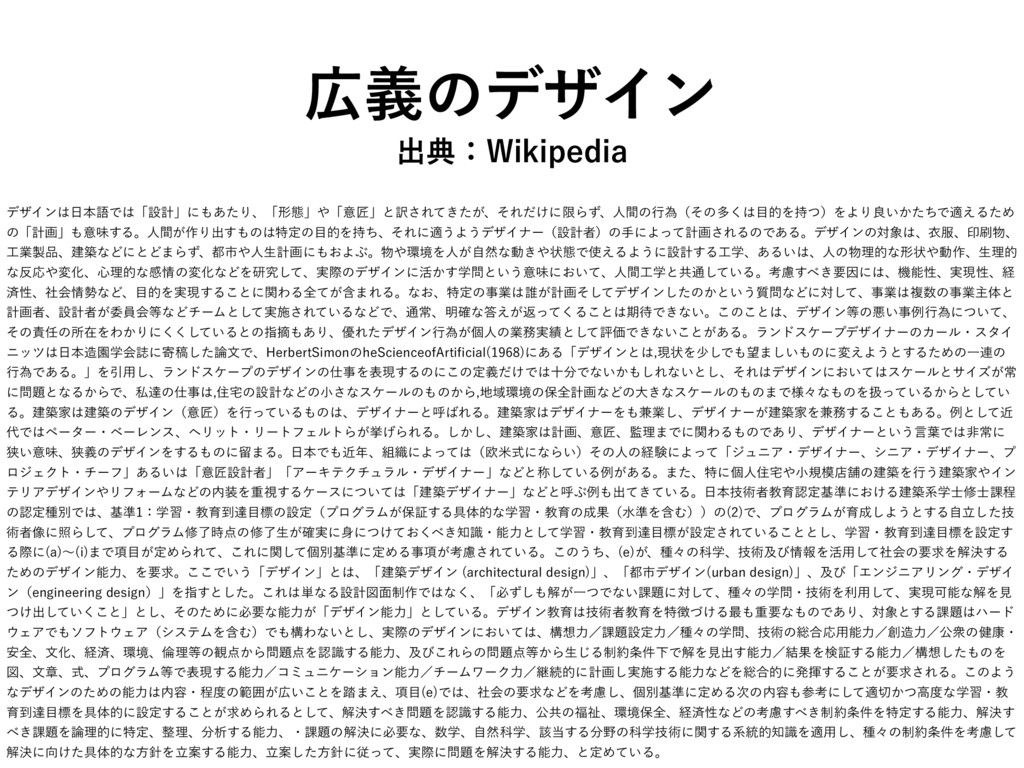 ʹ͋ΔʮσβΠϯͱ ݱঢ়Λগ͠Ͱ·͍͠ͷʹม͑Α͏ͱ͢ΔͨΊͷҰ࿈ͷ ߦҝͰ͋ΔɻʯΛҾ༻͠ɺϥϯυεέʔϓͷσβΠϯͷࣄΛදݱ͢Δͷʹ͜ͷఆ͚ٛͩͰेͰͳ͍͔͠Εͳ͍ͱ͠ɺͦΕσβΠϯʹ͓͍ͯεέʔϧͱαΠζ͕ৗ ʹͱͳΔ͔ΒͰɺࢲୡͷࣄ ॅͷઃܭͳͲͷখ͞ͳεέʔϧͷͷ͔Β ҬڥͷอશܭըͳͲͷେ͖ͳεέʔϧͷͷ·Ͱ༷ʑͳͷΛѻ͍ͬͯΔ͔Βͱ͍ͯ͠ ΔɻݐஙՈݐஙͷσβΠϯʢҙঊʣΛߦ͍ͬͯΔͷɺσβΠφʔͱݺΕΔɻݐஙՈσβΠφʔΛ݉ۀ͠ɺσβΠφʔ͕ݐஙՈΛ݉͢Δ͜ͱ͋Δɻྫͱͯۙ͠ ͰϖʔλʔɾϕʔϨϯεɺϔϦοτɾϦʔτϑΣϧτΒ͕ڍ͛ΒΕΔɻ͔͠͠ɺݐஙՈܭըɺҙঊɺཧ·ͰʹؔΘΔͷͰ͋ΓɺσβΠφʔͱ͍͏ݴ༿Ͱඇৗʹ ڱ͍ҙຯɺڱٛͷσβΠϯΛ͢Δͷʹཹ·ΔɻຊͰۙɺ৫ʹΑͬͯʢԤถࣜʹͳΒ͍ʣͦͷਓͷܦݧʹΑͬͯʮδϡχΞɾσβΠφʔɺγχΞɾσβΠφʔɺϓ ϩδΣΫτɾνʔϑʯ͋Δ͍ʮҙঊઃܭऀʯʮΞʔΩςΫνϡϥϧɾσβΠφʔʯͳͲͱশ͍ͯ͠Δྫ͕͋Δɻ·ͨɺಛʹݸਓॅখنళฮͷݐஙΛߦ͏ݐஙՈΠϯ ςϦΞσβΠϯϦϑΥʔϜͳͲͷΛॏࢹ͢Δέʔεʹ͍ͭͯʮݐஙσβΠφʔʯͳͲͱݺͿྫग़͖͍ͯͯΔɻຊٕज़ऀڭҭೝఆج४ʹ͓͚Δݐஙܥֶ࢜म࢜՝ఔ ͷೝఆछผͰɺج४ɿֶशɾڭҭ౸ୡඪͷઃఆʢϓϩάϥϜ͕อূ͢Δ۩ମతͳֶशɾڭҭͷՌʢਫ४ΛؚΉʣʣͷ ͰɺϓϩάϥϜ͕ҭ͠Α͏ͱ͢Δཱٕࣗͨ͠ ज़ऀ૾ʹরΒͯ͠ɺϓϩάϥϜमྃ࣌ͷमྃੜ͕࣮֬ʹʹ͚͓͖ͭͯࣝ͘ɾೳྗͱֶͯ͠शɾڭҭ౸ୡඪ͕ઃఆ͞Ε͍ͯΔ͜ͱͱ͠ɺֶशɾڭҭ౸ୡඪΛઃఆ͢ Δࡍʹ B ʙ J ·Ͱ߲͕ఆΊΒΕͯɺ͜Εʹؔͯ͠ݸผج४ʹఆΊΔࣄ߲͕ߟྀ͞Ε͍ͯΔɻ͜ͷ͏ͪɺ F ͕ɺछʑͷՊֶɺٕज़ٴͼใΛ׆༻ͯࣾ͠ձͷཁٻΛղܾ͢Δ ͨΊͷσβΠϯೳྗɺΛཁٻɻ͜͜Ͱ͍͏ʮσβΠϯʯͱɺʮݐஙσβΠϯ BSDIJUFDUVSBMEFTJHO ʯɺʮࢢσβΠϯ VSCBOEFTJHO ʯɺٴͼʮΤϯδχΞϦϯάɾσβΠ ϯʢFOHJOFFSJOHEFTJHOʣʯΛࢦ͢ͱͨ͠ɻ͜Ε୯ͳΔઃܭਤ໘੍࡞Ͱͳ͘ɺʮඞͣ͠ղ͕ҰͭͰͳ͍՝ʹରͯ͠ɺछʑͷֶɾٕज़Λར༻ͯ͠ɺ࣮ݱՄೳͳղΛݟ ͚ͭग़͍ͯ͘͜͠ͱʯͱ͠ɺͦͷͨΊʹඞཁͳೳྗ͕ʮσβΠϯೳྗʯͱ͍ͯ͠ΔɻσβΠϯڭҭٕज़ऀڭҭΛಛ͚ͮΔ࠷ॏཁͳͷͰ͋Γɺରͱ͢Δ՝ϋʔυ ΣΞͰιϑτΣΞʢγεςϜΛؚΉʣͰߏΘͳ͍ͱ͠ɺ࣮ࡍͷσβΠϯʹ͓͍ͯɺߏྗʗ՝ઃఆྗʗछʑͷֶɺٕज़ͷ૯߹Ԡ༻ೳྗʗྗʗެऺͷ݈߁ɾ ҆શɺจԽɺܦࡁɺڥɺྙཧͷ؍͔ΒΛೝࣝ͢Δೳྗɺٴͼ͜ΕΒͷ͔Βੜ͡Δ੍݅ԼͰղΛݟग़͢ೳྗʗ݁ՌΛݕূ͢Δೳྗʗߏͨ͠ͷΛ ਤɺจষɺࣜɺϓϩάϥϜͰදݱ͢ΔೳྗʗίϛϡχέʔγϣϯೳྗʗνʔϜϫʔΫྗʗܧଓతʹܭը࣮͠ࢪ͢ΔೳྗͳͲΛ૯߹తʹൃش͢Δ͜ͱ͕ཁٻ͞ΕΔɻ͜ͷΑ͏ ͳσβΠϯͷͨΊͷೳྗ༰ɾఔͷൣғ͕͍͜ͱΛ౿·͑ɺ߲ F ͰɺࣾձͷཁٻͳͲΛߟྀ͠ɺݸผج४ʹఆΊΔ࣍ͷ༰ࢀߟʹͯ͠ద͔ͭߴͳֶशɾڭ ҭ౸ୡඪΛ۩ମతʹઃఆ͢Δ͜ͱ͕ٻΊΒΕΔͱͯ͠ɺղܾ͖͢Λೝࣝ͢ΔೳྗɺެڞͷࢱɺڥอશɺܦࡁੑͳͲͷߟ੍ྀ͖݅͢Λಛఆ͢Δೳྗɺղܾ͢ ͖՝Λཧతʹಛఆɺཧɺੳ͢Δೳྗɺɾ՝ͷղܾʹඞཁͳɺֶɺࣗવՊֶɺ֘͢ΔͷՊֶٕज़ʹؔ͢Δܥ౷తࣝΛద༻͠ɺछʑͷ੍݅Λߟྀͯ͠ ղܾʹ͚ͨ۩ମతͳํΛཱҊ͢ΔೳྗɺཱҊͨ͠ํʹैͬͯɺ࣮ࡍʹΛղܾ͢ΔೳྗɺͱఆΊ͍ͯΔɻ