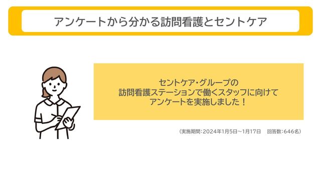 14.7% 13.5% 52.6% 47.1% 51.4% 67.3% 48.6% 44.0% 39.2% 41.5% 34.7% 55.6% 55.3% 62.7% 10.2% 10.8% 4.8% 10.1% 23.1% 21.7% 17.8% 29.4% 33.3% 22.0% 22.6% 19.8% 1.7% 2.9% 0.9% 1.1% 9.8% 6.8% 11.8% 16.3% 20.9% 8.7% 7.4% 4.0% 満足 まあ満足 やや不満 不満 アンケートから分かる訪問看護とセントケア 「上司・同僚・多職種との関係」の 満足度が高い結果となりました。 セントケアではLINEworksなどのコミュニ ケーションツールの活用や、医療職だけでな く多職種と交流があります。 「成長できる環境」を より整えています。 専門看護師の補助制度・キャリアラダーの構 築・各種研修の整備を行っています。営業 所・地域会社の単位を超えての座談会や研 修を開催しています。 その他、満足度が低かった項目に 対しても、待遇改善を行っており、 満足度の改善に努めております。