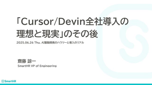「Cursor/Devin全社導入の 理想と現実」のその後 2025.06.26 Thu. AI駆動開発のハウツーと導入のリアル 齋藤 諒一 SmartHR VP of