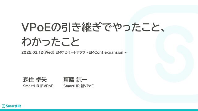 【EMConf JP 2025サブイベント】EMゆるミートアップ〜EMConf expansion〜 での発表資料です。 VP of Engineeringの引き継ぎで得られた知見を新旧VPoEそれぞれの視点で語りました
