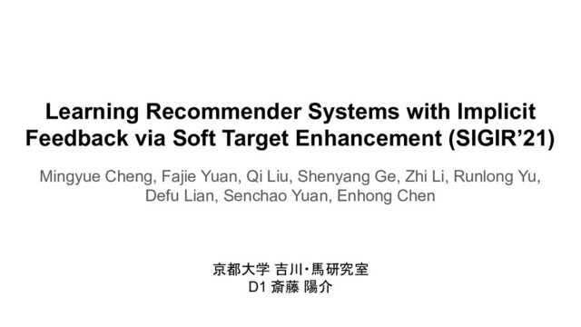 Cheng, Mingyue, Fajie Yuan, Qi Liu, Shenyang Ge, Zhi Li, Runlong Yu, Defu Lian, Senchao Yuan, and Enhong Chen. 2021. “Learning Recommender Systems with Implicit Feedback via Soft Target Enhancement.” In Proceedings of the 44th International ACM SIGIR Conference on Research and Development in Information Retrieval, 575–84. SIGIR ’21. New York, NY, USA: Association for Computing Machinery.