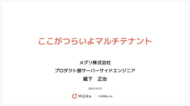 ここがつらいよマルチテナント © MGRe, Inc. 2022.10.13 メグリ株式会社 プロダクト部サーバーサイドエンジニア 蔵下 正治