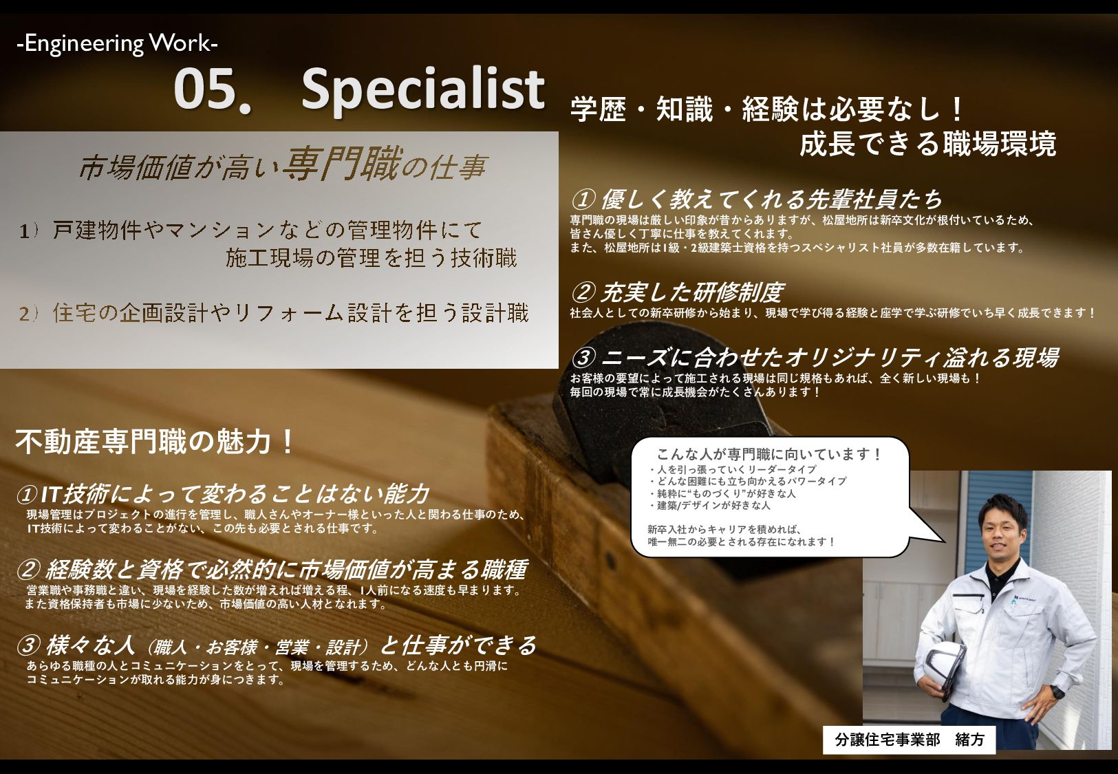 年2回(6月・12月) -休日休暇- 休日/週休2日制(水曜日、他1日) 夏季、冬季、GW(年間休日110日) 休暇/有給休暇、慶弔休暇 -待遇・福利厚生・社内制度- 社会保険完備、労働保険 交通費支給(社内規定による) 自社物件入居支援制度 午前休暇・午後休暇制度 教育・研修制度が充実 産休・育児休暇取得実績あり 平均残業時間が月20時間以内 社宅・家賃補助制度あり ‐グループ会社‐ 松屋ハウジング(株) 松屋不動産販売(株) (株)松屋住まいるパートナーズ (株)レントビズプラス (株)ライフクリエイト (有)ワンズホーム岡崎 ABOUT US Information -会社情報- 松屋地所株式会社 商号:松屋地所株式会社 設立年月日:昭和62年1月 代表者:代表取締役 本田 佑輔 資本金:3,000万円 従業員数:130名 (グループ全体) 売上高:41億4,800万円 (2020年9月期実績) 事業内容 賃貸仲介業、不動産仲介業、不動産売買業、建売分業事業 建築事業、不動産投資事業、不動産管理業、M&A事業 事業所 本社/〒441-8151 愛知県豊橋市曙町字南松原123番地 -募集職種- ◎賃貸仲介営業 ◎不動産売買営業(企画・開発) ◎不動産仲介営業 ◎注文住宅・分譲住宅営業 ◎建築設計 ◎施工管理 ◎不動産管理 ◎経理・総務事務 -勤務候補地- ・豊橋市 ・豊川市 ・岡崎市 ・豊田市 ・浜松市 ・磐田市 ※本人が希望しない限り、 引越しを伴う異動はありません。 -仕事内容- ≪賃貸仲介営業≫ 「ホームメイトFC」および自社ブランド「住ま なび」の各店舗で、お客様の住居探しのお手伝 いを行います。新生活にむけて基盤となる「お 部屋」を提供し、快適な暮らしのサポートを行 います。 ≪不動産売買仲介営業≫ 土地・建物を売りたい人、買いたい人を結びつ けるお仕事です。新築戸建、中古戸建、マン ションなど取り扱う商品は様々です。お客様の 「夢」や「希望」の架け橋になる仕事です。 ≪注文住宅営業≫ お客様一人ひとりと向き合いながら、理想の住 まいをゼロから企画・提案し、 作り上げる仕事です。 ≪分譲住宅営業≫ 土地の仕入れから住宅のプラン作り・販売戦略 作りを経て、お客様へ完成した物件を引き渡す までの幅広い業務を行います。 ≪住宅リフォーム営業≫ 住宅のリフォームを専門とする業務です。お客 様へのご提案から施工までの 全てに携わります。 ≪不動産管理営業≫ オーナー様が所有する賃貸アパートやマンショ ンの経営サポートを行います。 入居者様のお困りごとの解決、古い建物をリノ ベーションして賃貸住宅にするための企画も行 います。 ≪事務職≫ 総務・人事・労務・経理など、会社の円滑な運 営を支える業務です。 ≪建築・設計≫ 住宅や施設の設計図面の作成や建築確認申請を 行う業務です。新築物件だけでなく、中古物件 のリノベーションの企画・設計も行います。 ≪施工・管理≫ 建築現場での「予算・工程・安全・品質」のマ ネージネントを行い、住宅づくりの現場を支え ます。