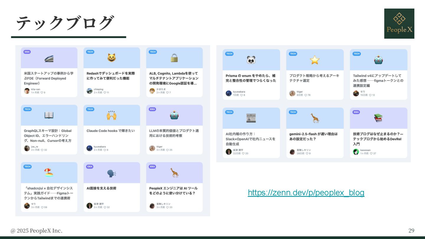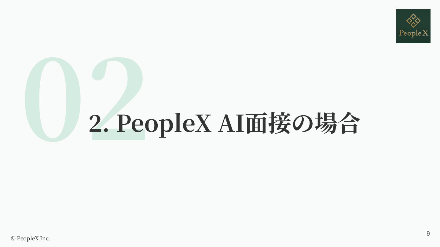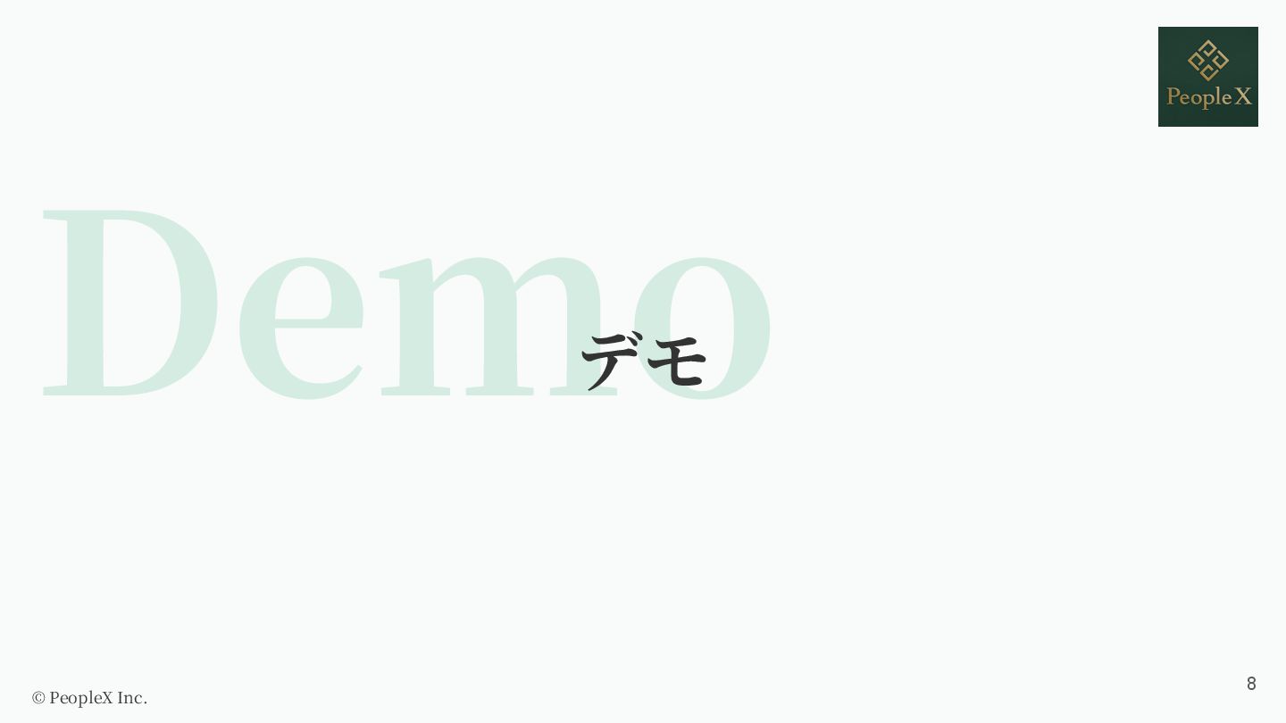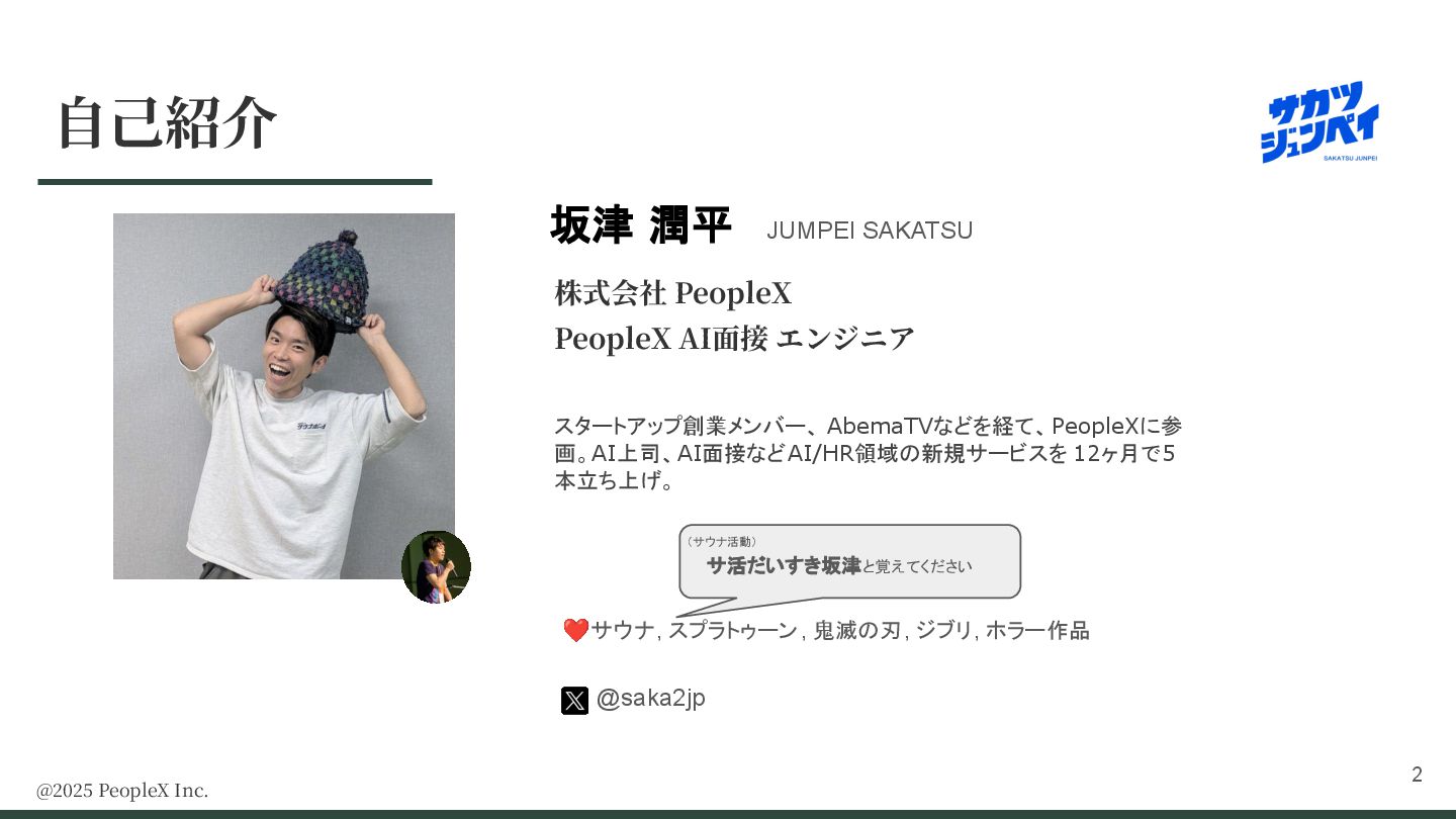 1. ⾃⼰紹介 株式会社 PeopleX PeopleX AI⾯接 エンジニア スタートアップ創業メンバー、 AbemaTVなどを経て、PeopleXに参 画。AI上司、AI面接などAI/HR領域の新規サービスを 12ヶ月で5