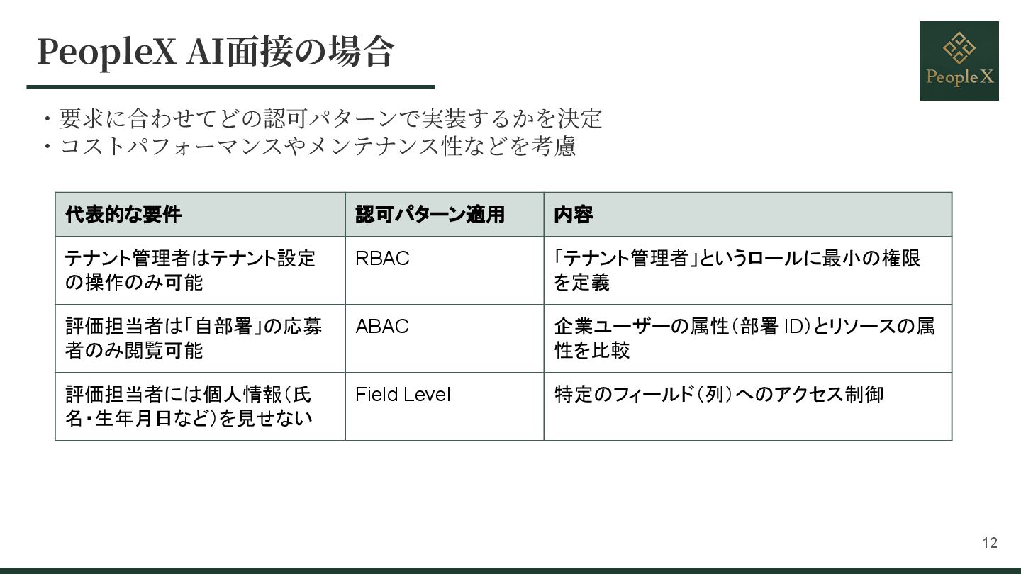 6. PeopleX AI⾯接の場合 ・要求に合わせてどの認可パターンで実装するかを決定 ・コストパフォーマンスやメンテナンス性などを考慮 代表的な要件 認可パターン適用 内容 テナント管理者はテナント設定 の操作のみ可能 RBAC