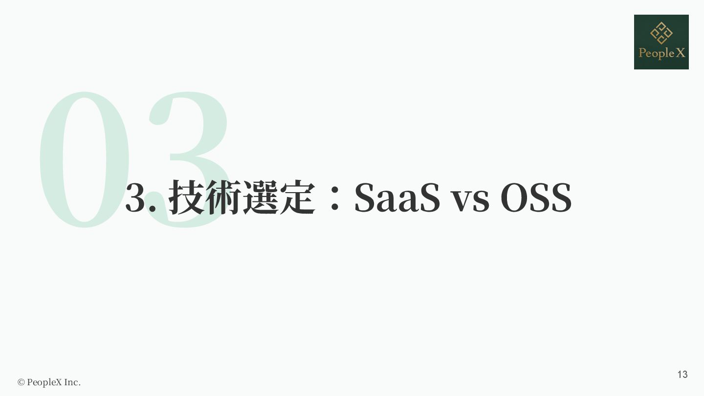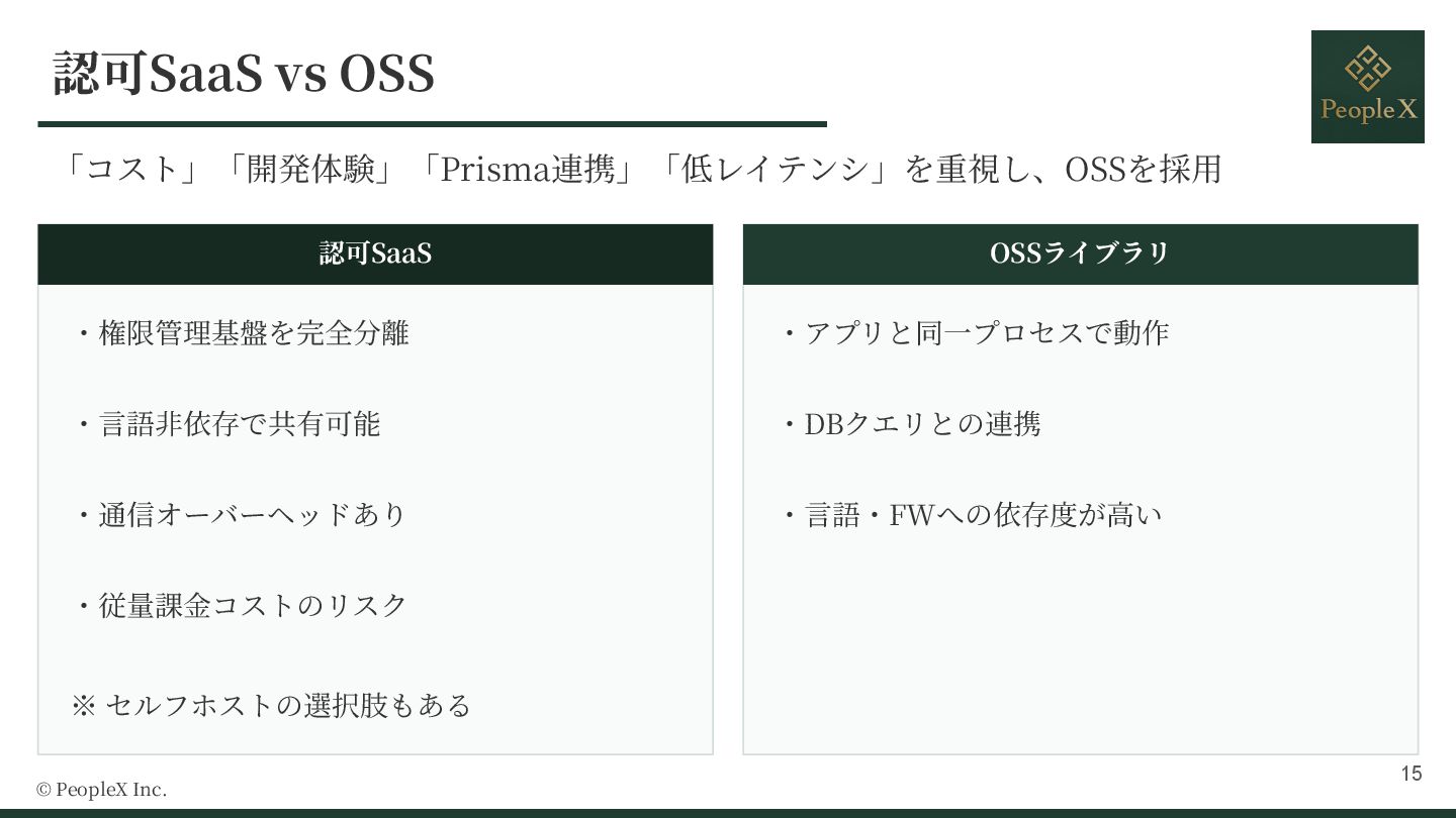 セルフホストの選択肢もある OSSライブラリ ・アプリと同⼀プロセスで動作 ・DBクエリとの連携 ・⾔語・FWへの依存度が⾼い © PeopleX Inc. 15
