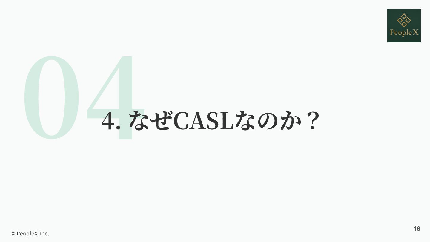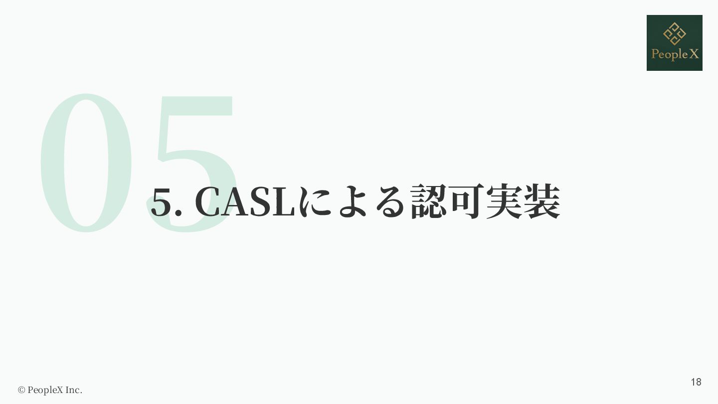 OSSライブラリ 4 なぜCASLなのか? 5 CASLによる認可実装 6 実際に導⼊・運⽤してみた感想 © PeopleX Inc. 4