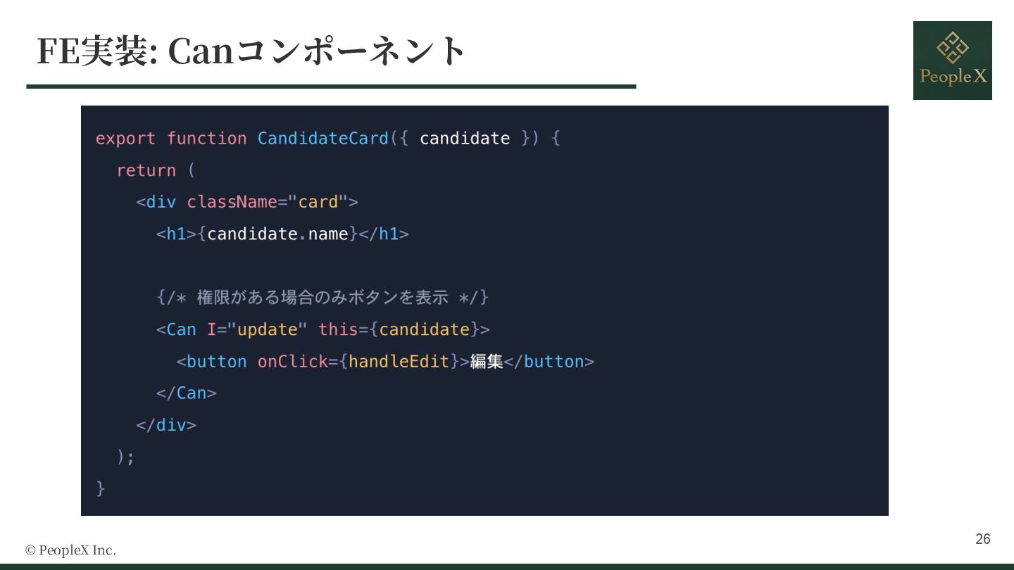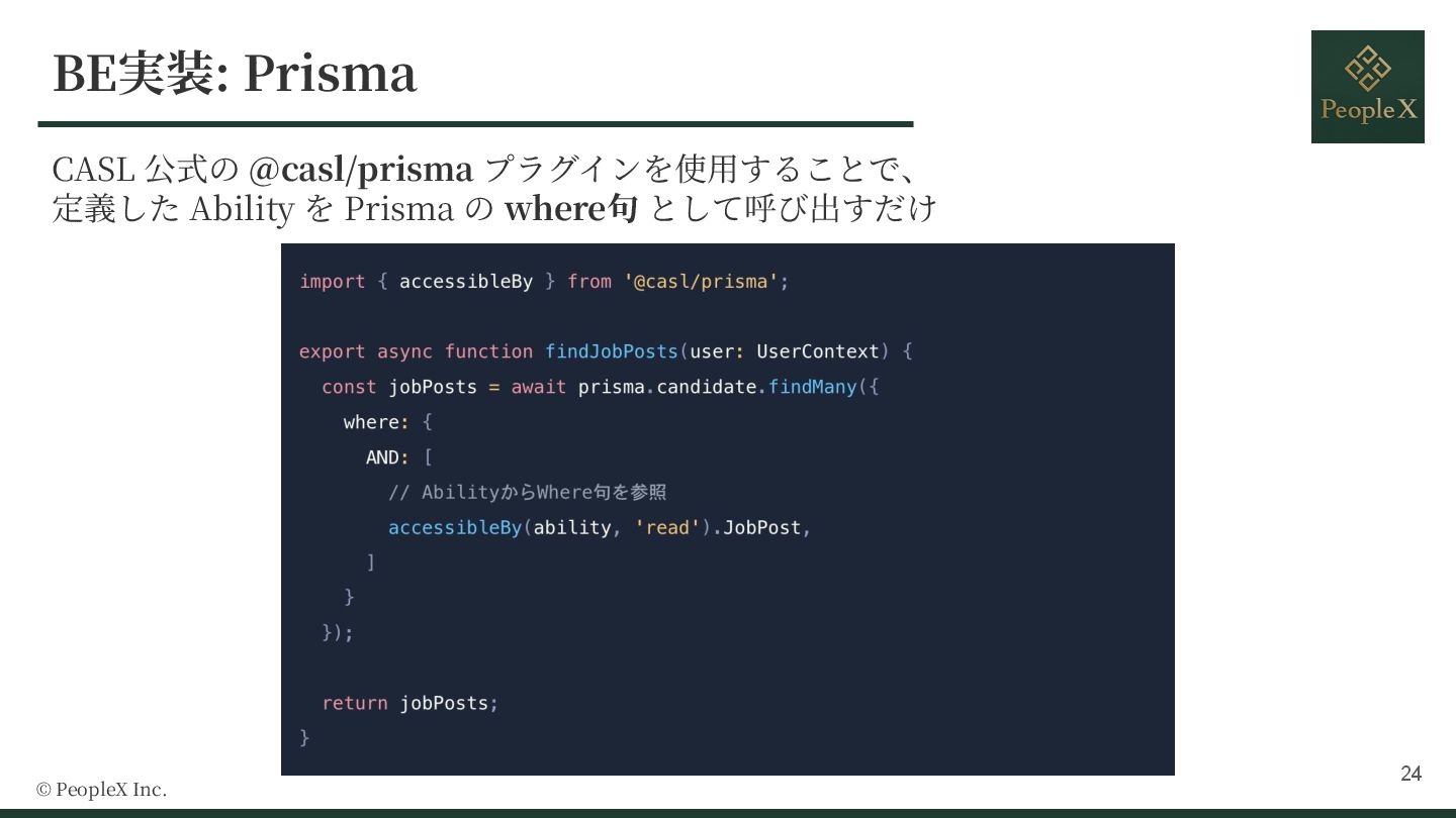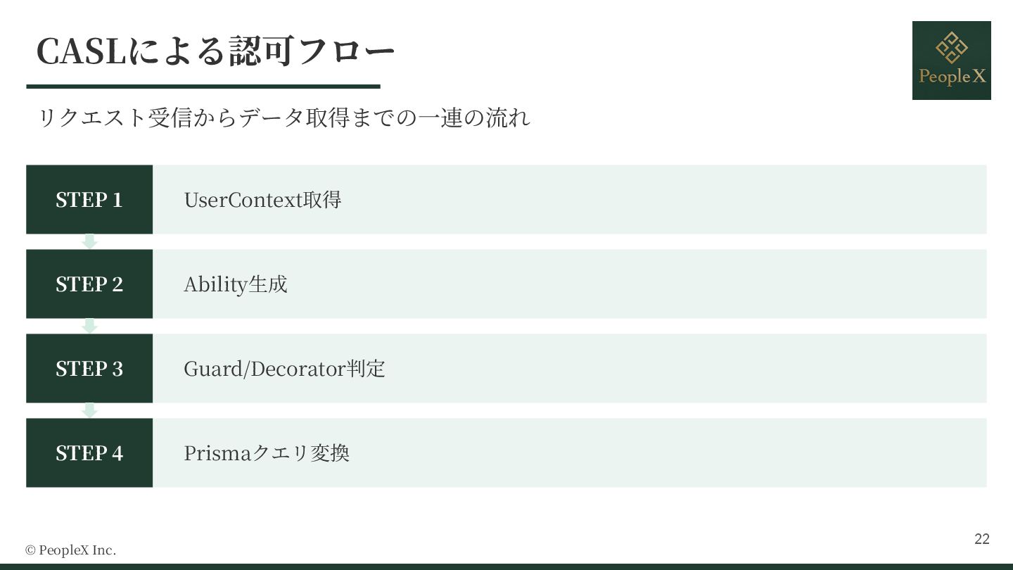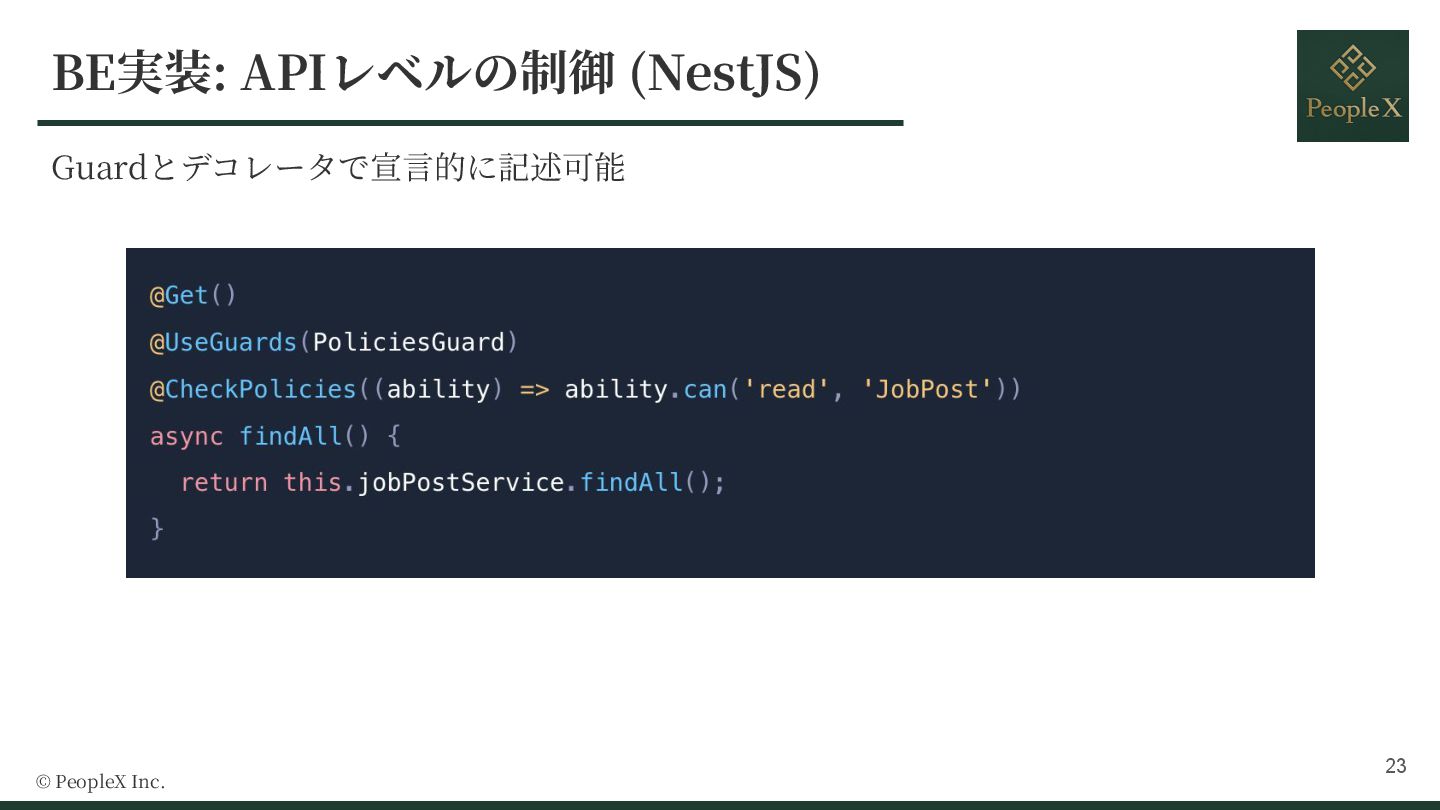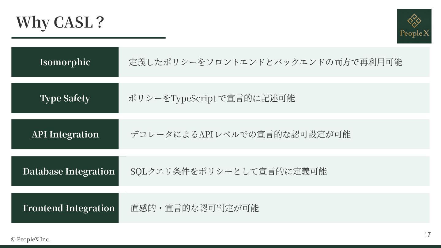 9. Why CASL? © PeopleX Inc. Type Safety Isomorphic 定義したポリシーをフロントエンドとバックエンドの両⽅で再利⽤可能 Type