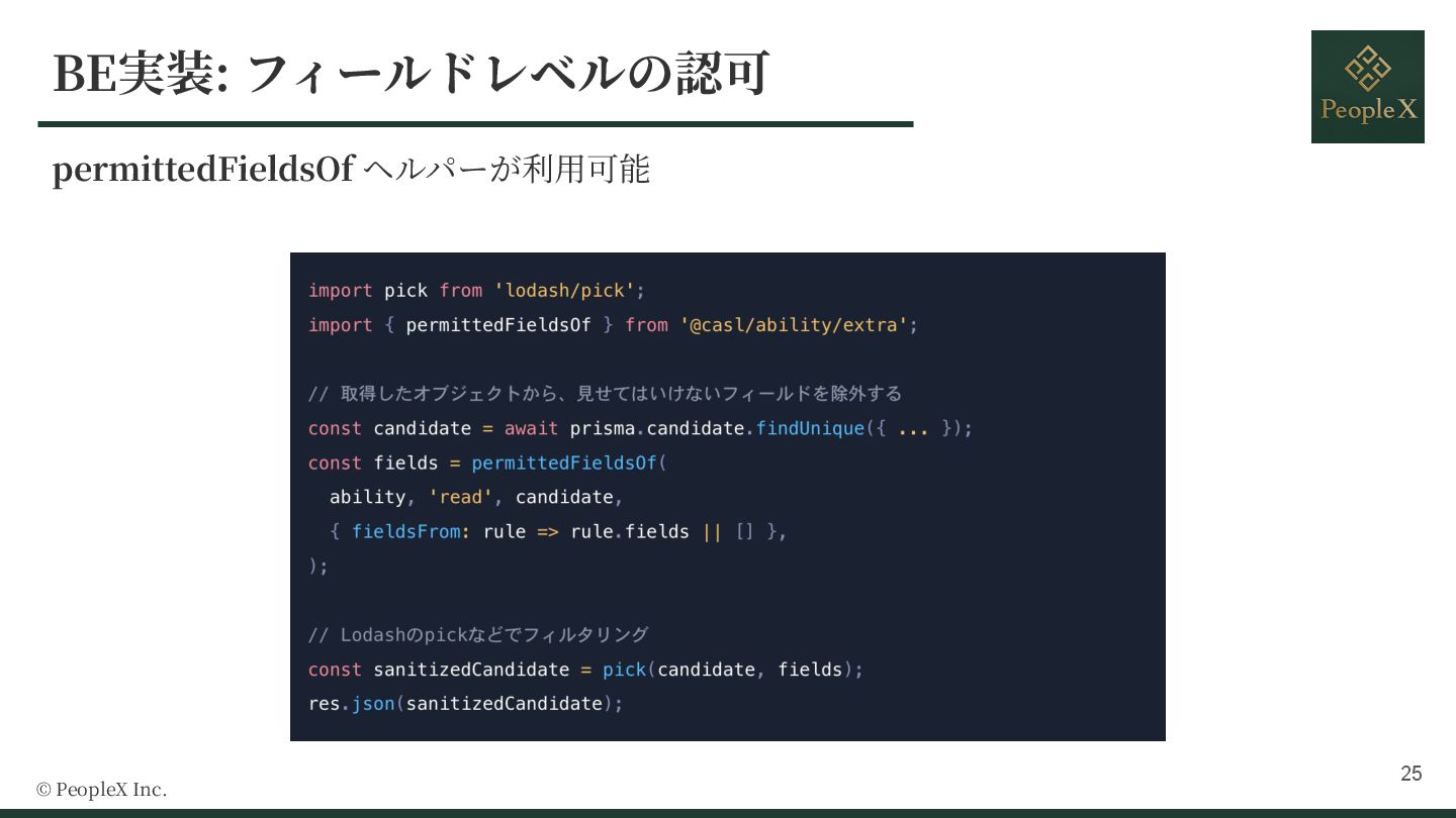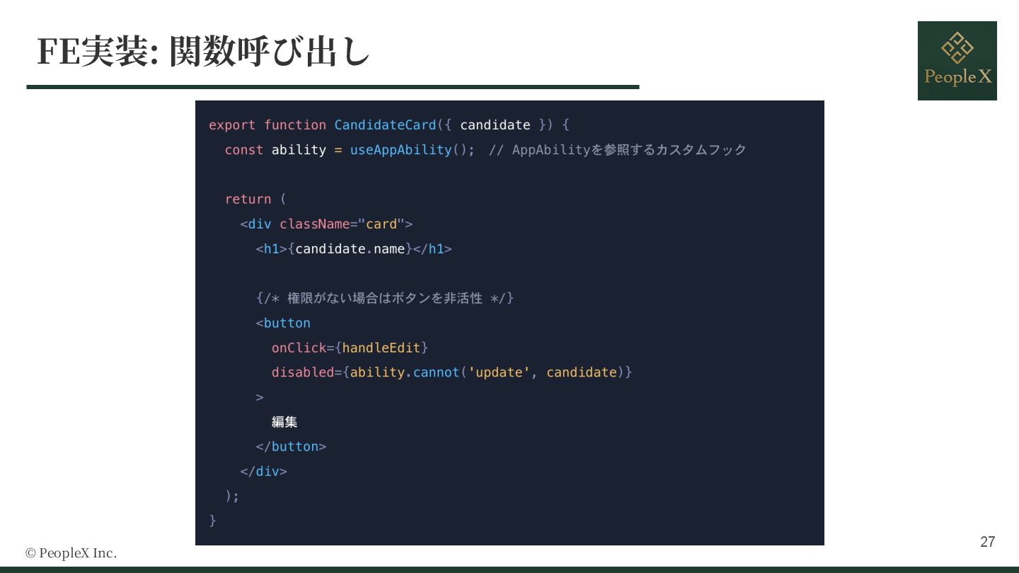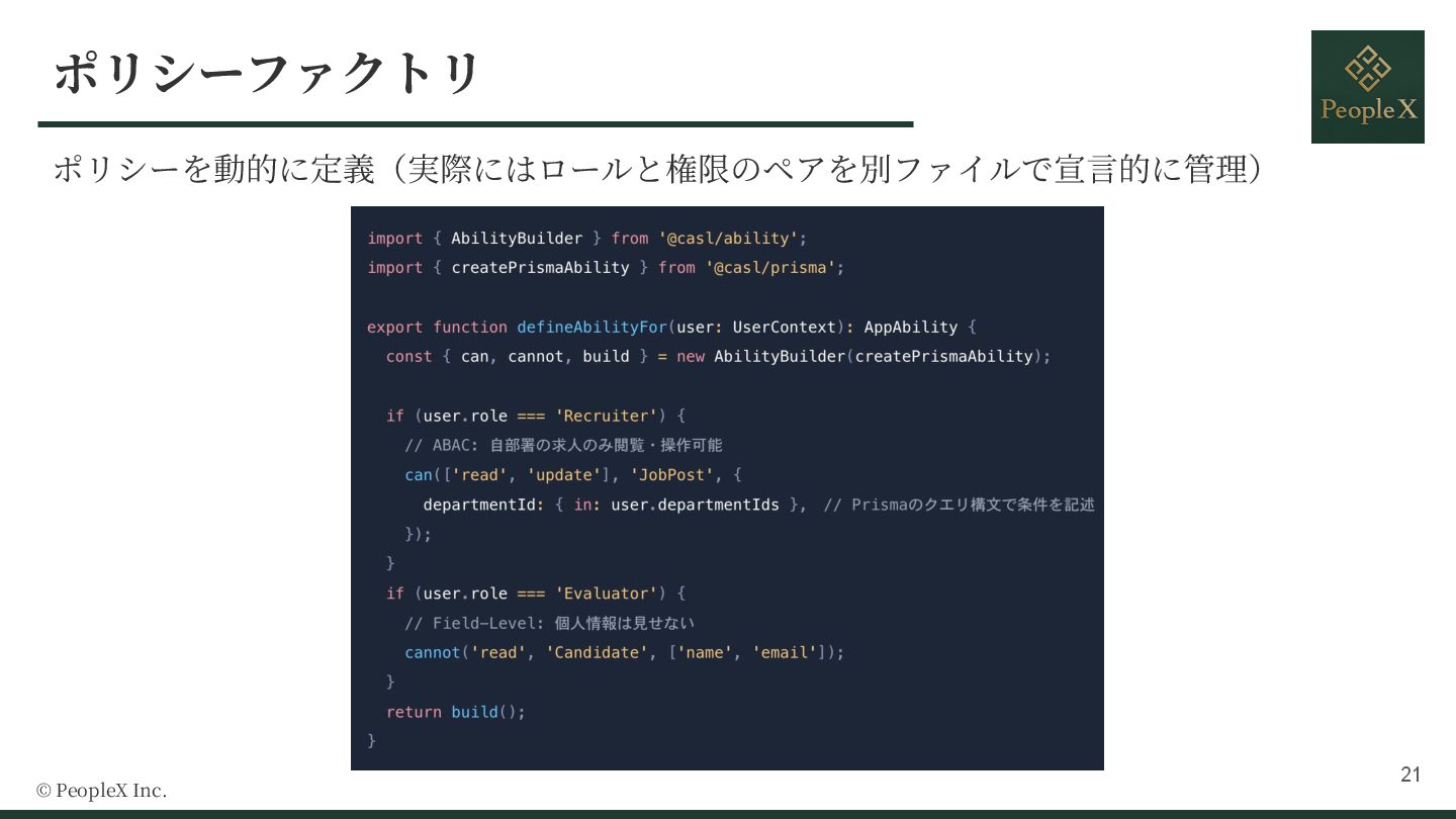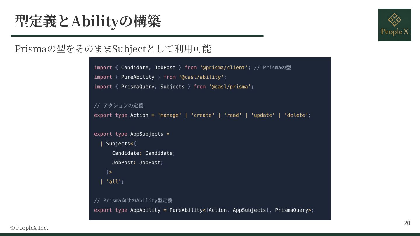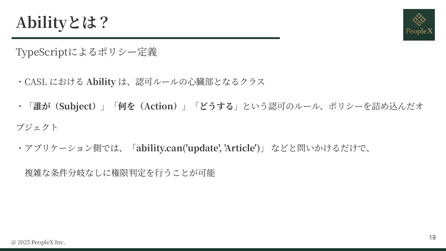 10. @ 2025 PeopleX Inc. ・CASL における Ability は、認可ルールの⼼臓部となるクラス ・「誰が(Subject)」「何を(Action)」「どうする」という認可のルール、ポリシーを詰め込んだオ ブジェクト