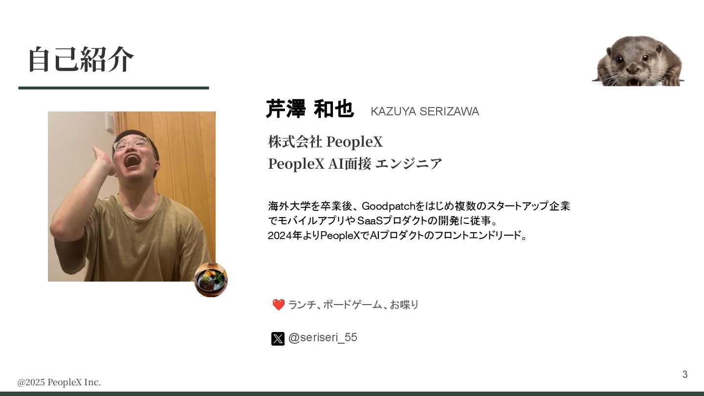 2024年よりPeopleXでAIプロダクトのフロントエンドリード。 @2025 PeopleX Inc. 芹澤 和也 KAZUYA SERIZAWA ❤ ランチ、ボードゲーム、お喋り @seriseri_55 3