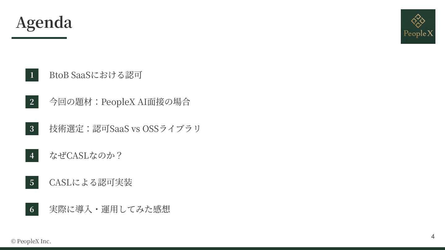 3. Agenda 1 BtoB SaaSにおける認可 2 今回の題材:PeopleX AI⾯接の場合 3 技術選定:認可SaaS vs