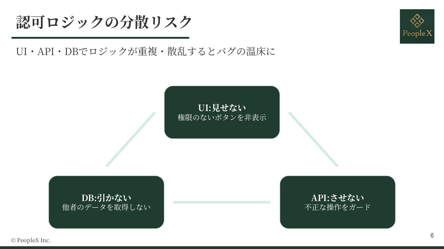 アプリの認可は、UIでの「見せない」とAPIでの「させない」が分断されがちです。本セッションでは、認可ライブラリCASLを用いて、フロントエンドとバックエンドで同一ポリシーを共有し、RBAC+ABAC(属性ベース)のハイブリッド設計を型安全に運用する方法を紹介します。