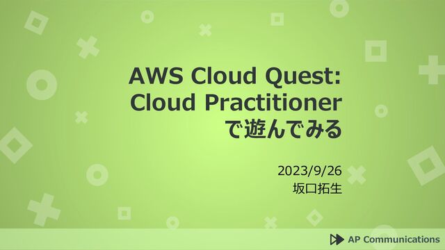 to give presentations. You can find me at @username 2 自己紹介 名前 坂口拓生 (さかぐちたくみ) 会社 エーピーコミュニケーションズ AWS歴 5年~ (2年目) AWS認定資格 Associate 3種、Professional 1種、 Specialty 4種