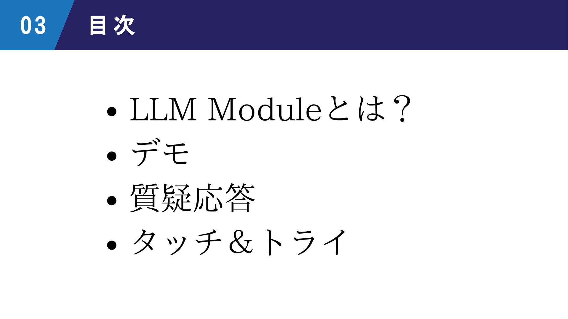 目次 03 LLM Moduleとは? デモ 質疑応答 タッチ&トライ