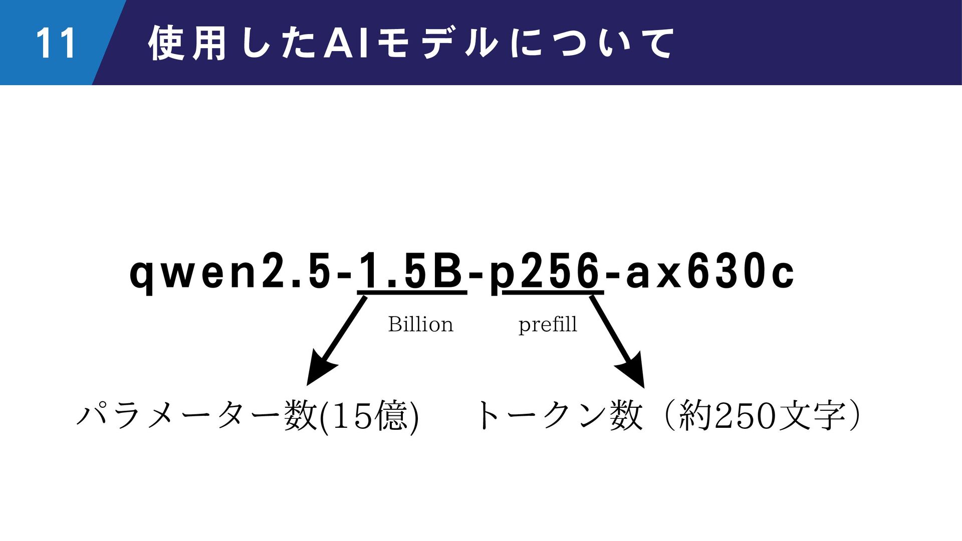 qwen2.5-1.5B-p256-ax630c 使用したAIモデルについて 11 パラメーター数(15億) トークン数(約250文字) Billion prefill