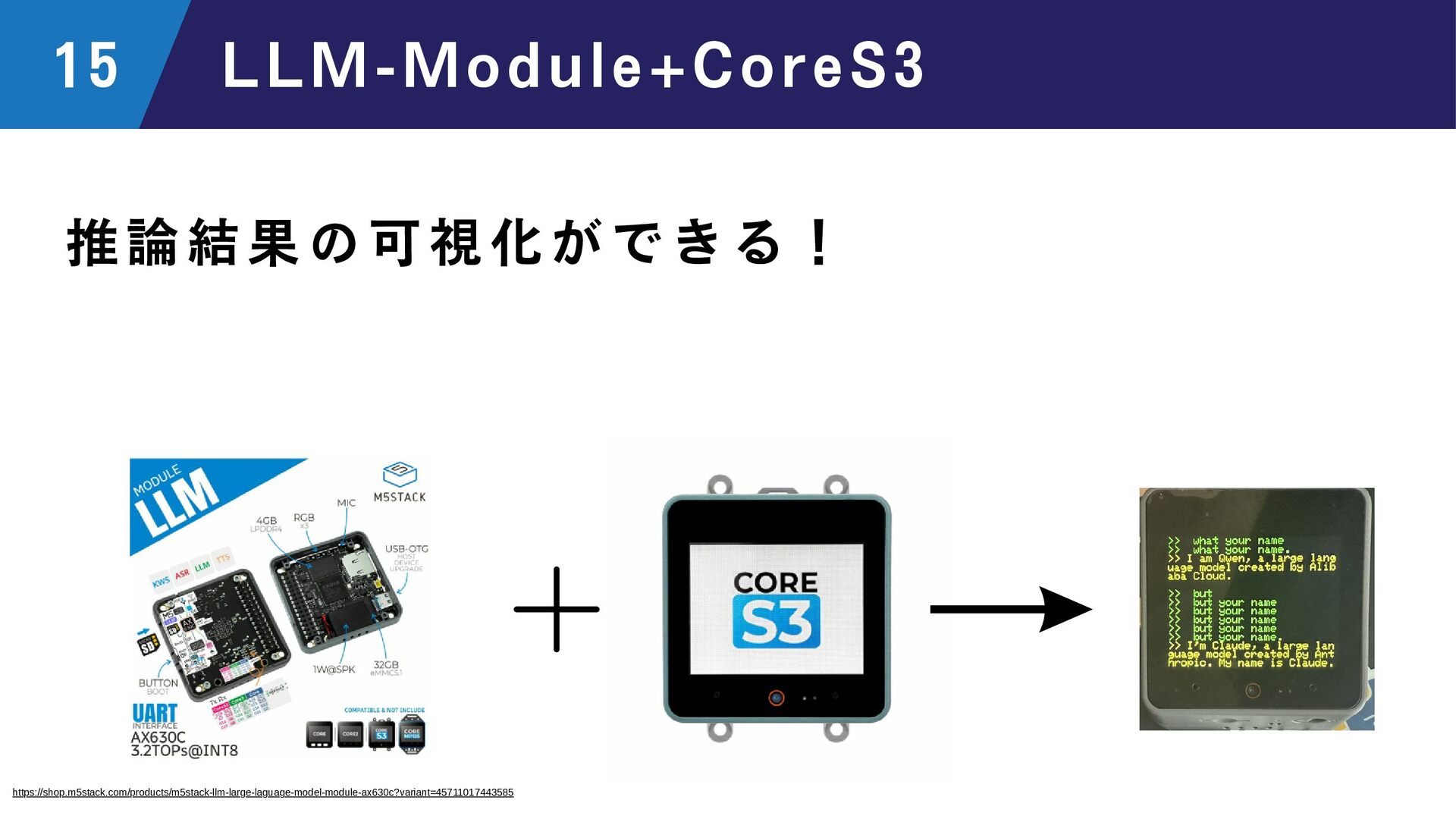 LLM-Module+CoreS3 15 推論結果の可視化ができる! https://shop.m5stack.com/products/m5stack-llm-large-laguage-model-module-ax630c?variant=45711017443585