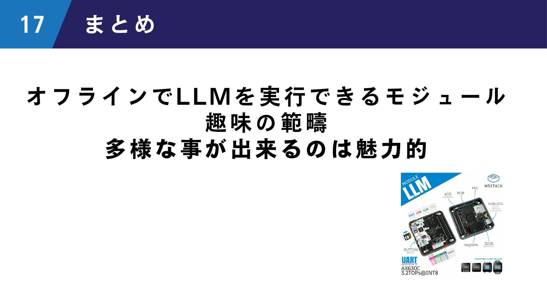 まとめ 17 オフラインでLLMを実行できるモジュール 趣味の範疇 多様な事が出来るのは魅力的
