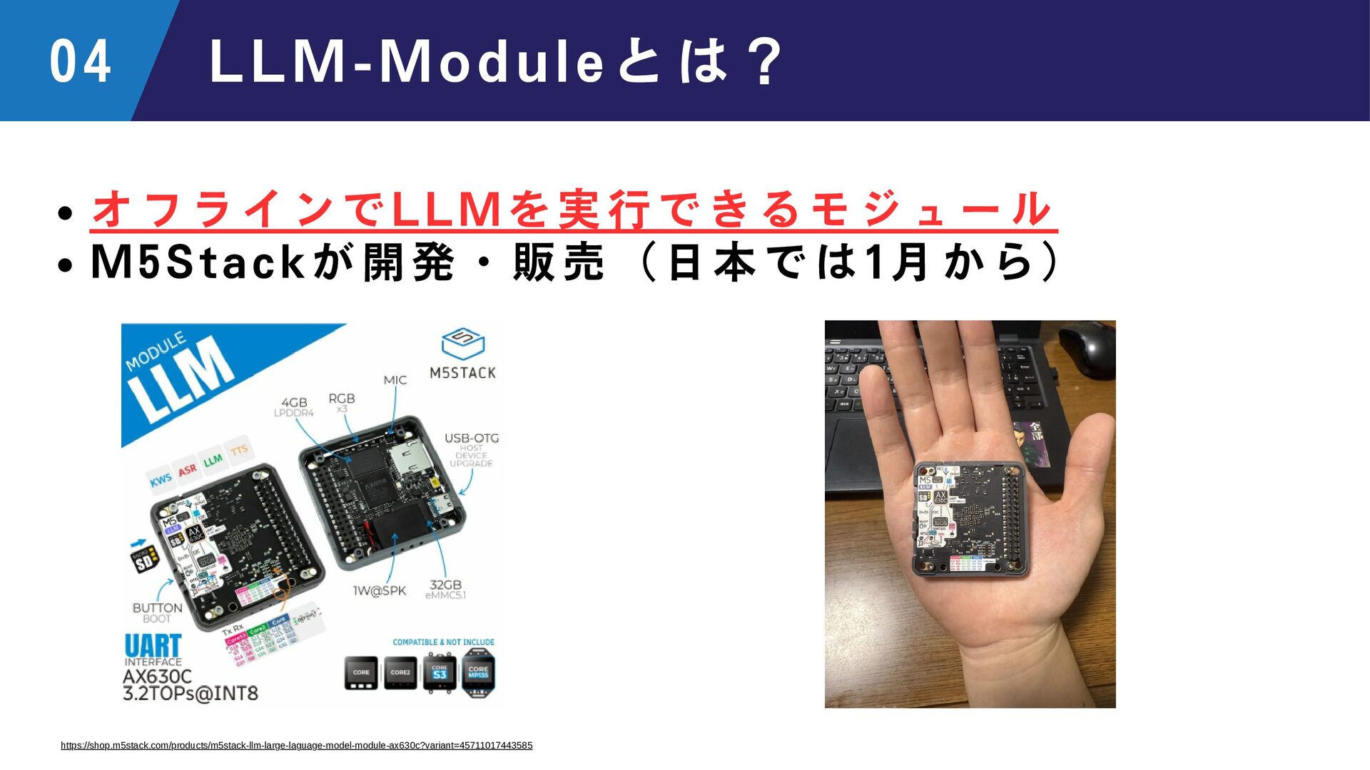 LLM-Moduleとは? 04 オフラインでLLMを実行できるモジュール M5Stackが開発・販売(日本では1月から) https://shop.m5stack.com/products/m5stack-llm-large-laguage-model-module-ax630c?variant=45711017443585
