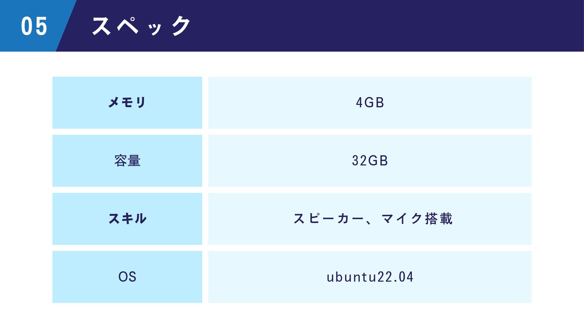 メモリ 4GB 容量 32GB スキル スピーカー、マイク搭載 OS ubuntu22.04 スペック 05