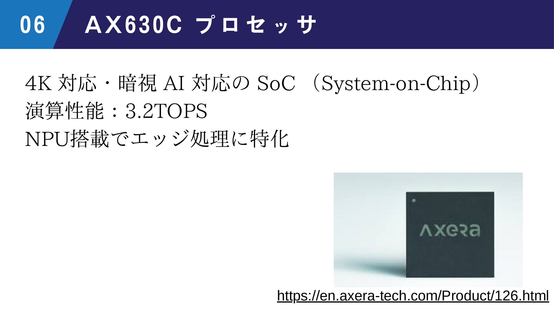 AX630C プロセッサ 06 https://en.axera-tech.com/Product/126.html 4K 対応・暗視 AI 対応の SoC (System-on-Chip)