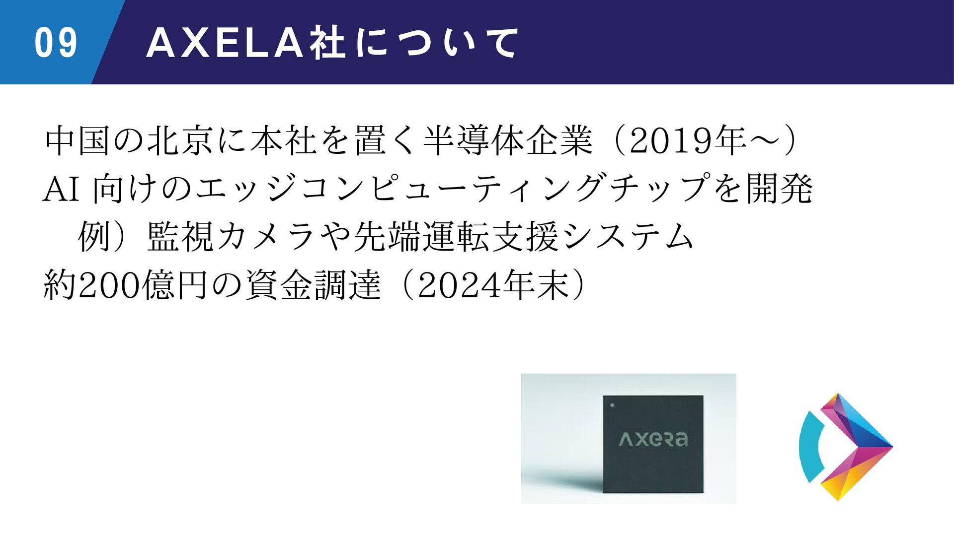 AXELA社について 09 中国の北京に本社を置く半導体企業(2019年~) AI 向けのエッジコンピューティングチップを開発 例)監視カメラや先端運転支援システム 約200億円の資金調達(2024年末)