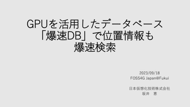 2023/09/18 福井市で開催された「FOSS4G Japan @ FUKUI」での、日本仮想化技術株式会社の発表枠『GPUを活用したデータベース「爆速DB」で位置情報も爆速検索』の発表資料です。 元のプレゼン資料にはデモ動画が2枚含まれていましたが、このサイトでは動画が見られないかもしれません。