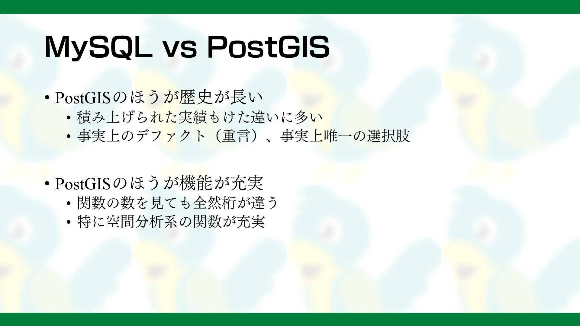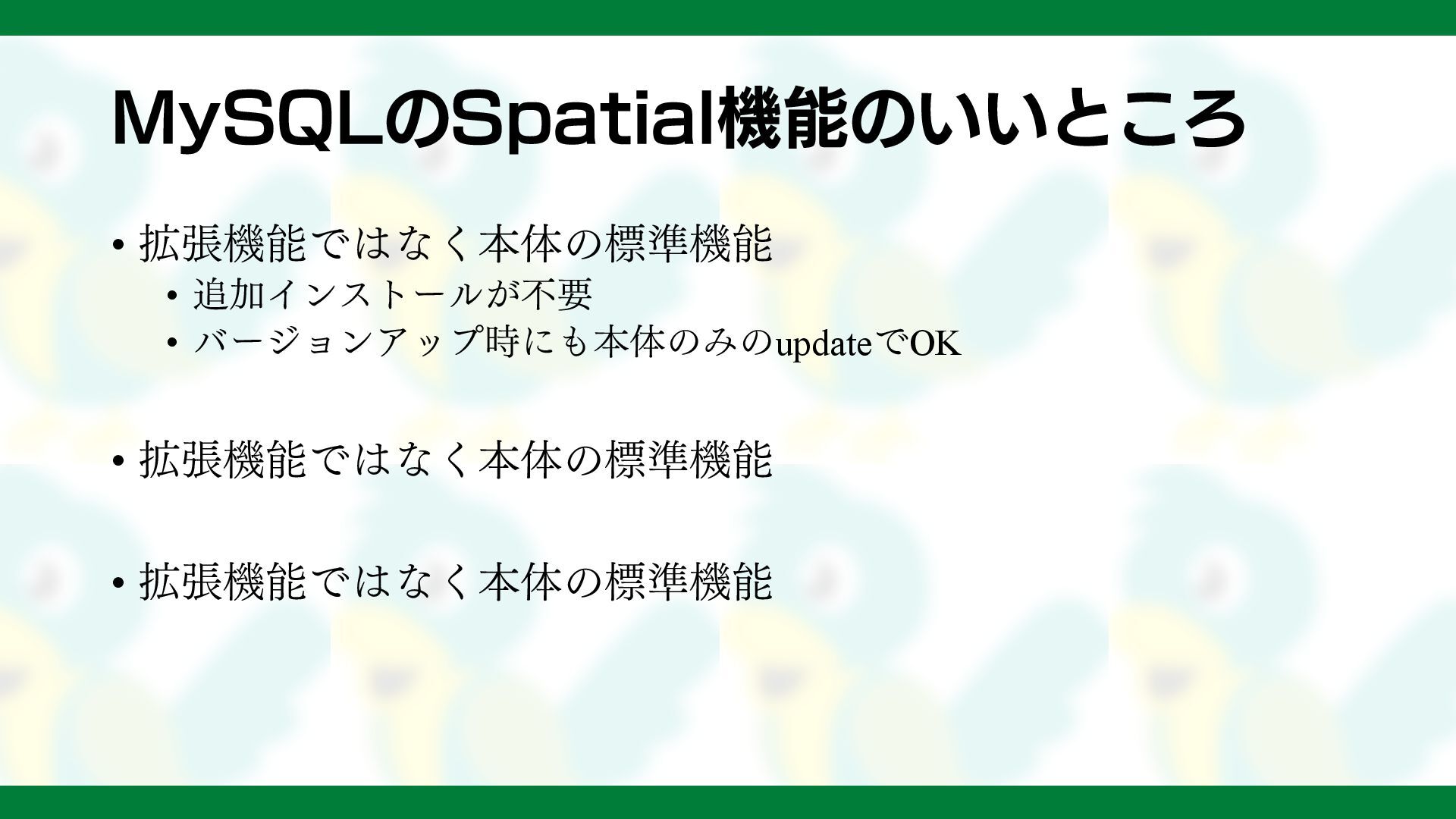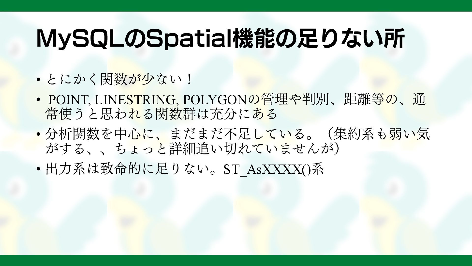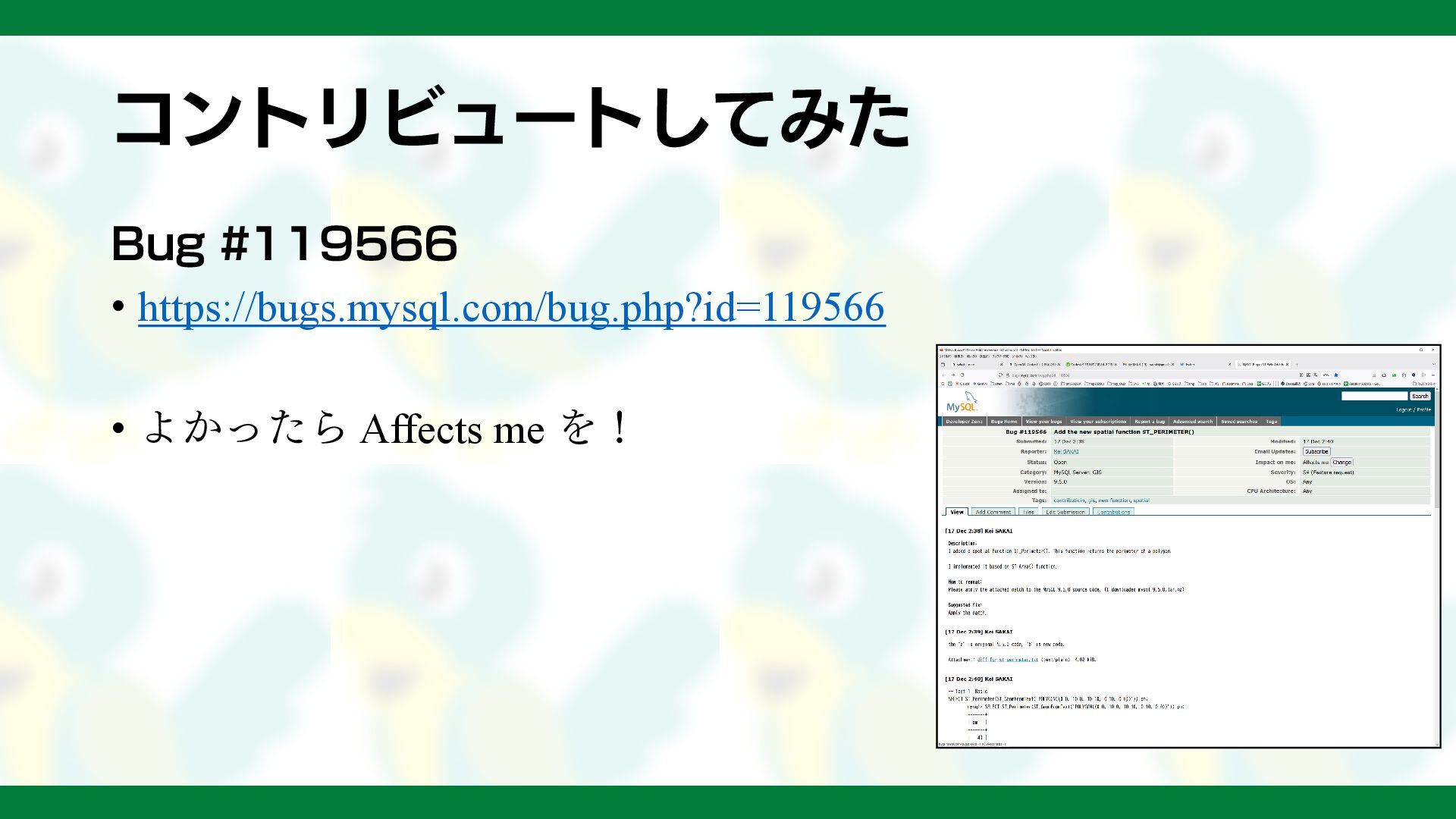 MySQLのGIS関数は PostGISに比べてまだまだ不足しています。 不足しているなら増やせばいいじゃない! ということで関数追加に挑戦したお話を紹介しました。 本家にコントリビュート出してみたのですが、なかなか取り込まれる(というかそもそも確認してもらった)様子は見られません。