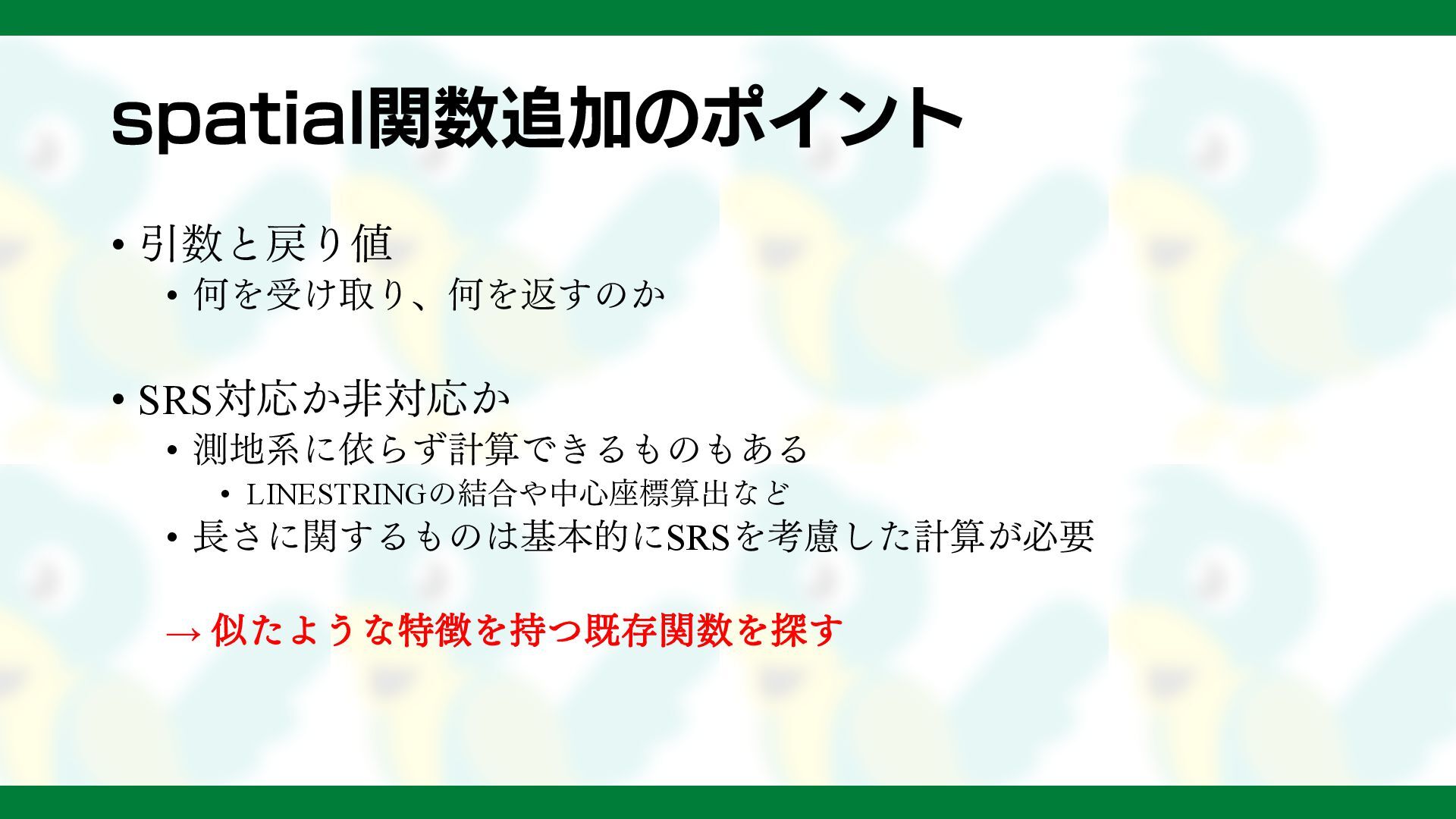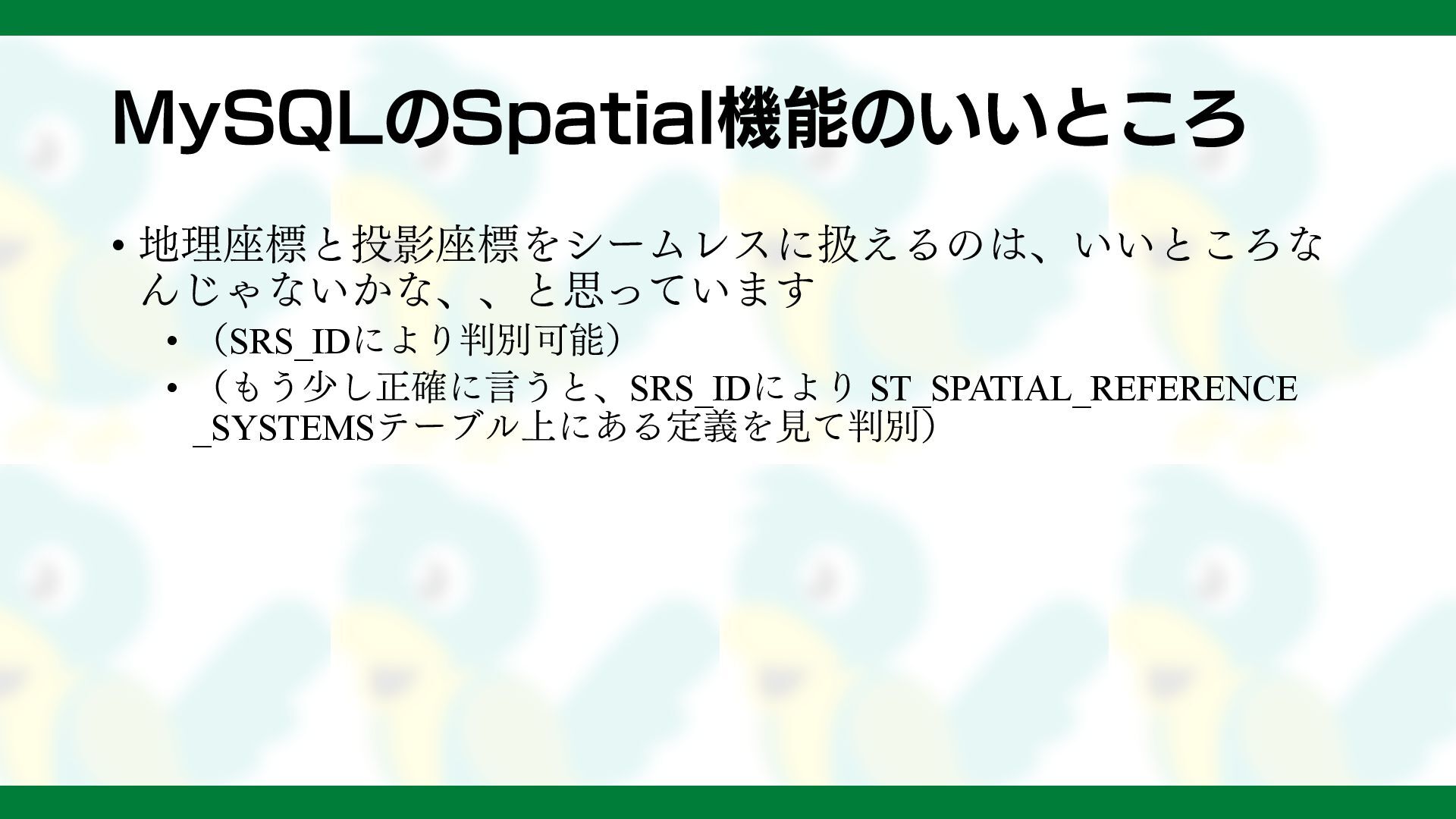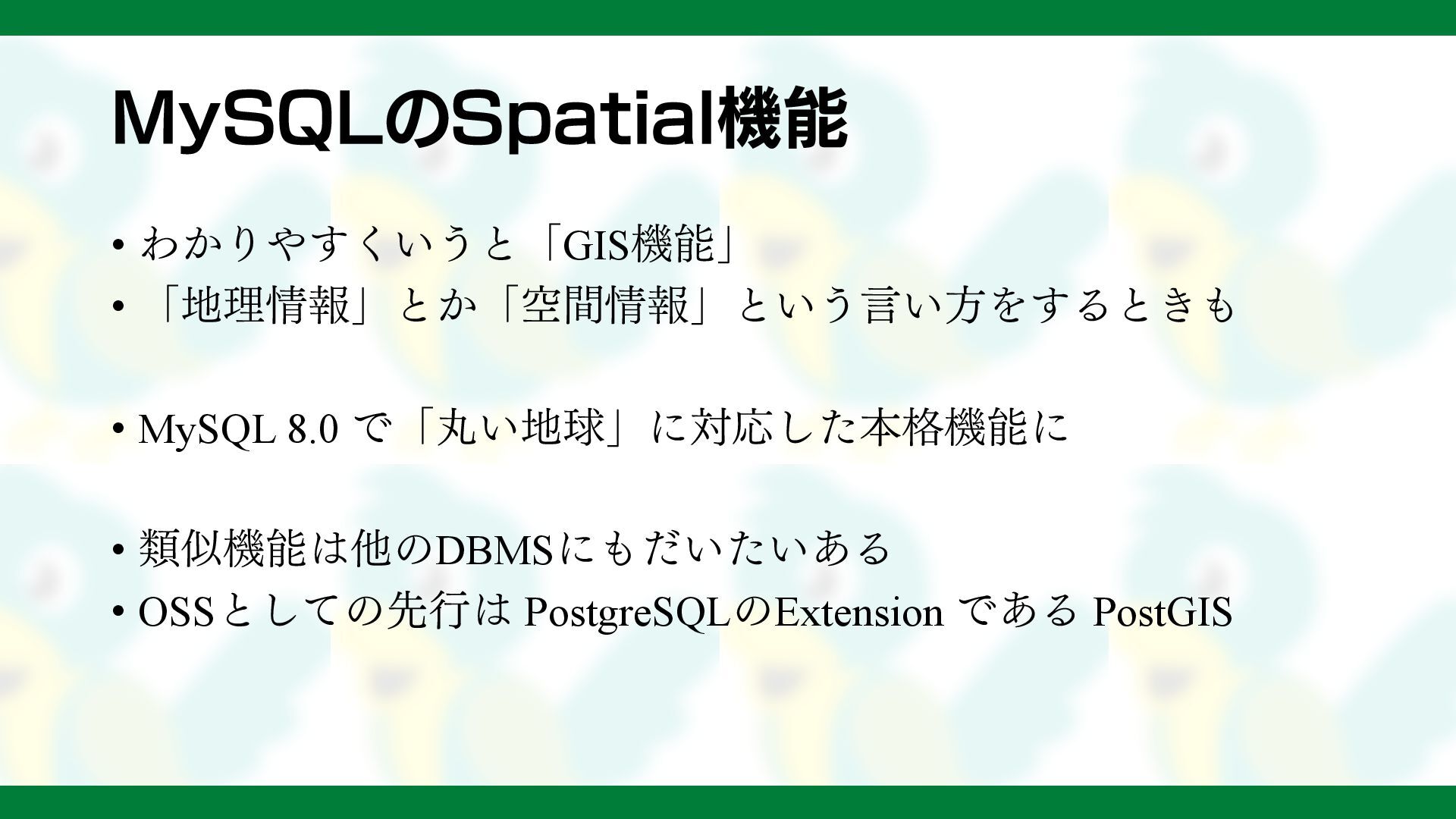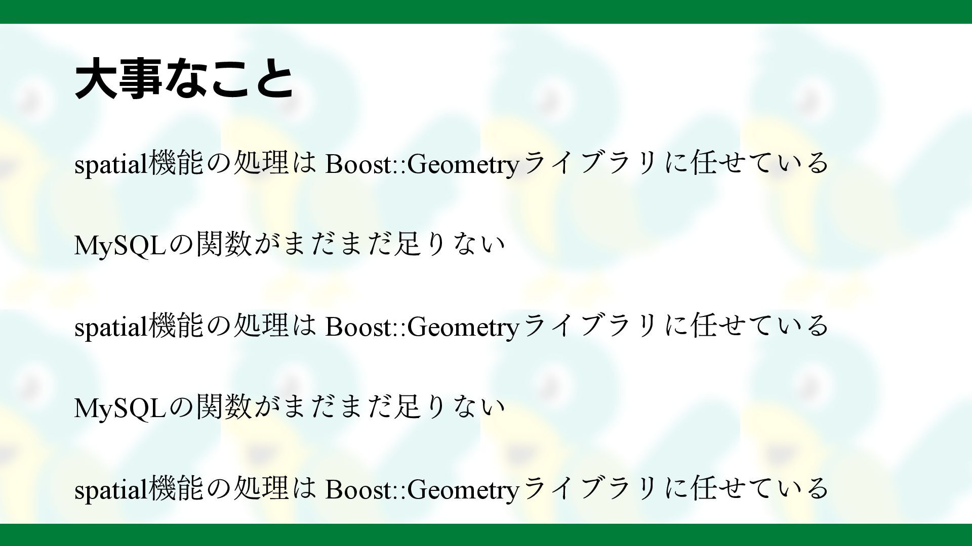 MySQLのGIS関数は PostGISに比べてまだまだ不足しています。 不足しているなら増やせばいいじゃない! ということで関数追加に挑戦したお話を紹介しました。 本家にコントリビュート出してみたのですが、なかなか取り込まれる(というかそもそも確認してもらった)様子は見られません。