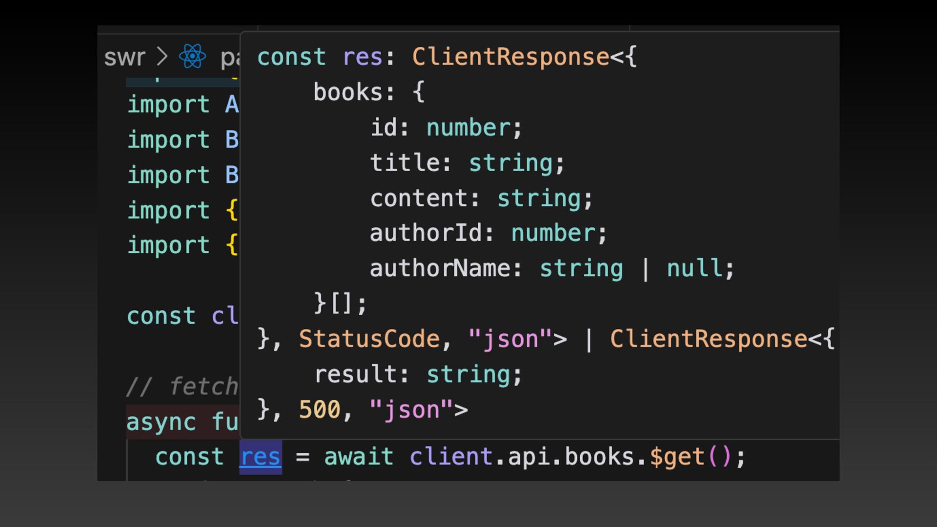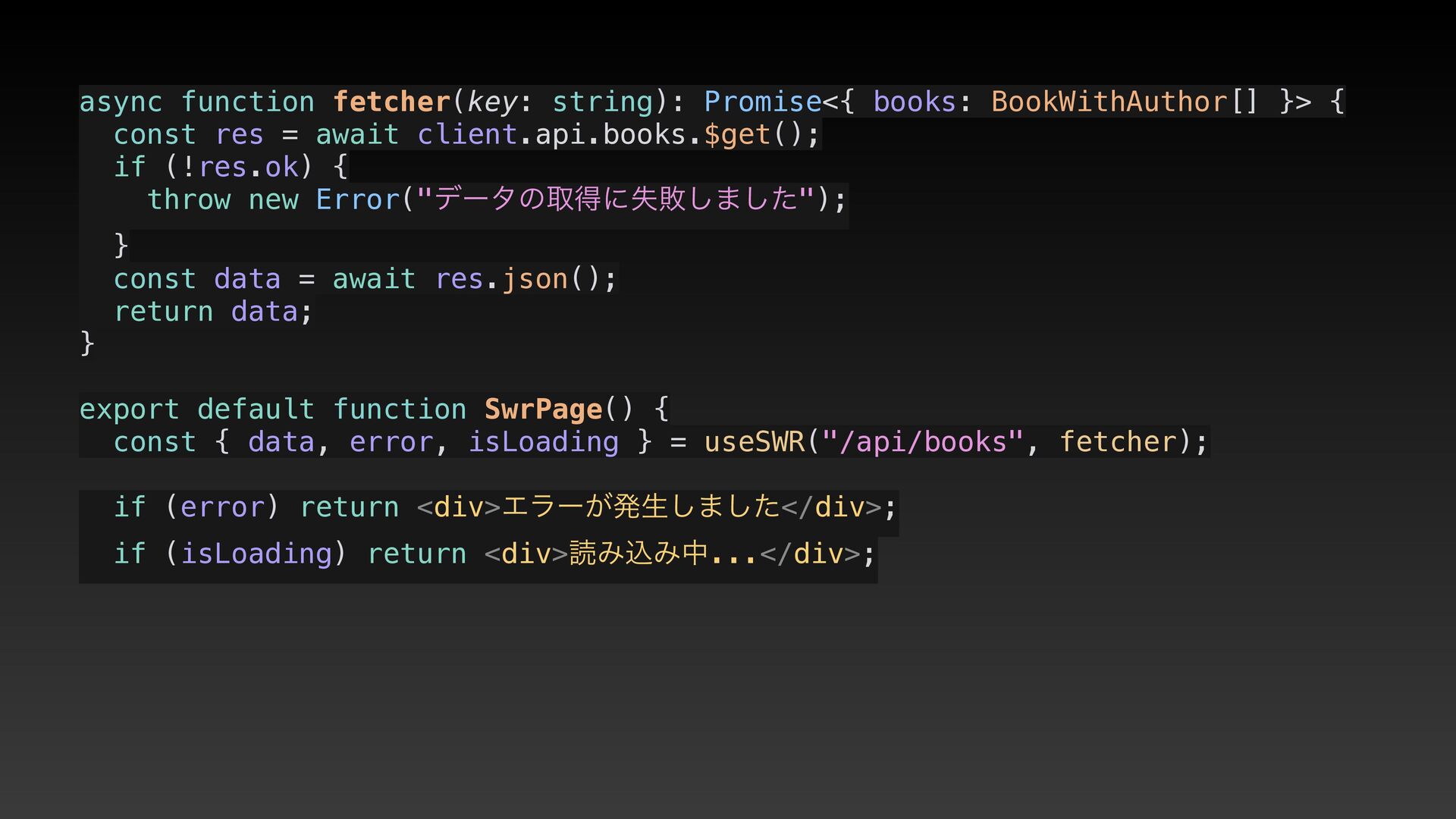 res = await client.api.books.$get(); if (!res.ok) { throw new Error("σʔλͷऔಘʹࣦഊ͠·ͨ͠"); } const data = await res.json(); return data; } export default function SwrPage() { const { data, error, isLoading } = useSWR("/api/books", fetcher); if (error) return <div>Τϥʔ͕ൃੜ͠·ͨ͠</div>; if (isLoading) return <div>ಡΈࠐΈத...</div>;